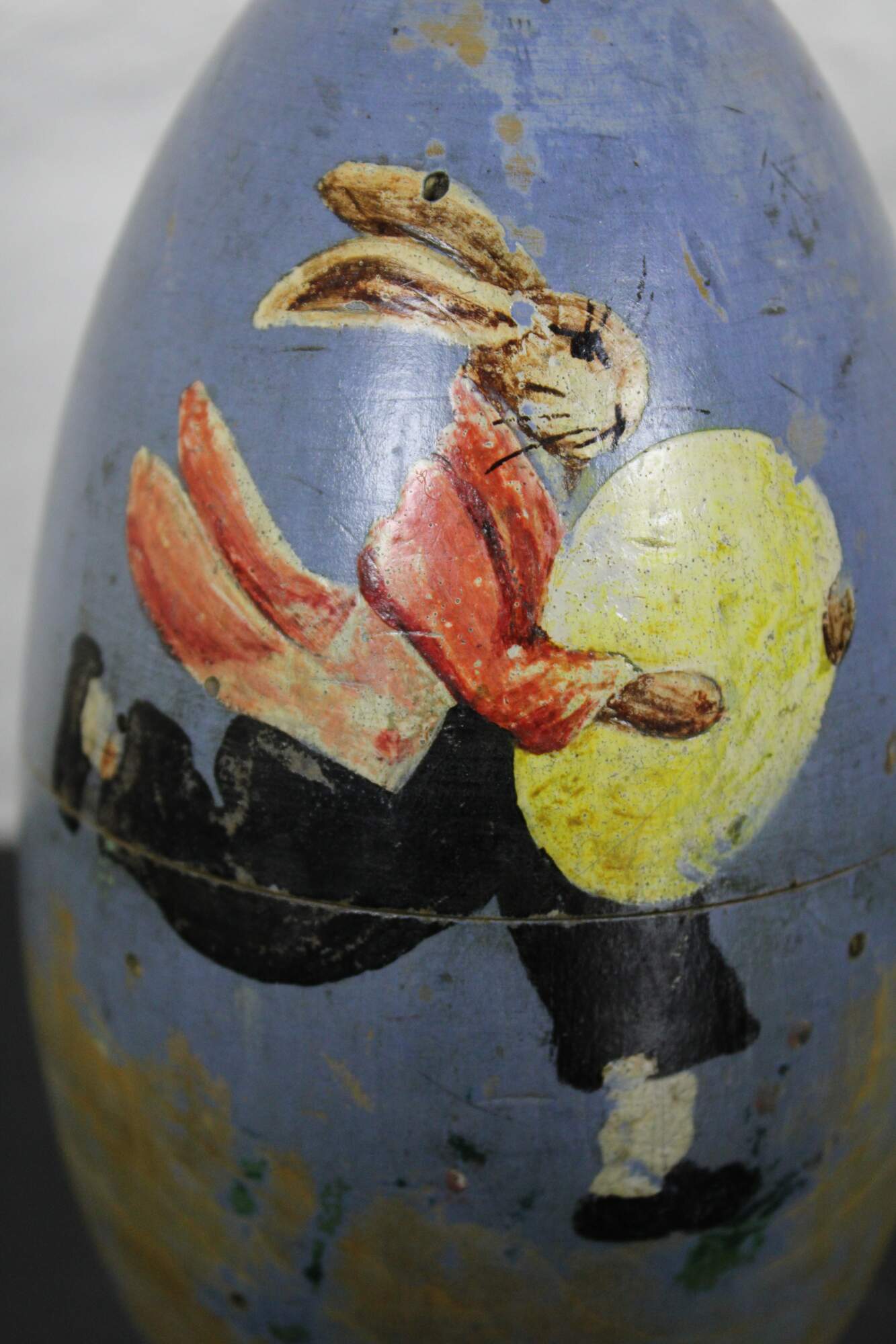 Vintage folk art style carved wooden egg shaped trinet box, painted blue with the image of an Easter Bunny running with a large yellow egg.