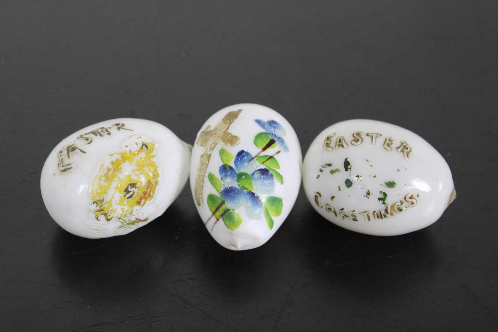 Lot of 24 assorted antique Victorian milk glass eggs, 13 plain/paint worn away, and 11 painted and/or embossed with raised designs, all aprroximately the size of real chicken eggs.
