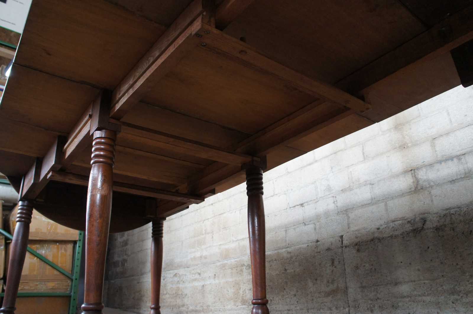 Fair condition, wear and distressing commensurate with age and use, finish loss, fading, rubbing, past repair to edge, leaves slightly wider than table, gap when no leaves inserted due to skirt being longer.