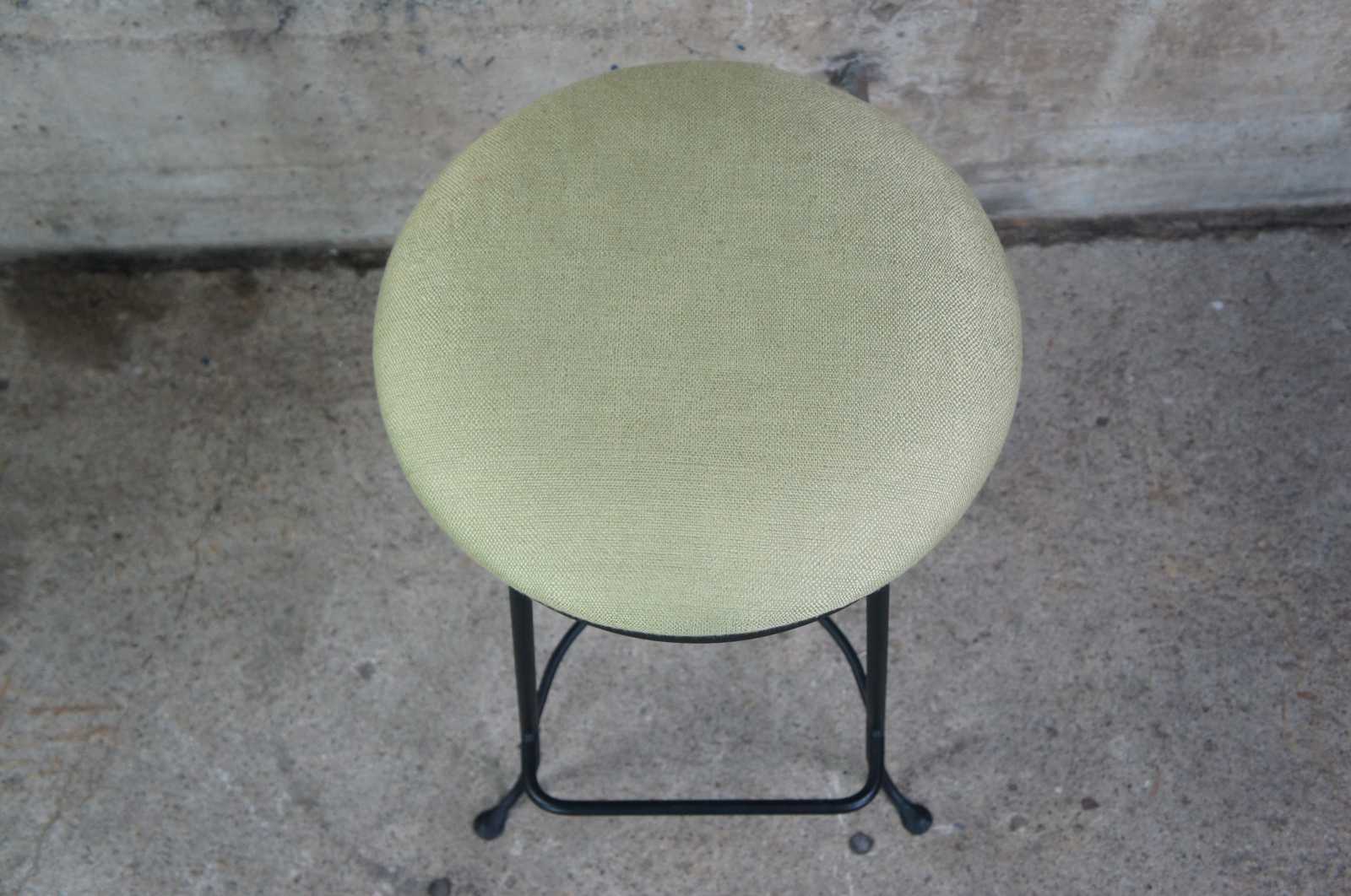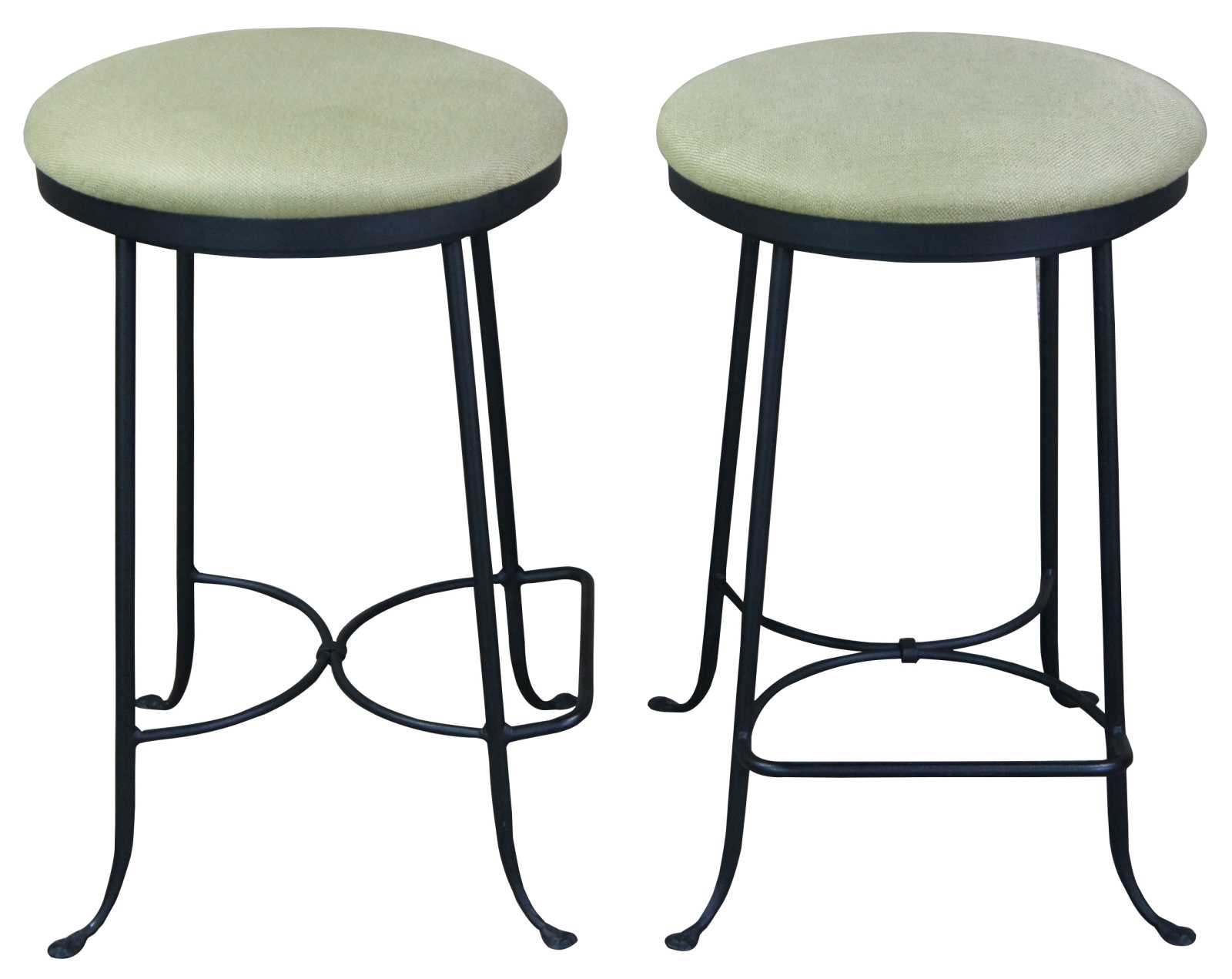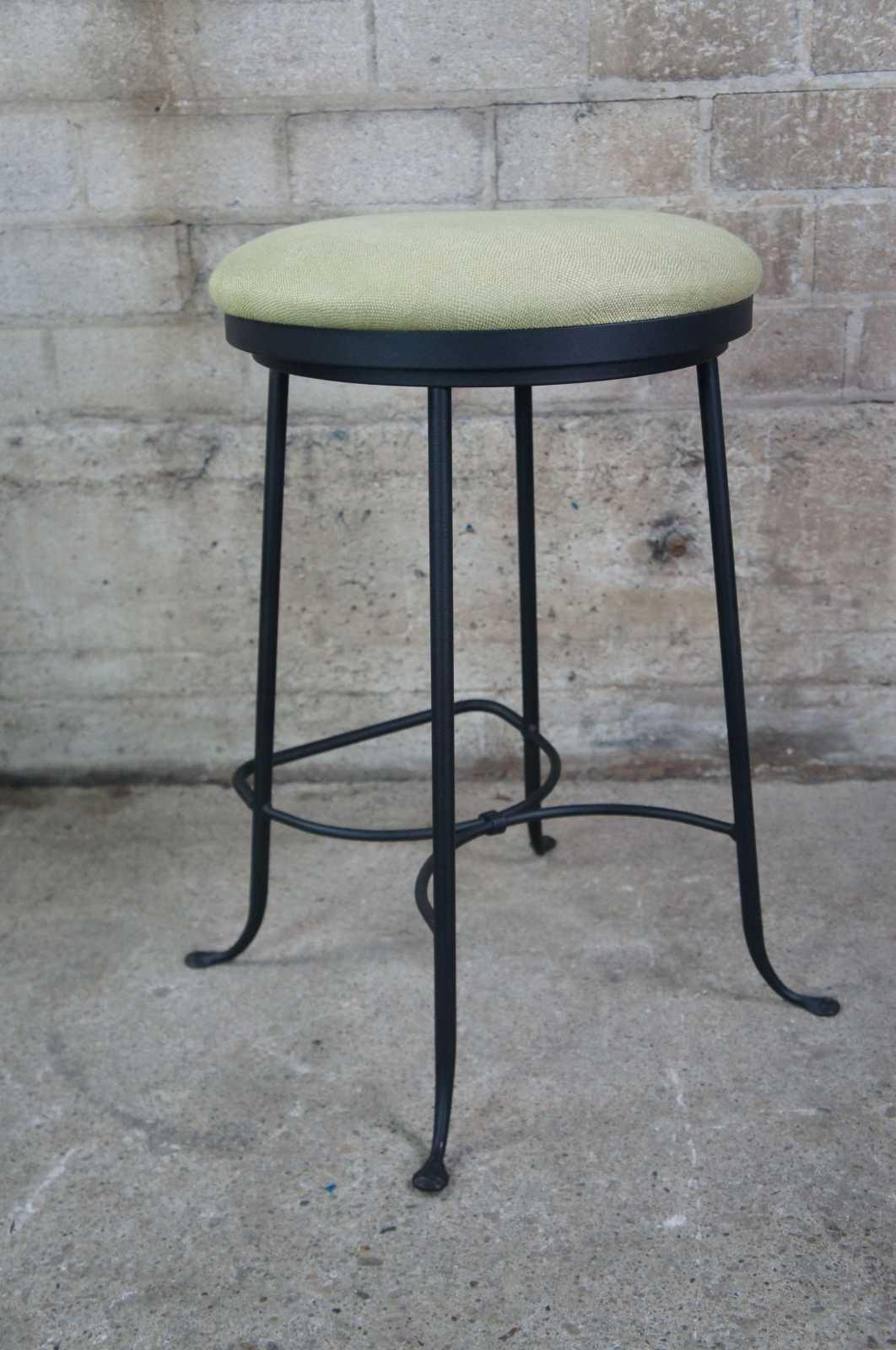 Three vintage Hearthstone Ent., Inc bar or counter stools featuring swivel seat with green upholstery and heavy sturdy wrought iron frame with foot rest. Made in Boone, North Carolina.