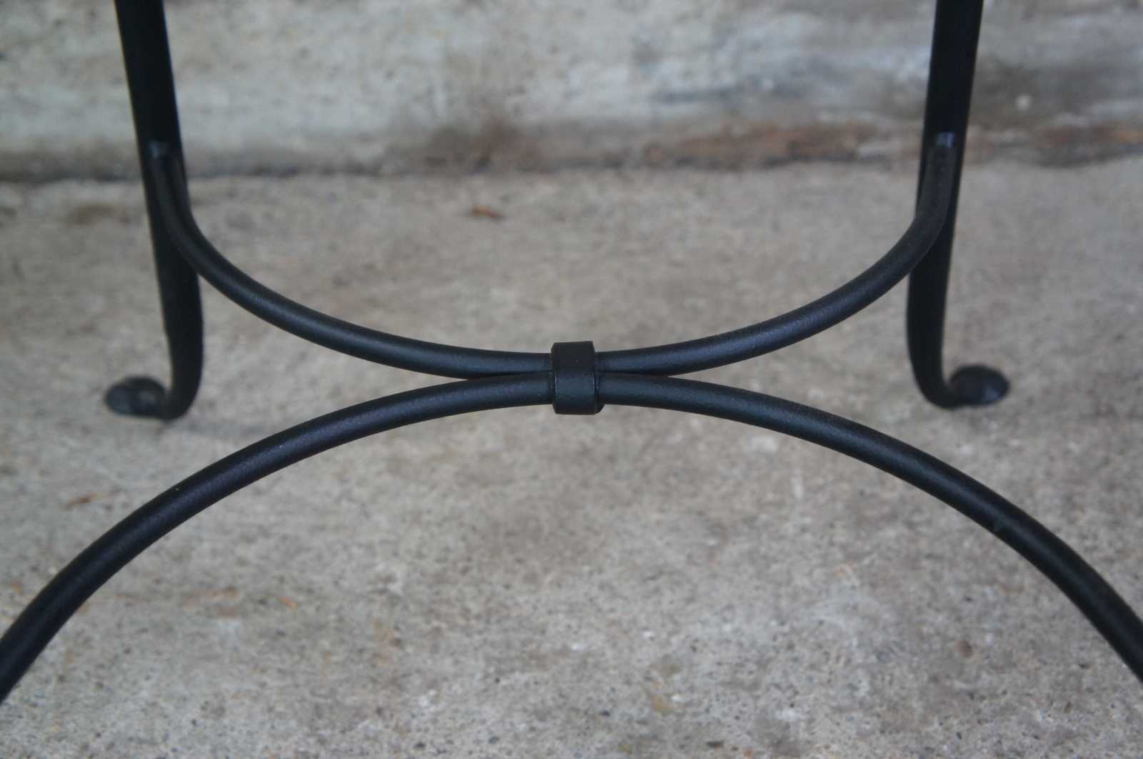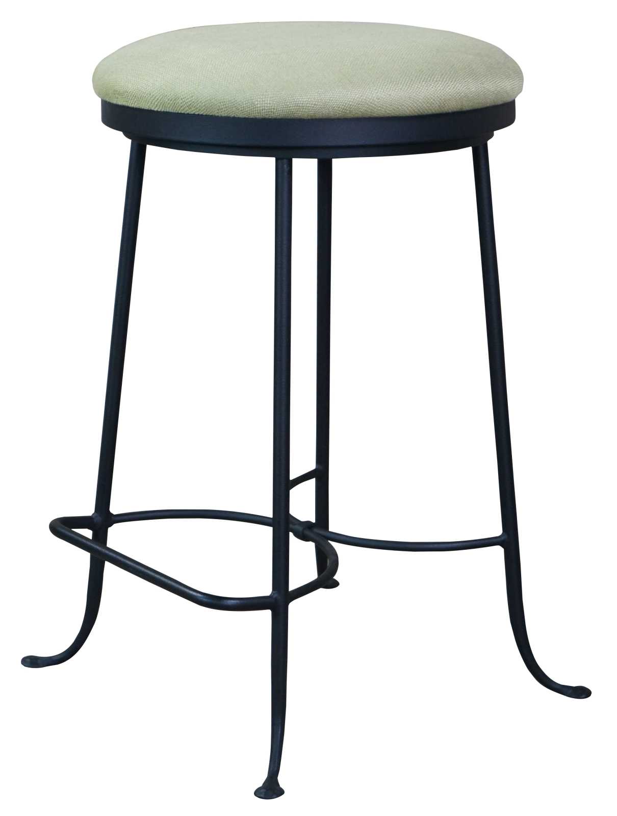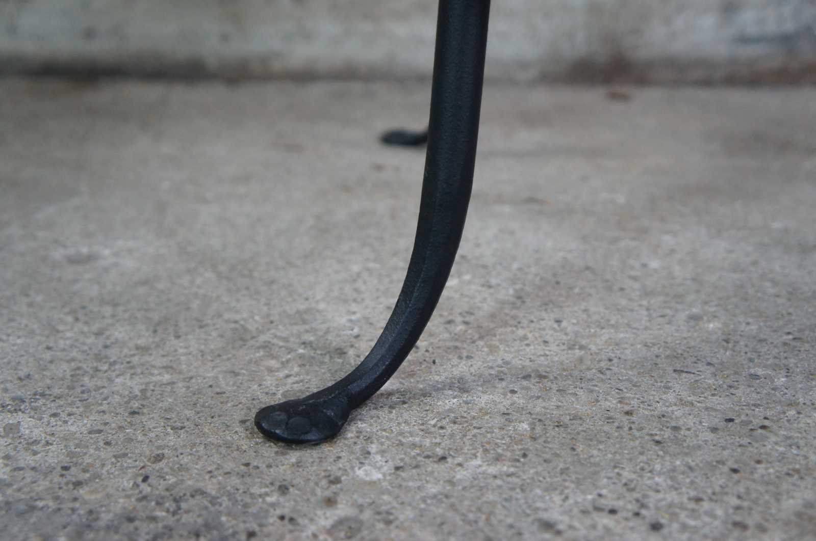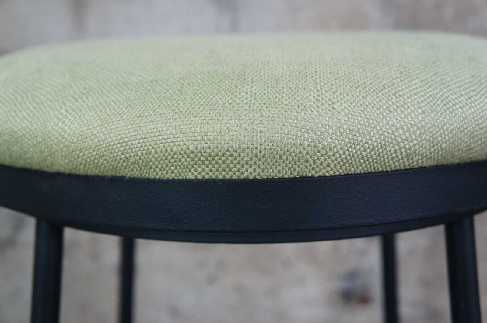 Three vintage Hearthstone Ent., Inc bar or counter stools featuring swivel seat with green upholstery and heavy sturdy wrought iron frame with foot rest. Made in Boone, North Carolina.