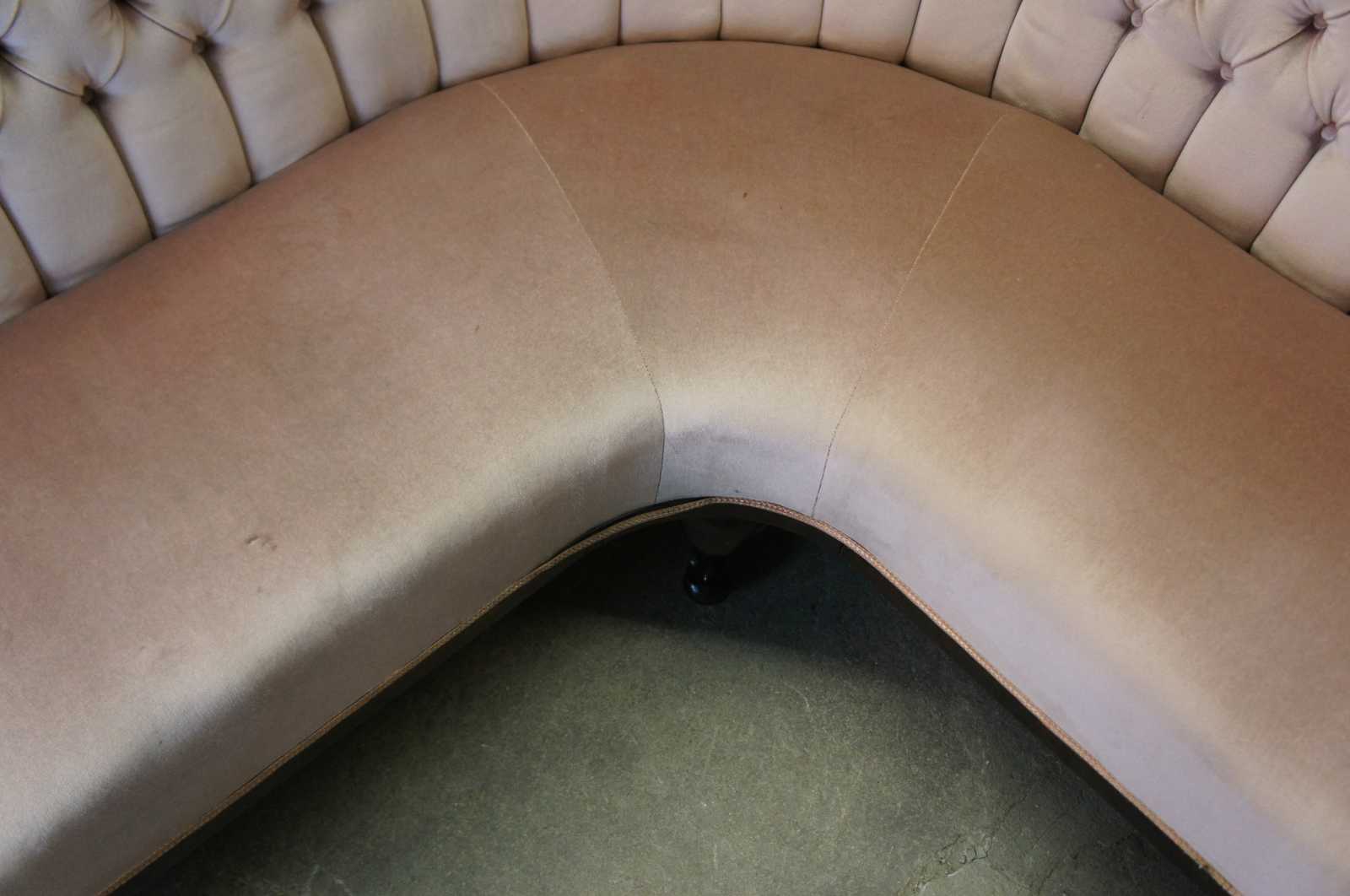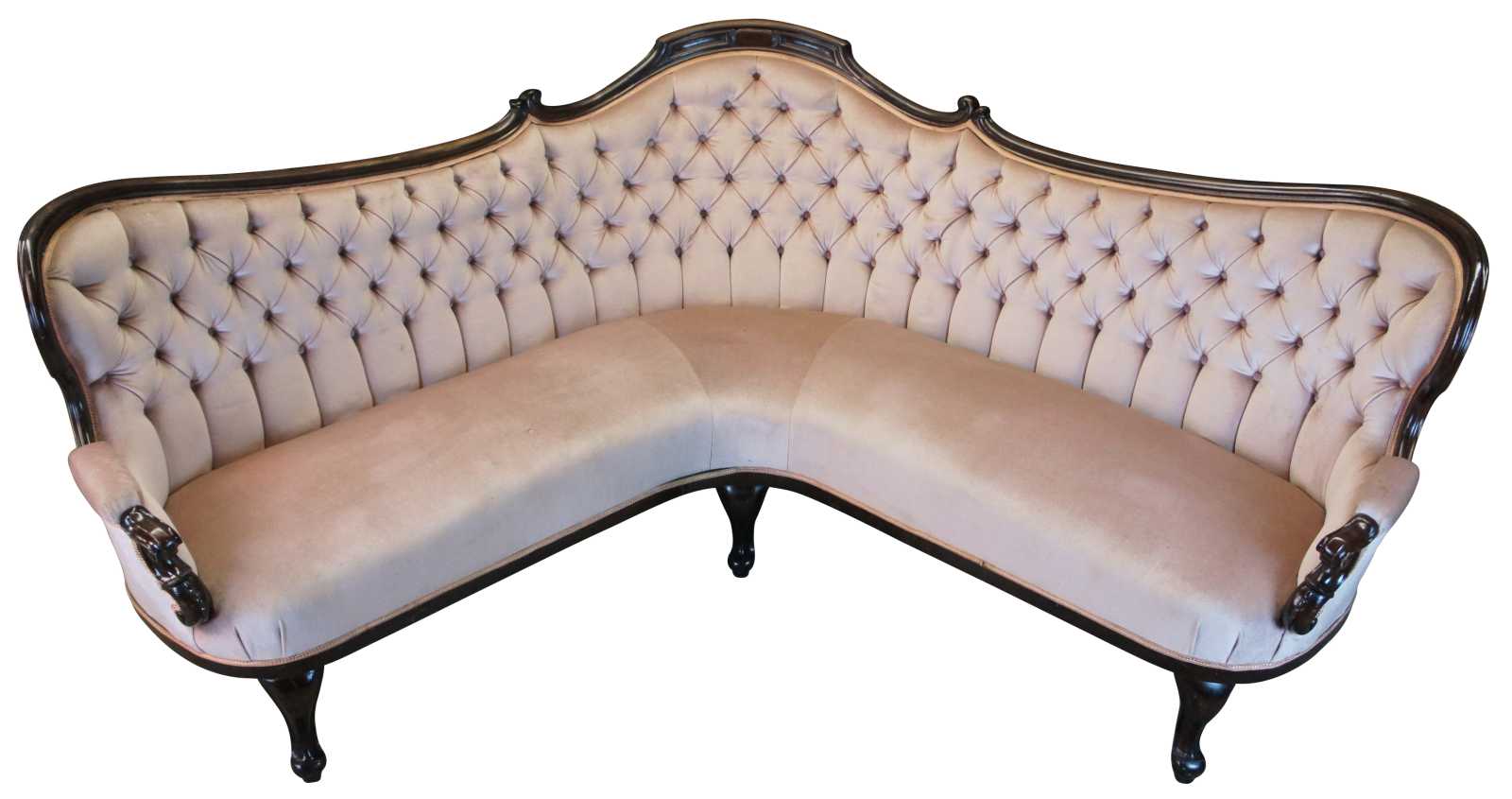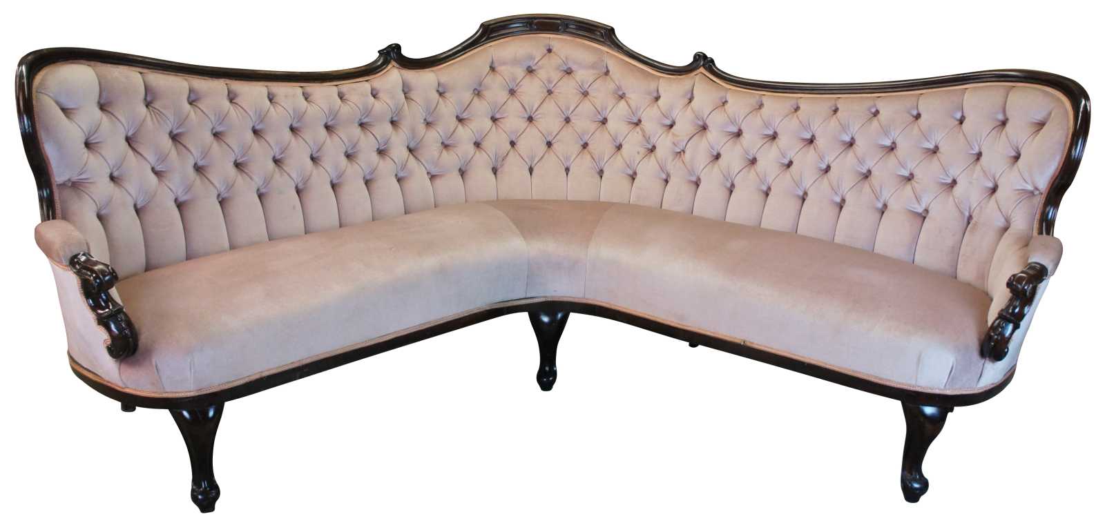Monumental Victorian corner parlor sofa featuring serpentine walnut frame with S scroll carved and padded arms. Features Queen Anne legs and tufted upholstery. Circa 1870s