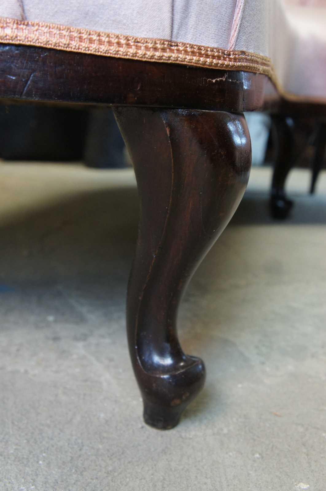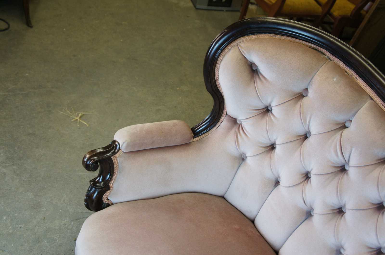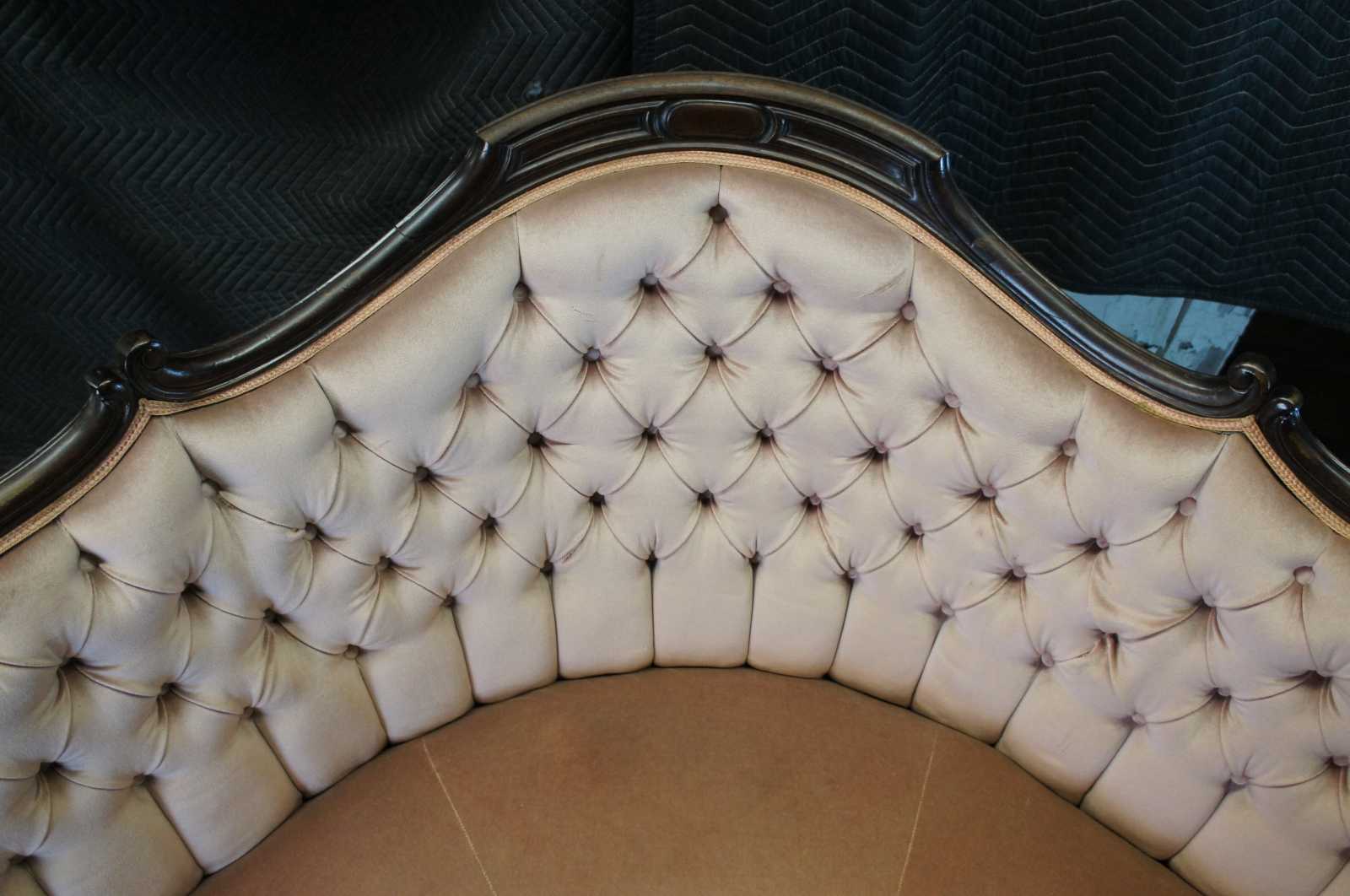 Monumental Victorian corner parlor sofa featuring serpentine walnut frame with S scroll carved and padded arms. Features Queen Anne legs and tufted upholstery. Circa 1870s