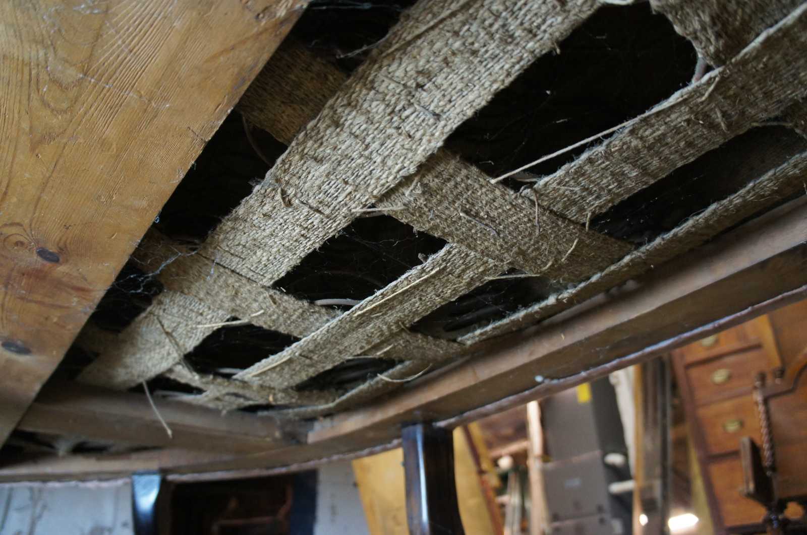 Good antique condition, wear and distressing commensurate with age and use, staining / wear / fading to fabric, loose trim.
