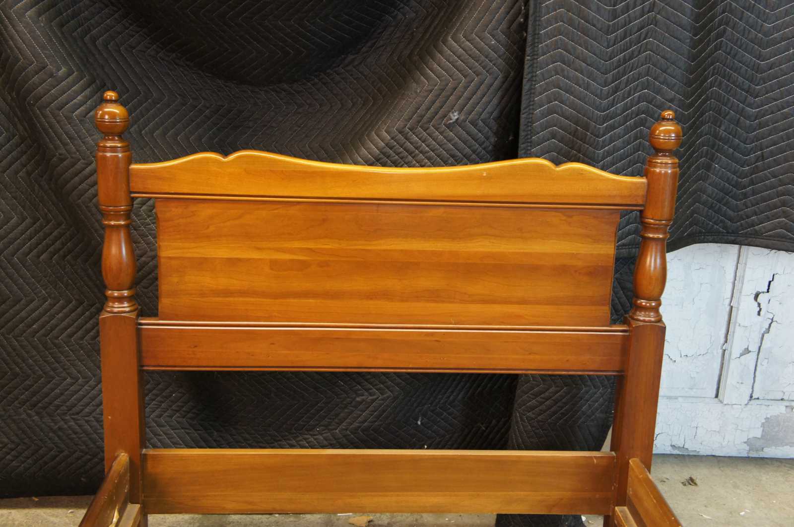 Pair of mid century Georgetown Galleries early American style solid cherry twin bed frames sold by Woodward & Lothrop department stores. Circa 1946 - 1954. Item 340-572.