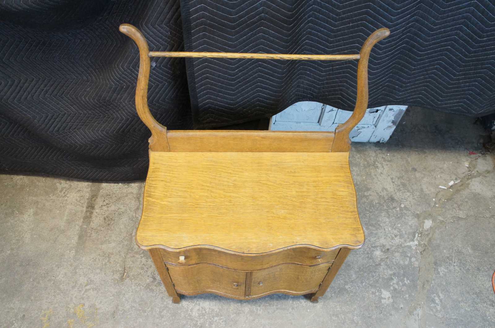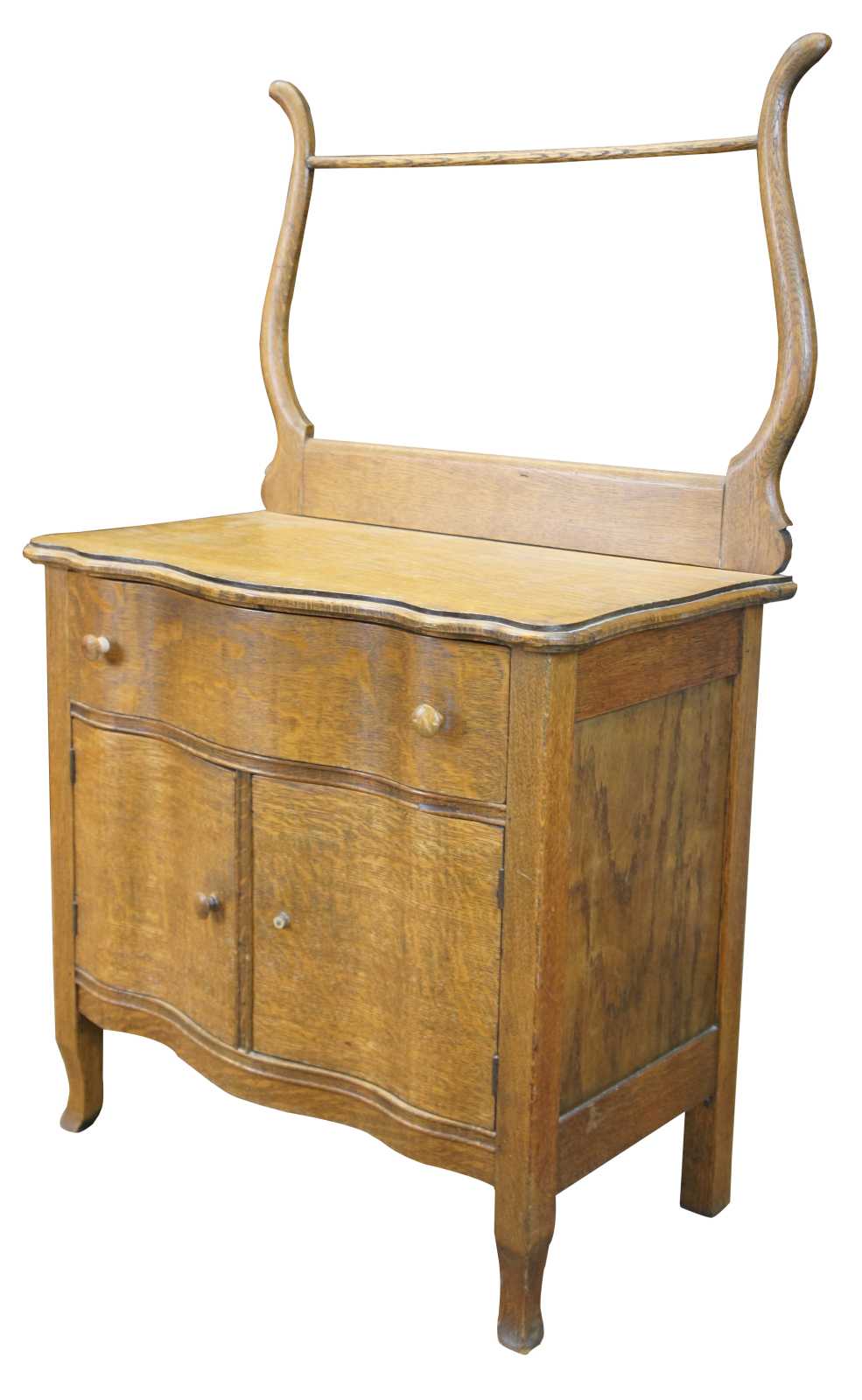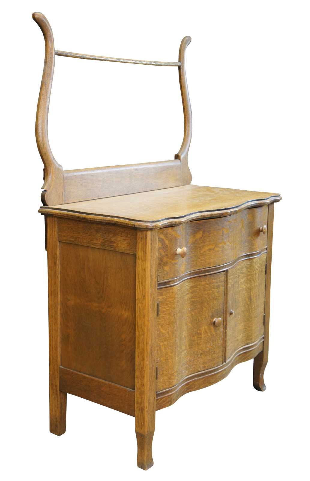 Antique early American wash stand, dry sink or commode. Made of quartersawn oak featuring serpentine form with lower cabinet, one drawer and upper towel bar.
