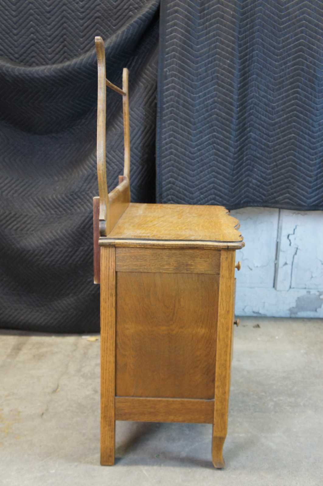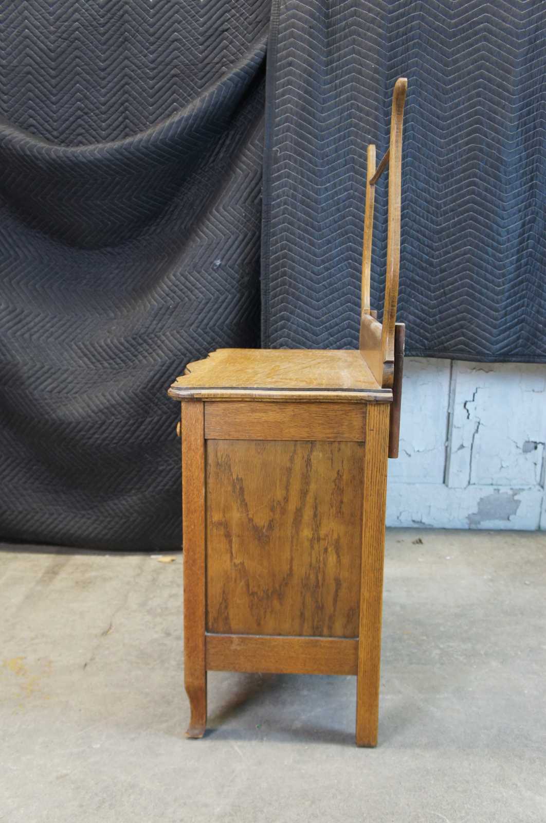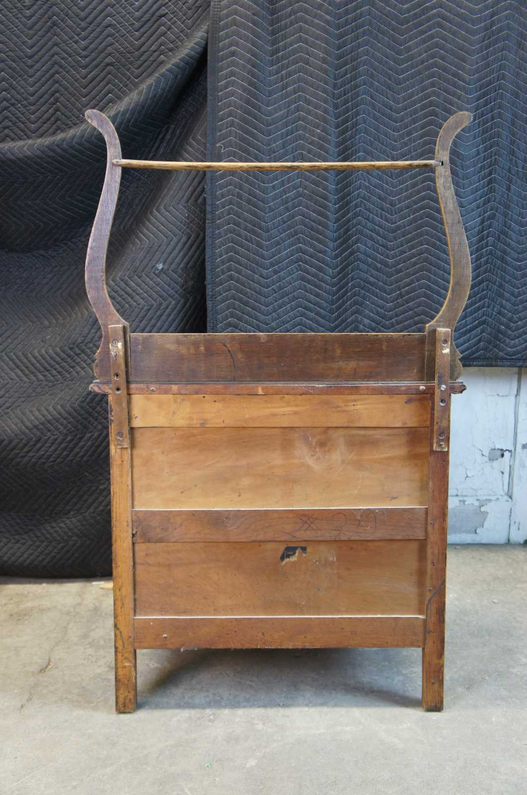 Antique early American wash stand, dry sink or commode. Made of quartersawn oak featuring serpentine form with lower cabinet, one drawer and upper towel bar.