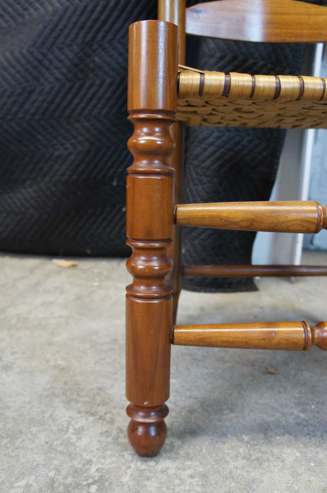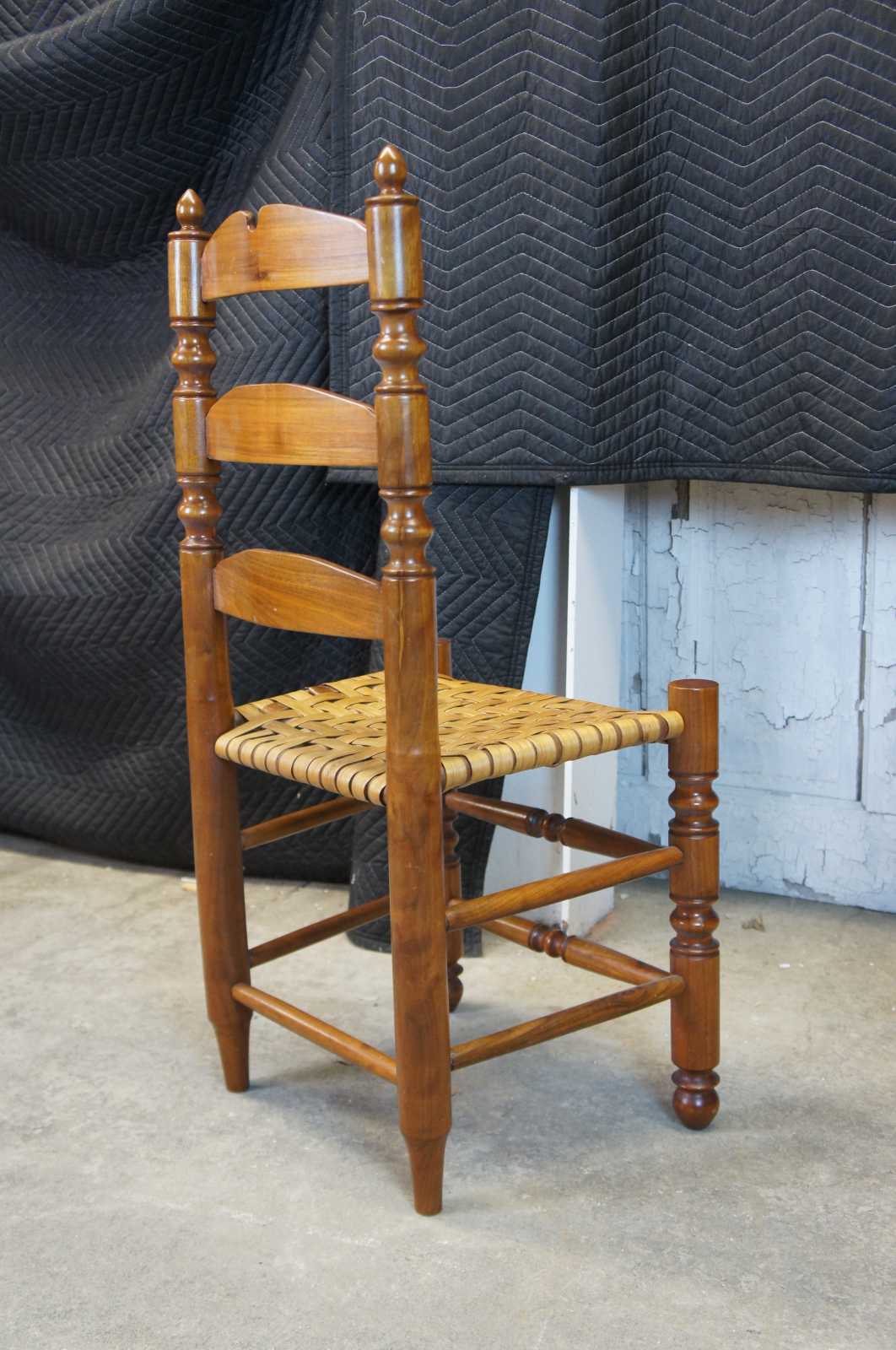 Six antique Shaker farmhouse side dining chairs. Made of walnut featuring tall ladderback form with teardrop shaped finials, round turned supports and woven rush seat.