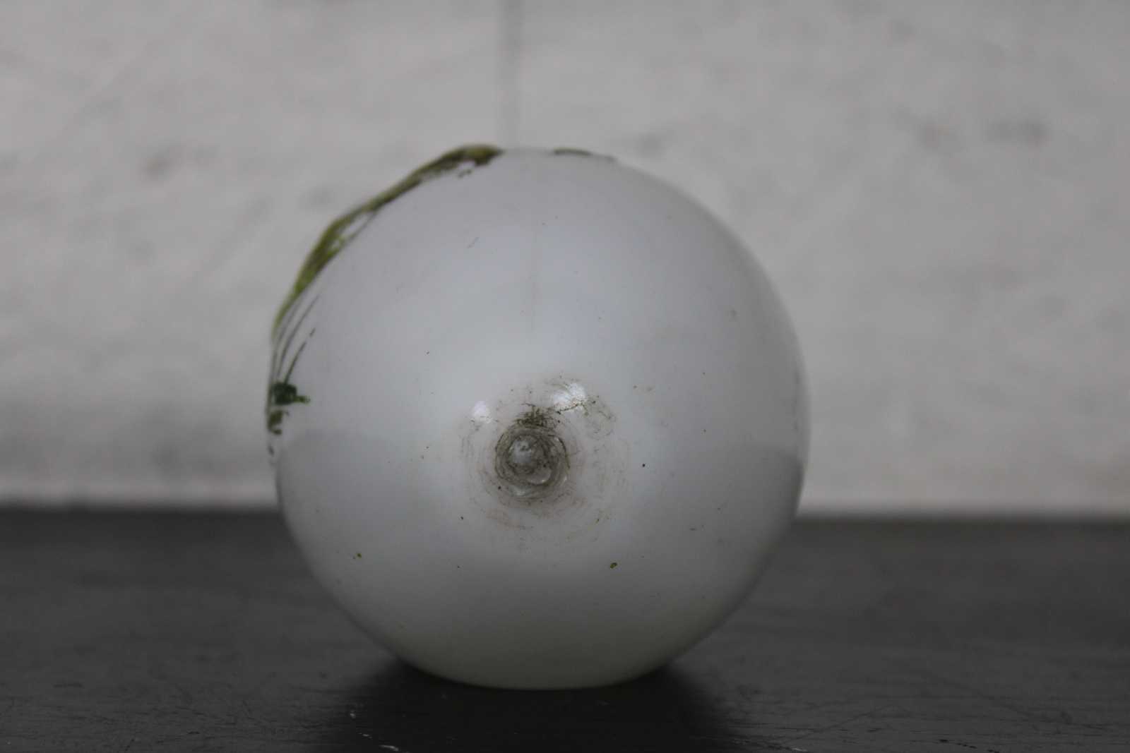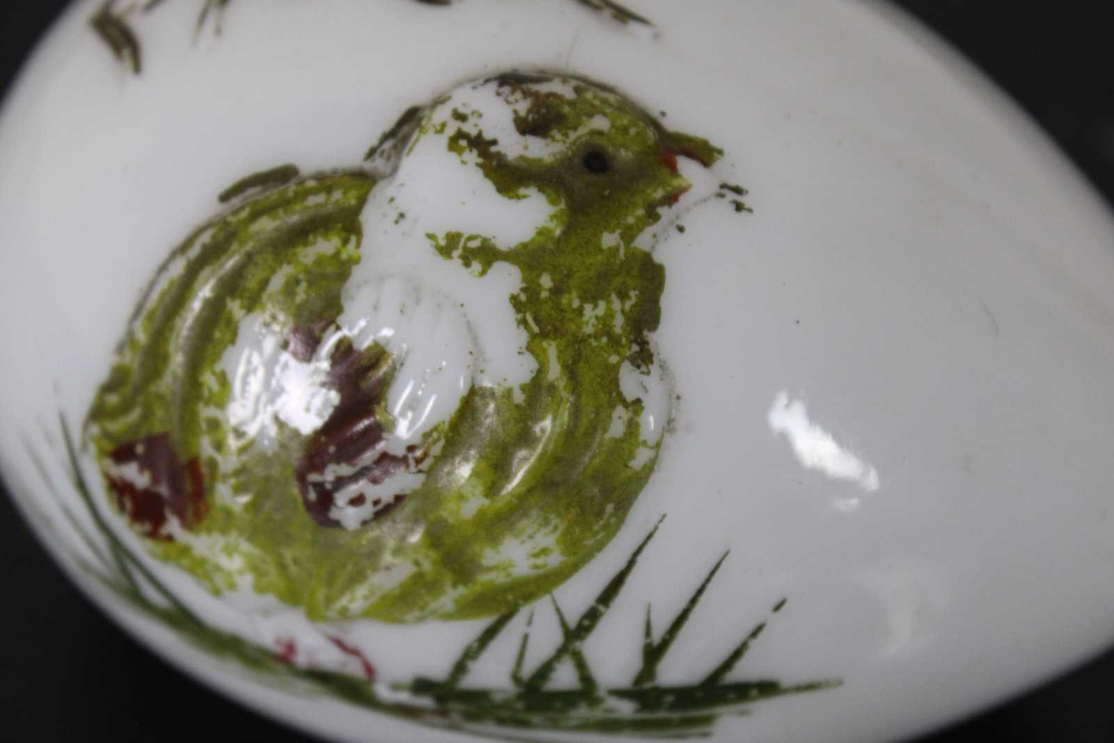 Antique Victorian milk glass Easter egg embossed with a hand painted chick and raised letters, with a flat base for display.