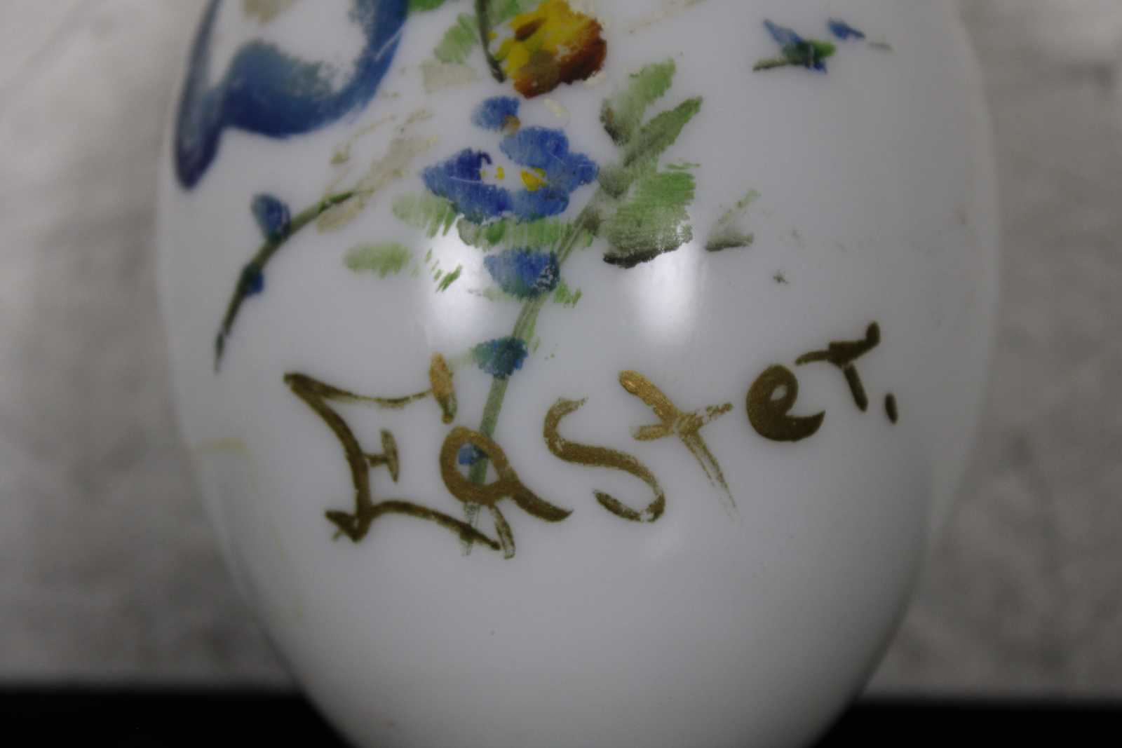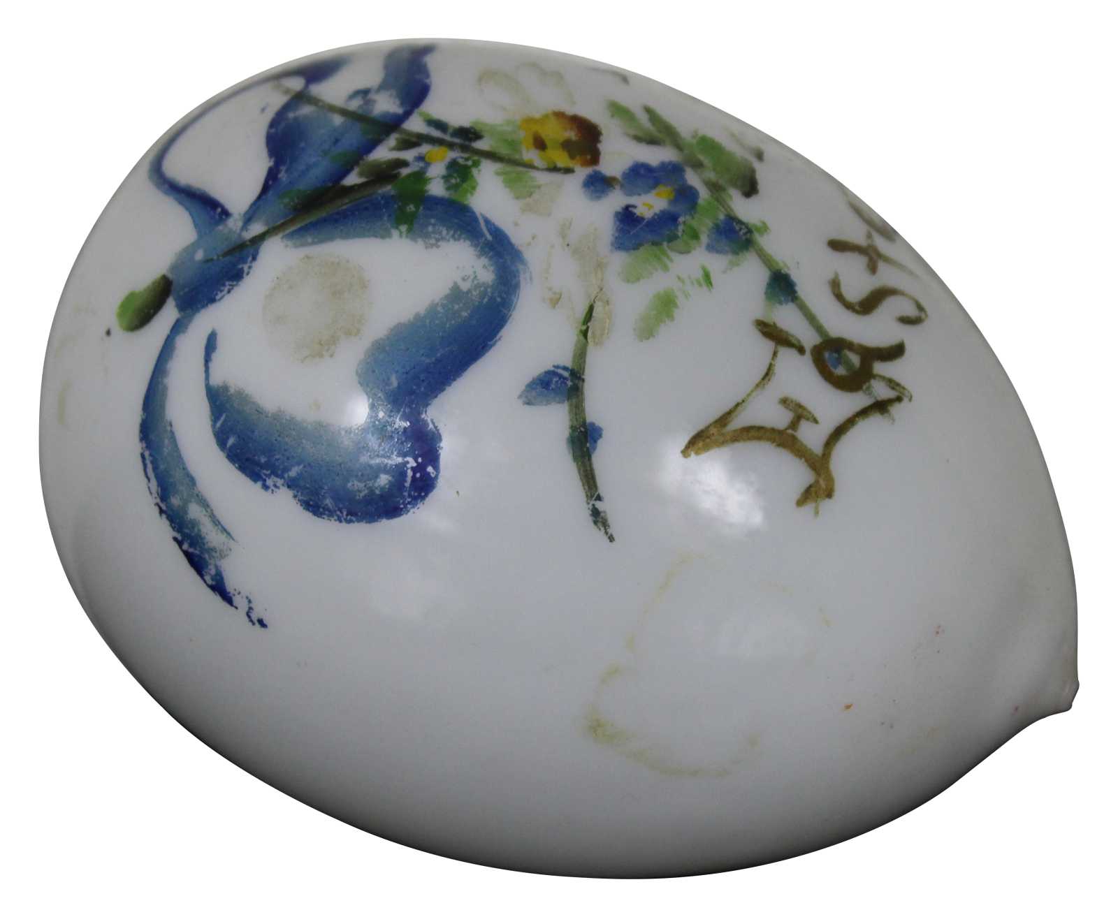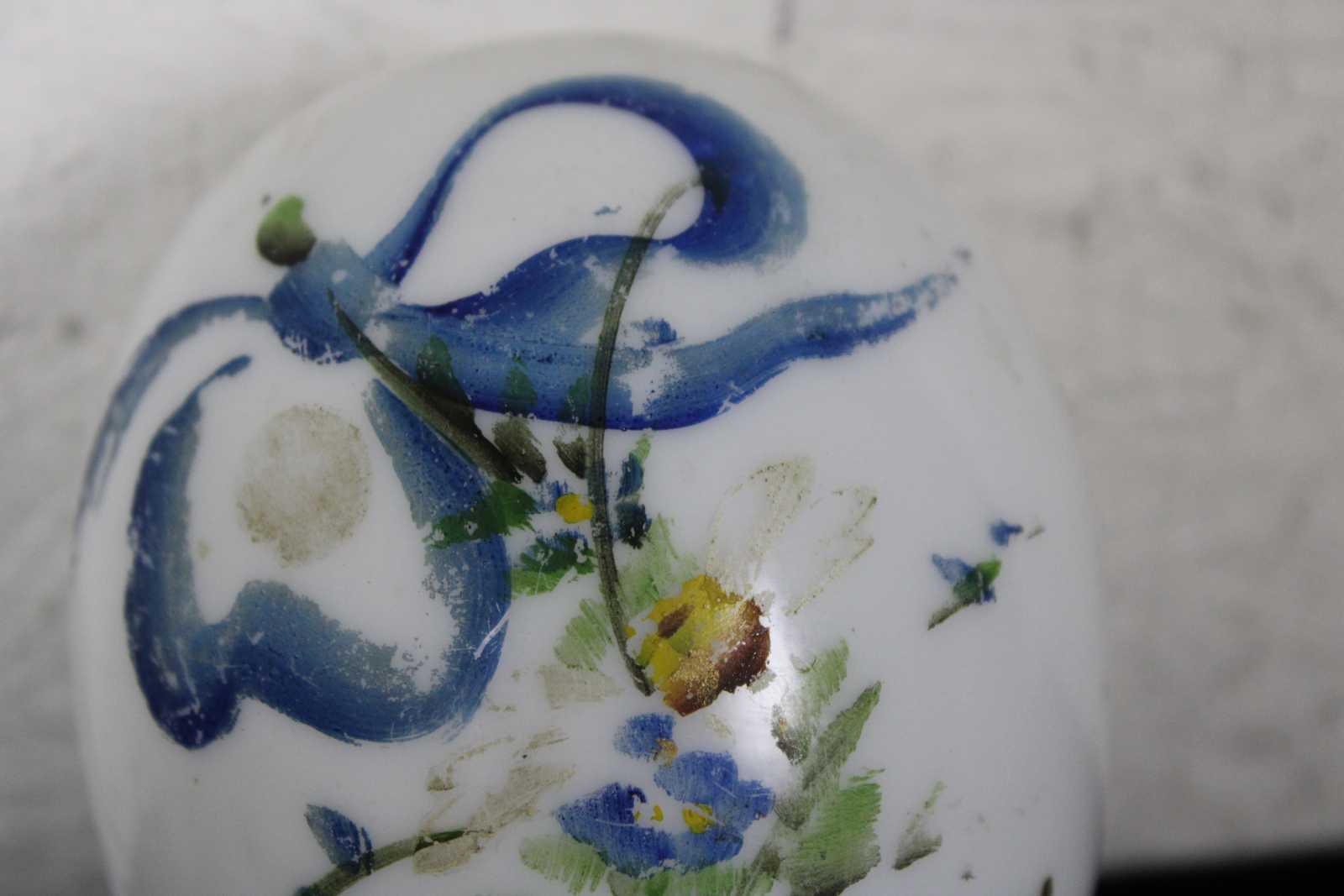 Antique hand blown Victorian milk glass Easter egg hand painted with a blue ribbon and flowers.