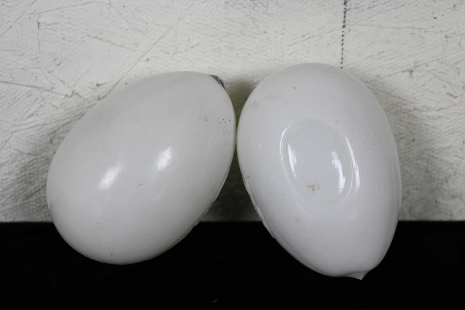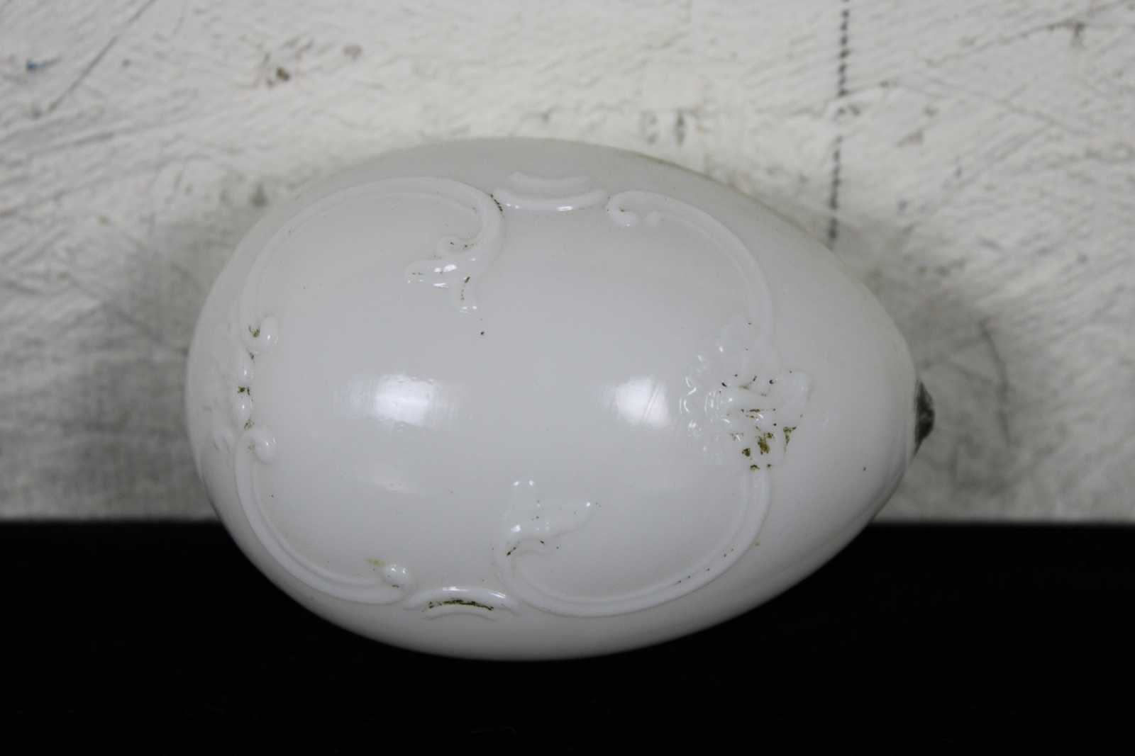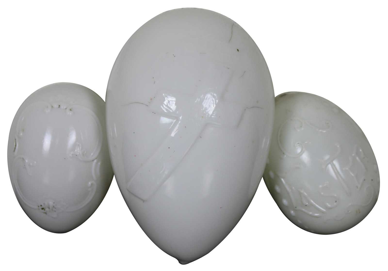 Lot of 4 antique embossed Victorian milk glass Easter eggs; patterns include “Easter” with a cross, “Easter Greeting” with raised patterns, “Easter” on a scroll with daisies, and a raised scrolled frame.