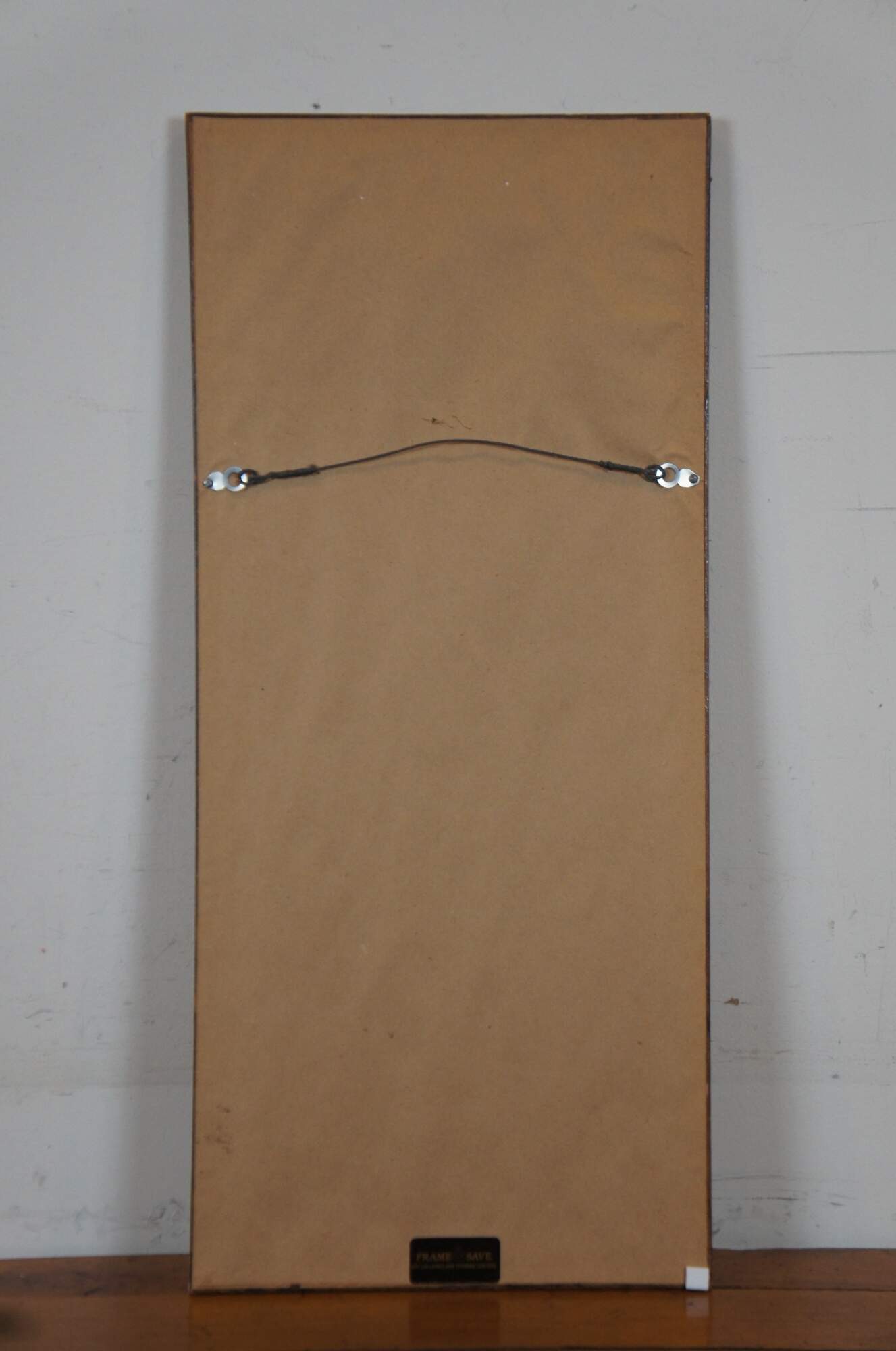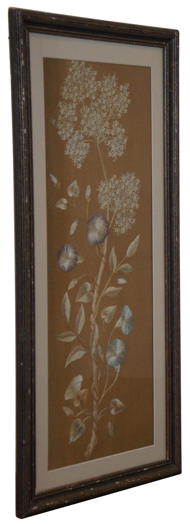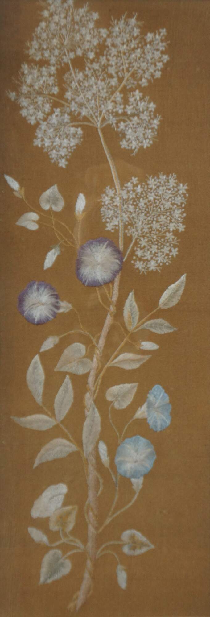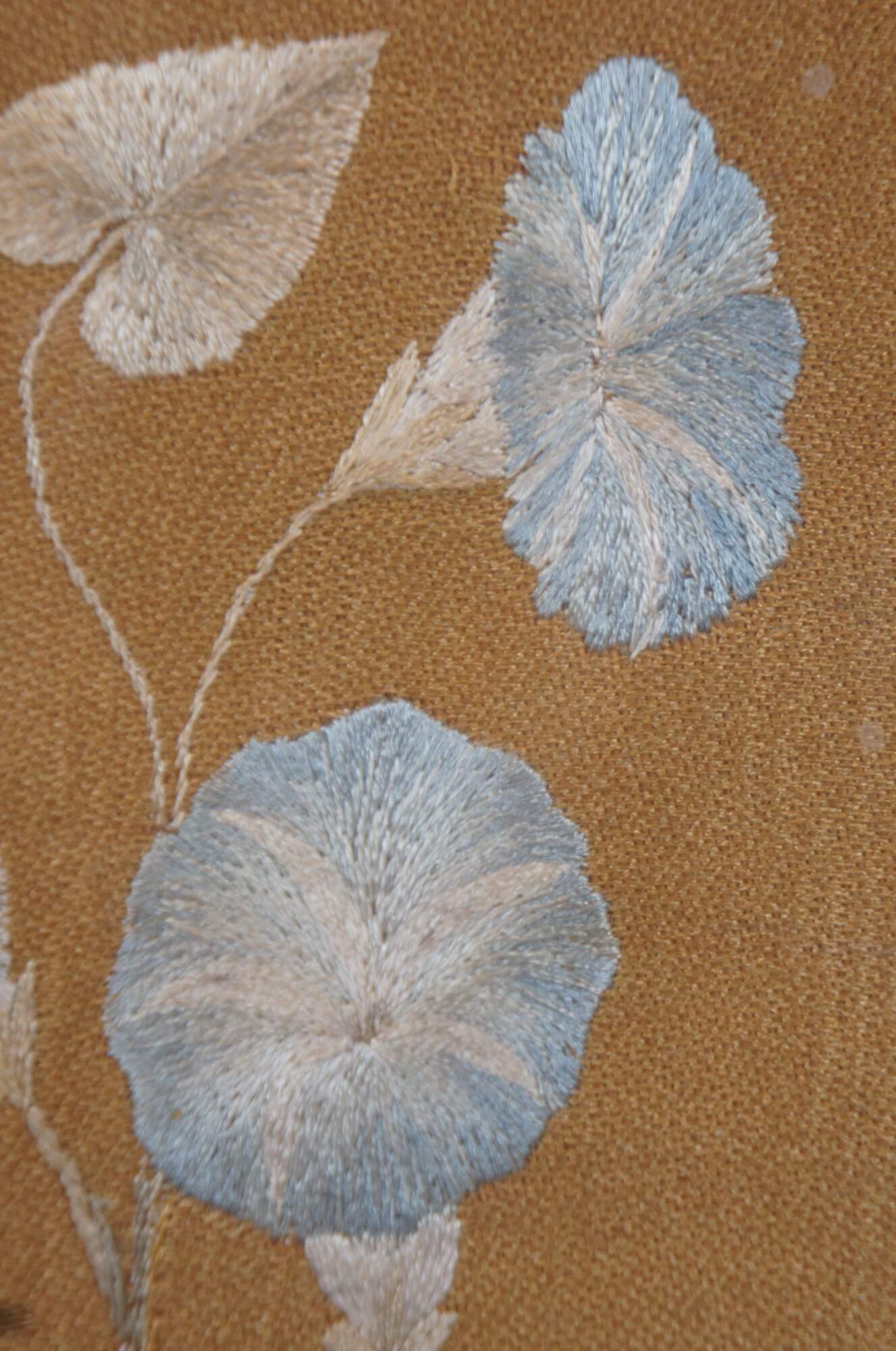 Mid century famed embroidery panel showing a morning glory vine wrapping around a flowering shrub.