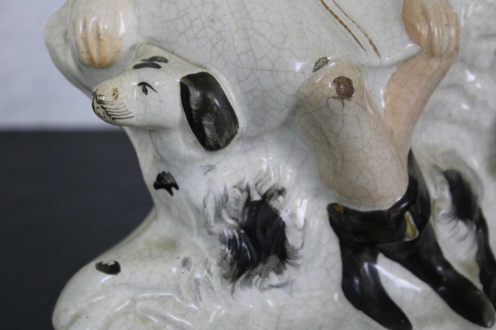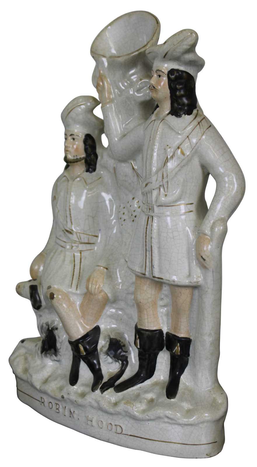 Circa mid 19th century antique Staffordshire English porcelain spill flower vase sculpture showing the folk heroes Robin Hood and Little John with a dog.