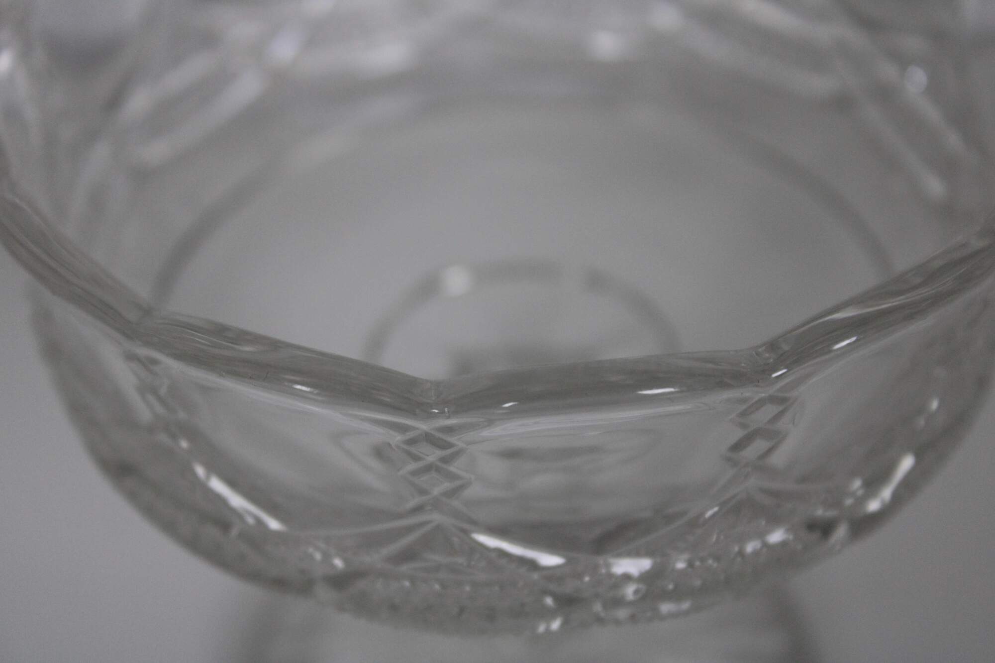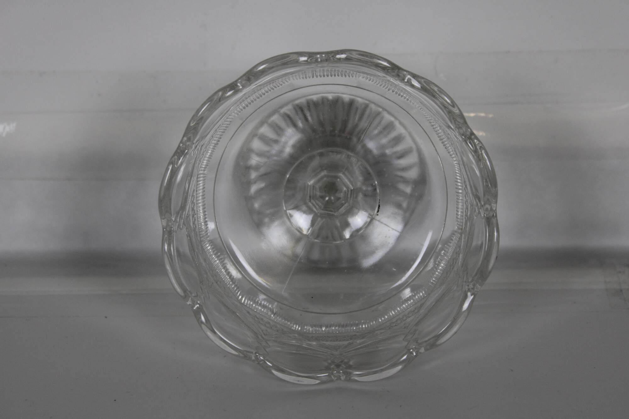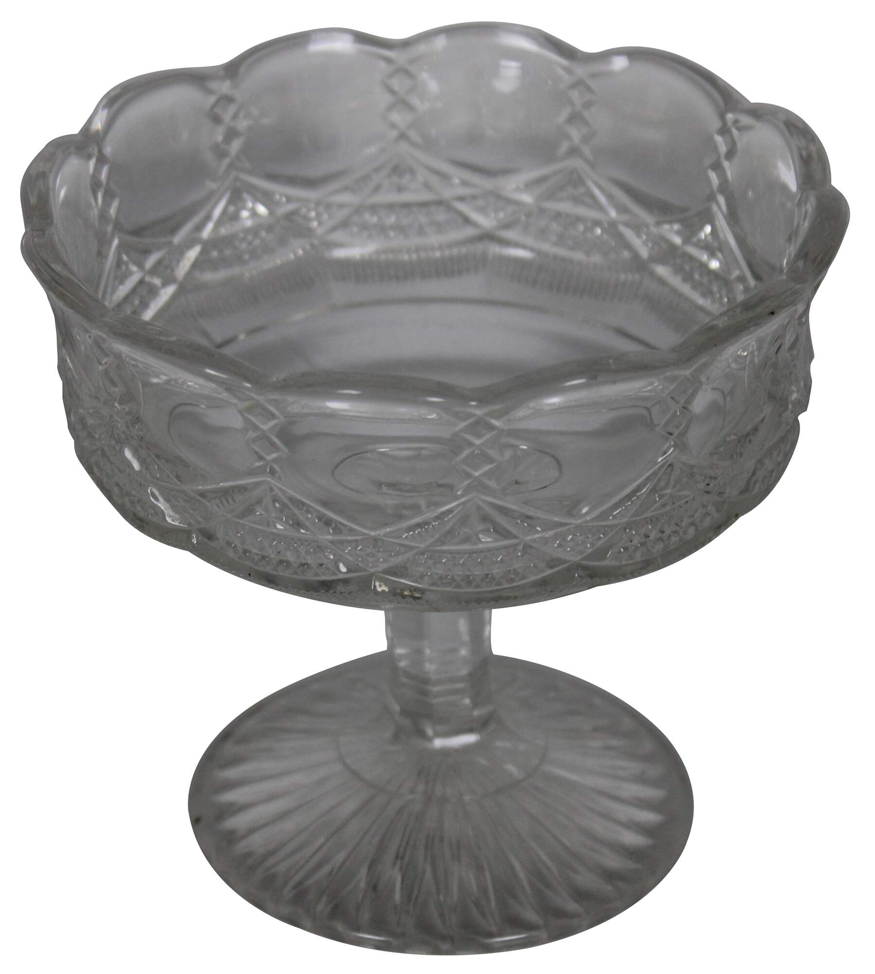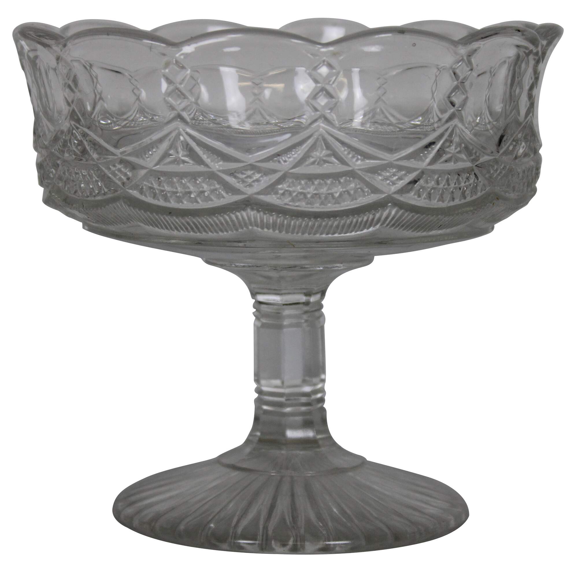 Vintage pressed glass footed compote dish, cup or bowl with Neoclasical styling and goblet form featuring scalloped edge and an elegant diamond and swag pattern along the sides.
