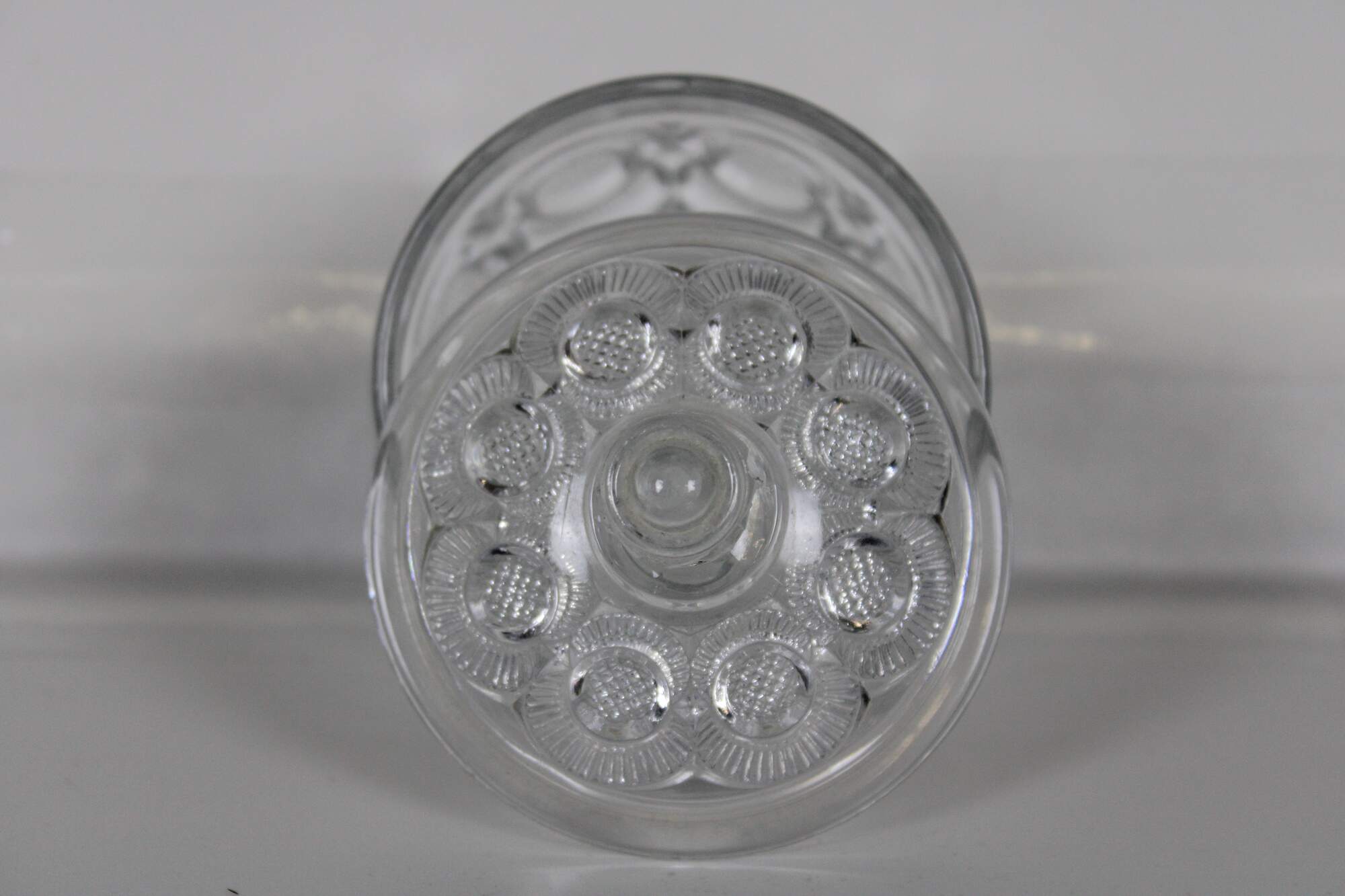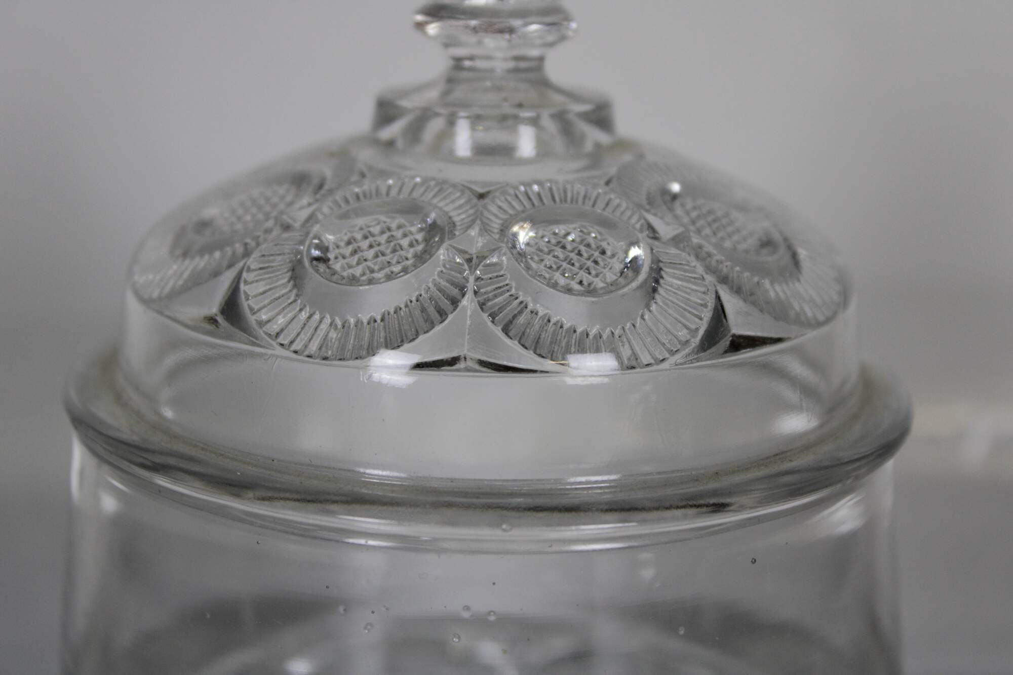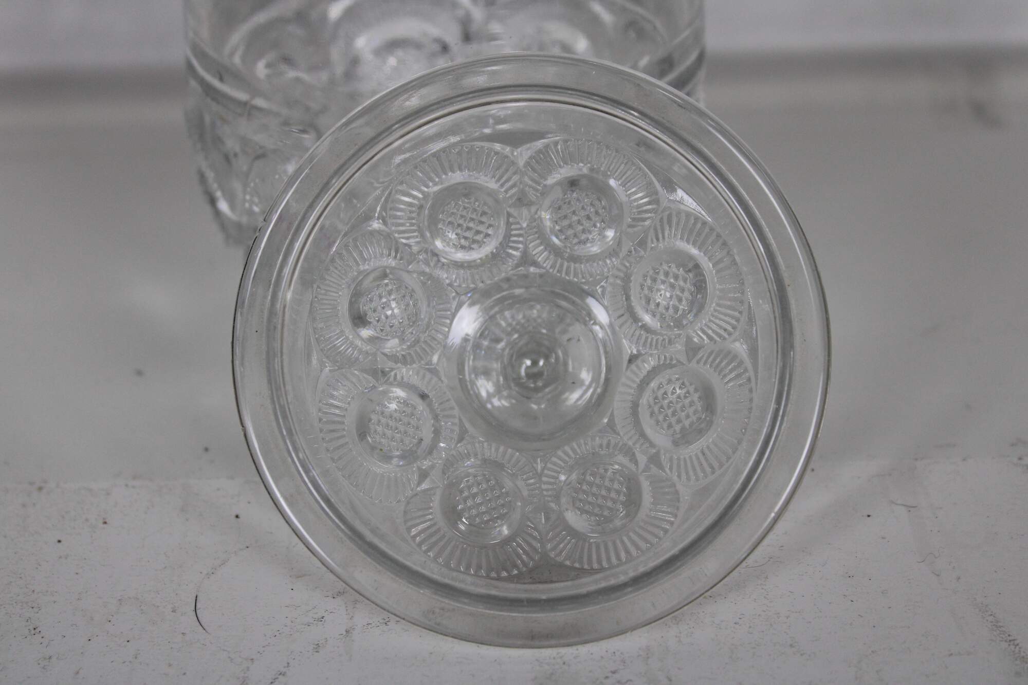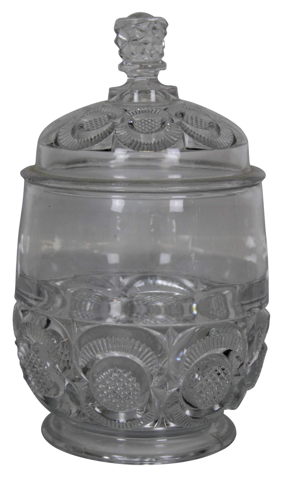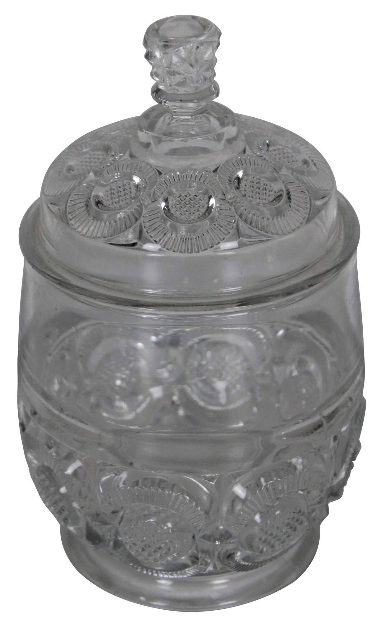 Vintage pressed glass biscuit barrel with geometric floral pinwheel pattern. Attributed to LE Smith.