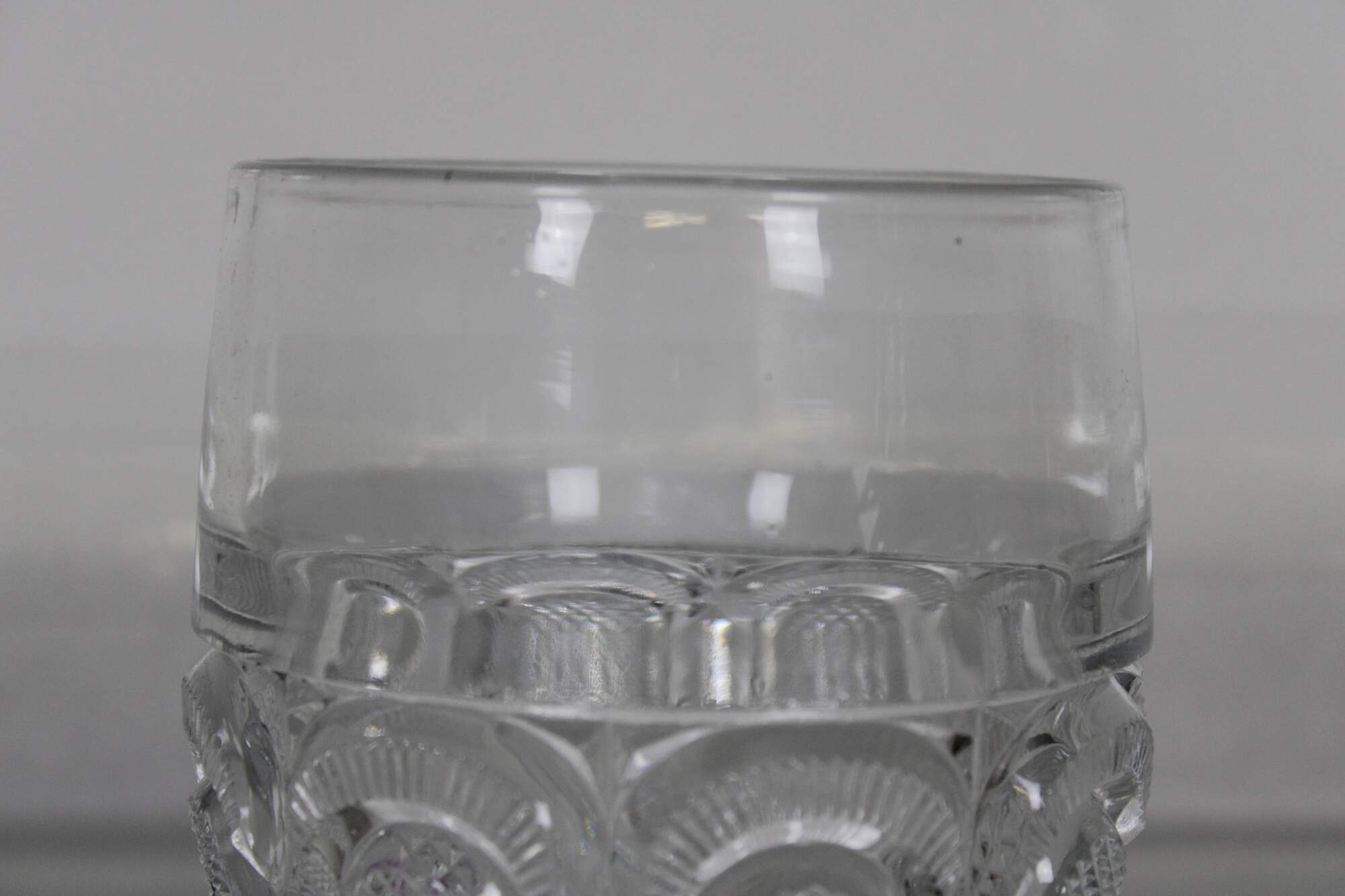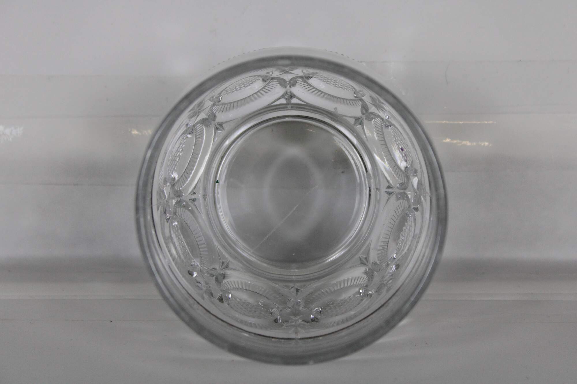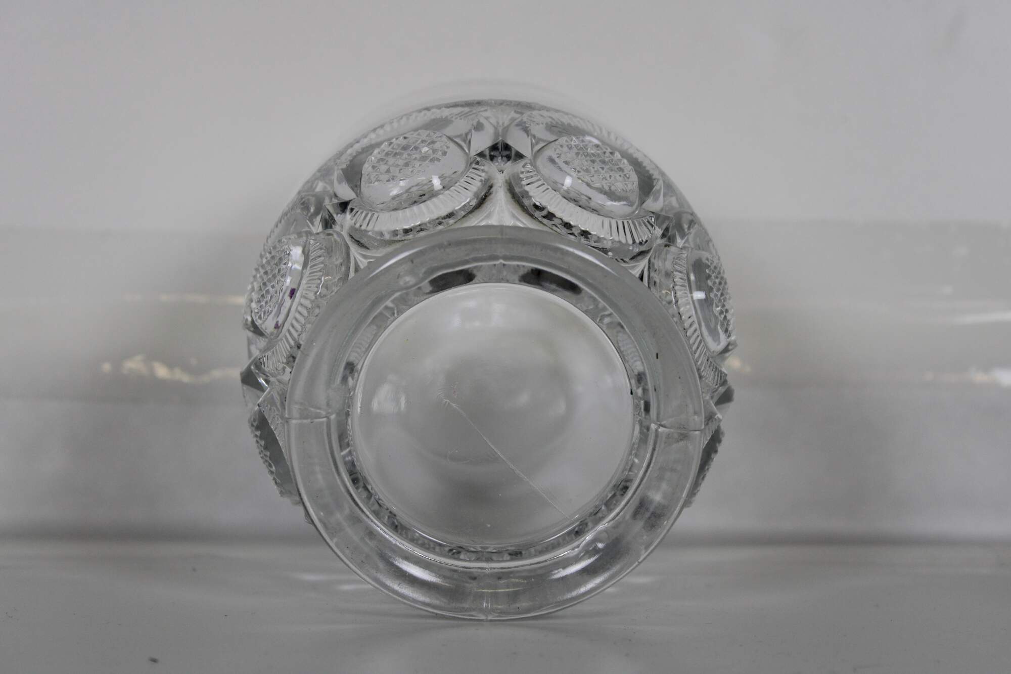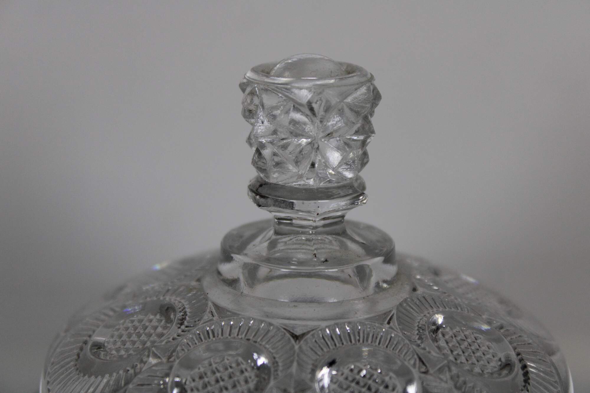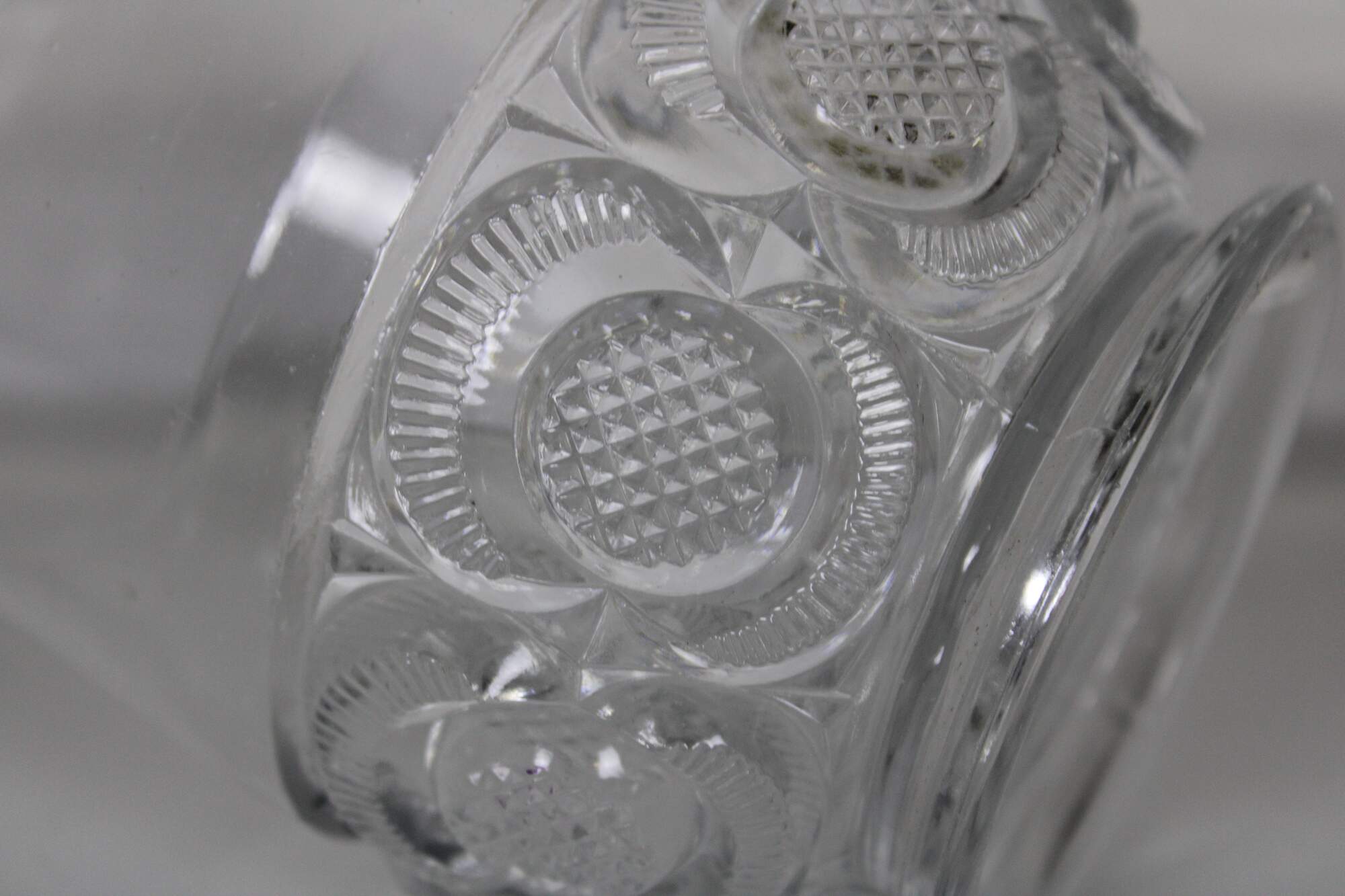 Vintage pressed glass biscuit barrel with geometric floral pinwheel pattern. Attributed to LE Smith.