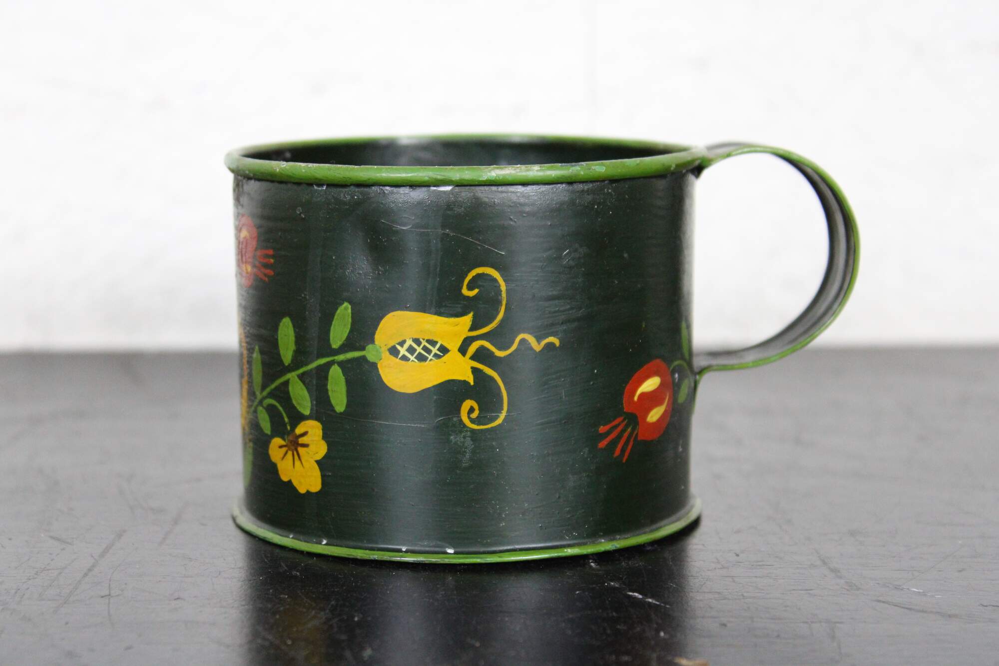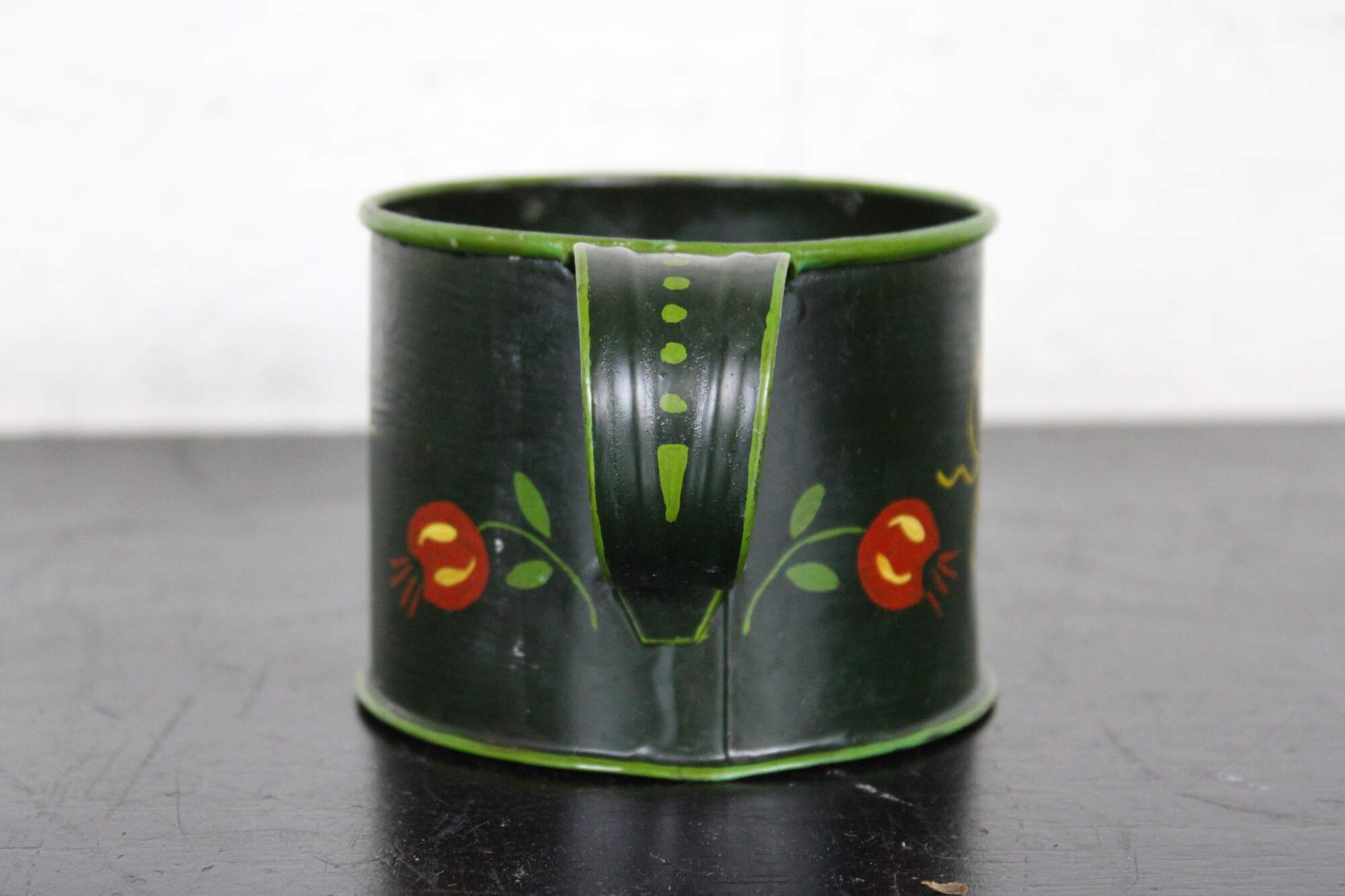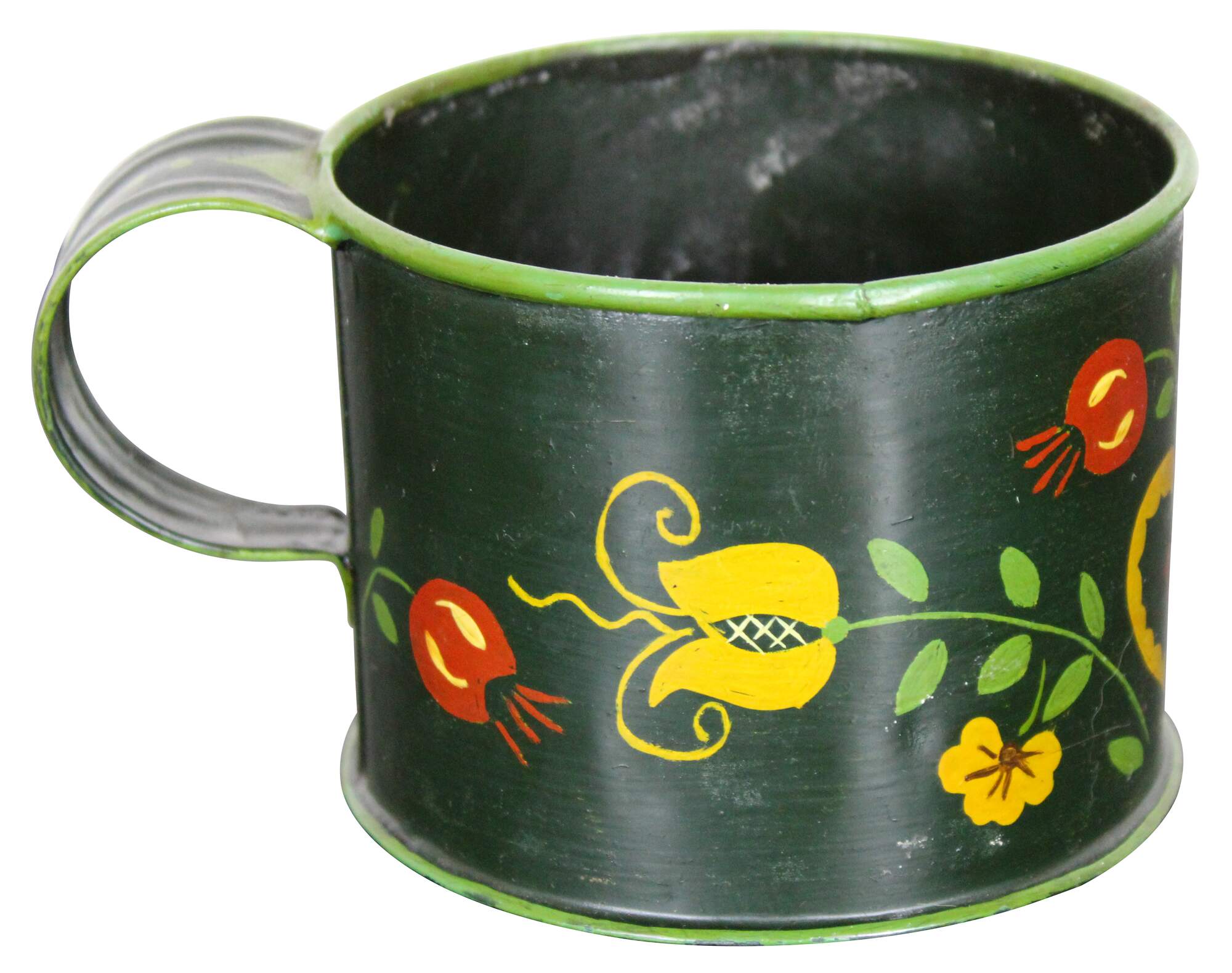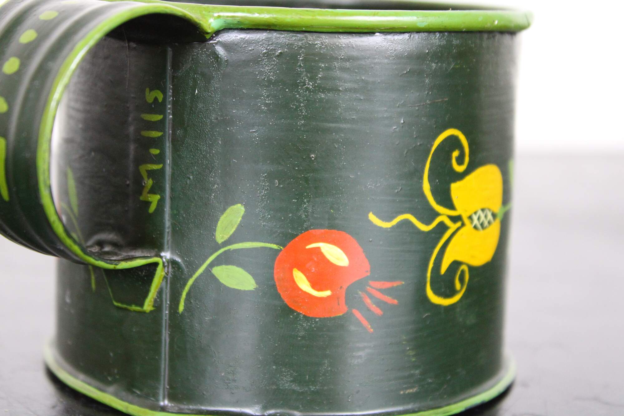Vintage folk art style tin cup painted in shades of green with orange and yellow flowers; signed by artist “Mills” under handle.