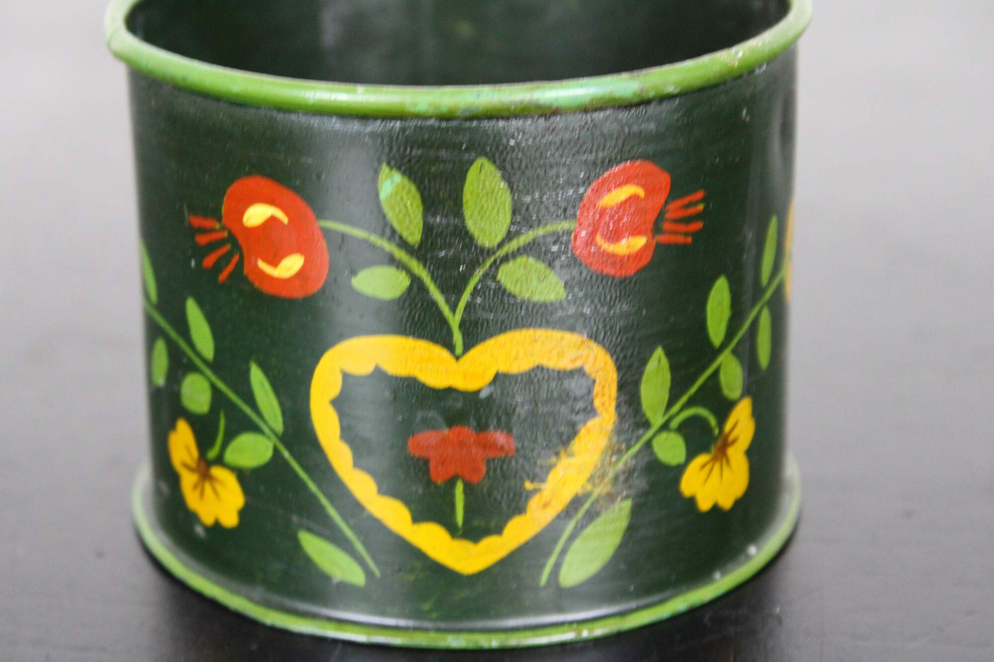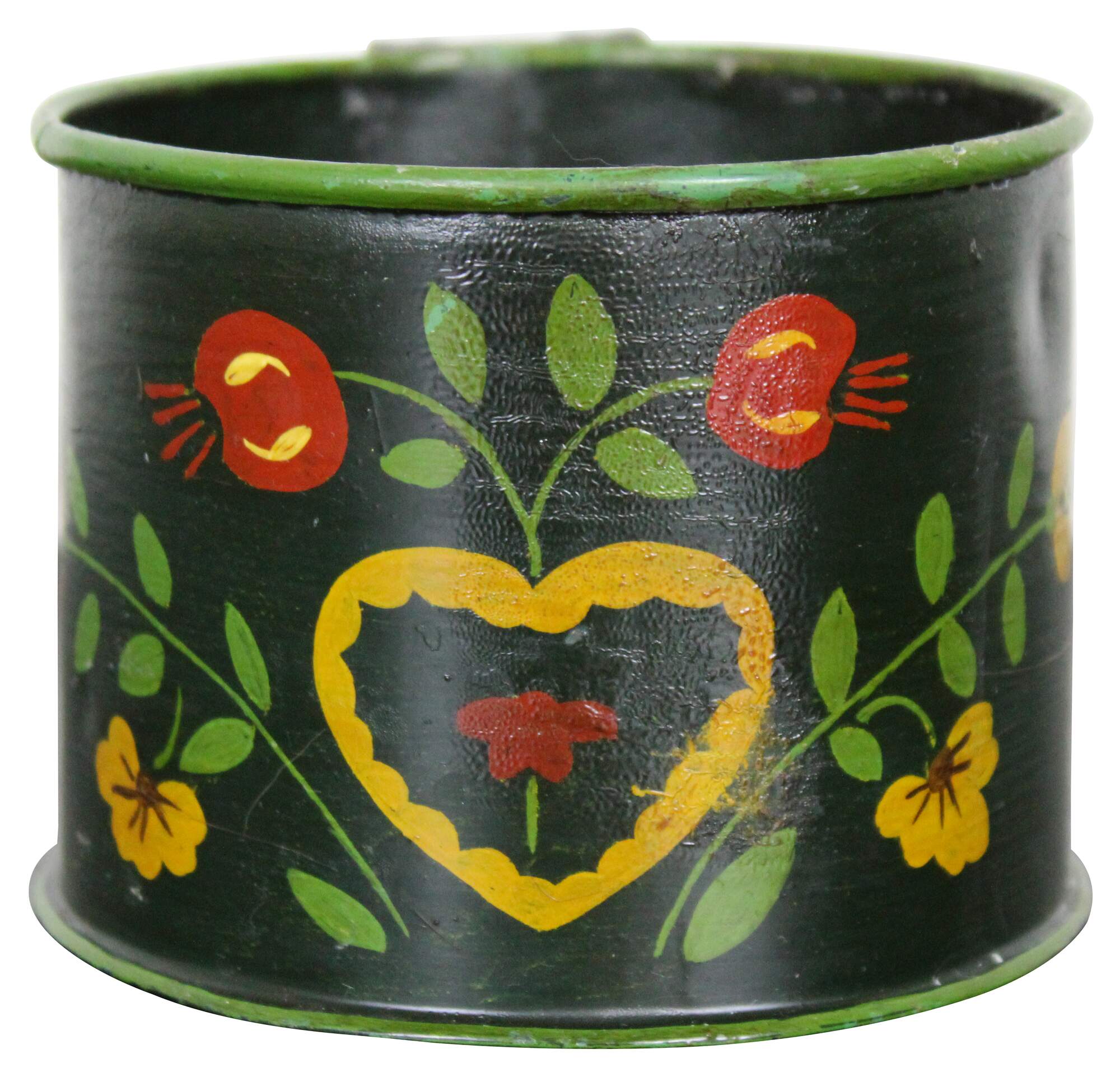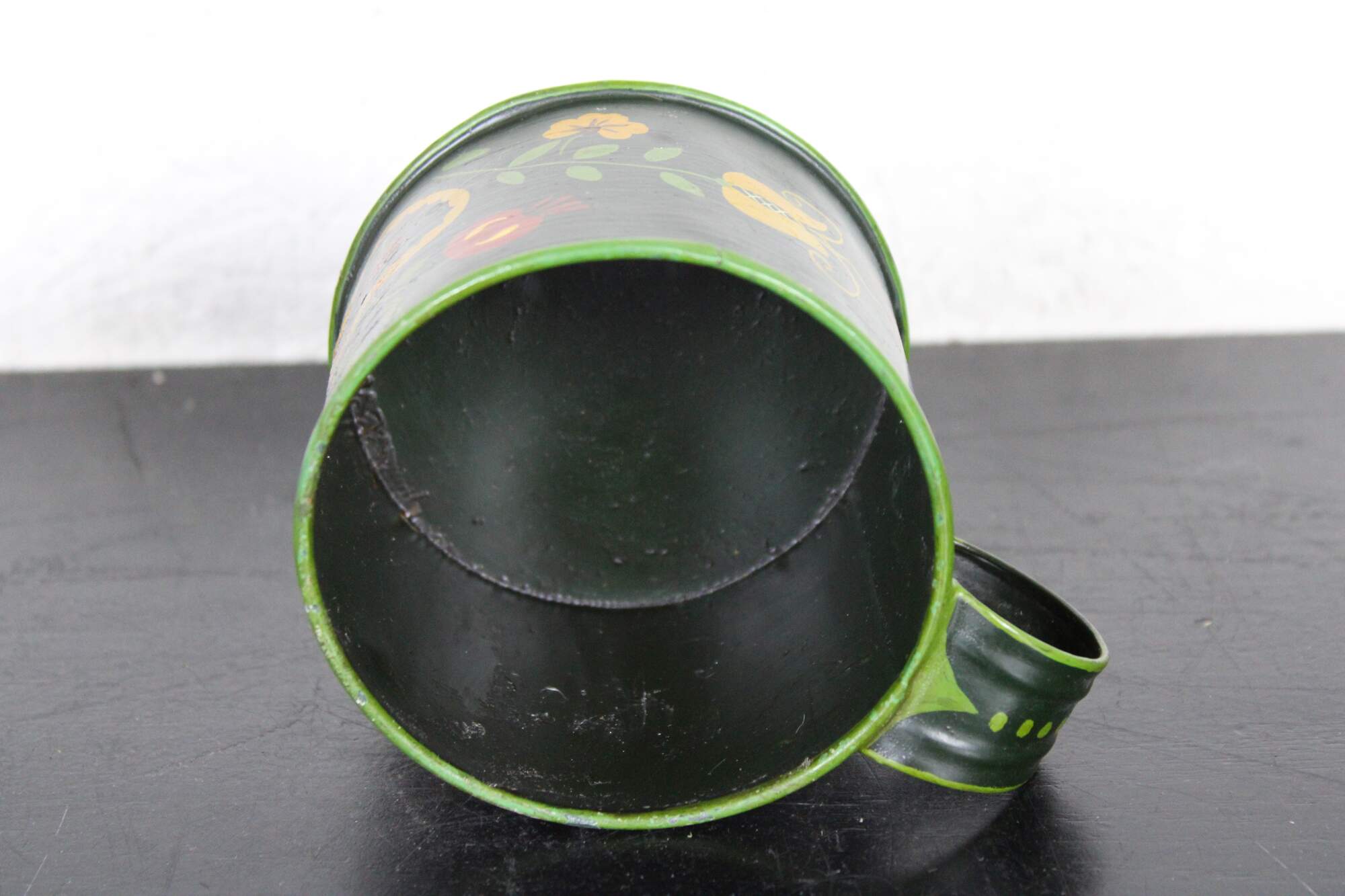 Vintage folk art style tin cup painted in shades of green with orange and yellow flowers; signed by artist “Mills” under handle.