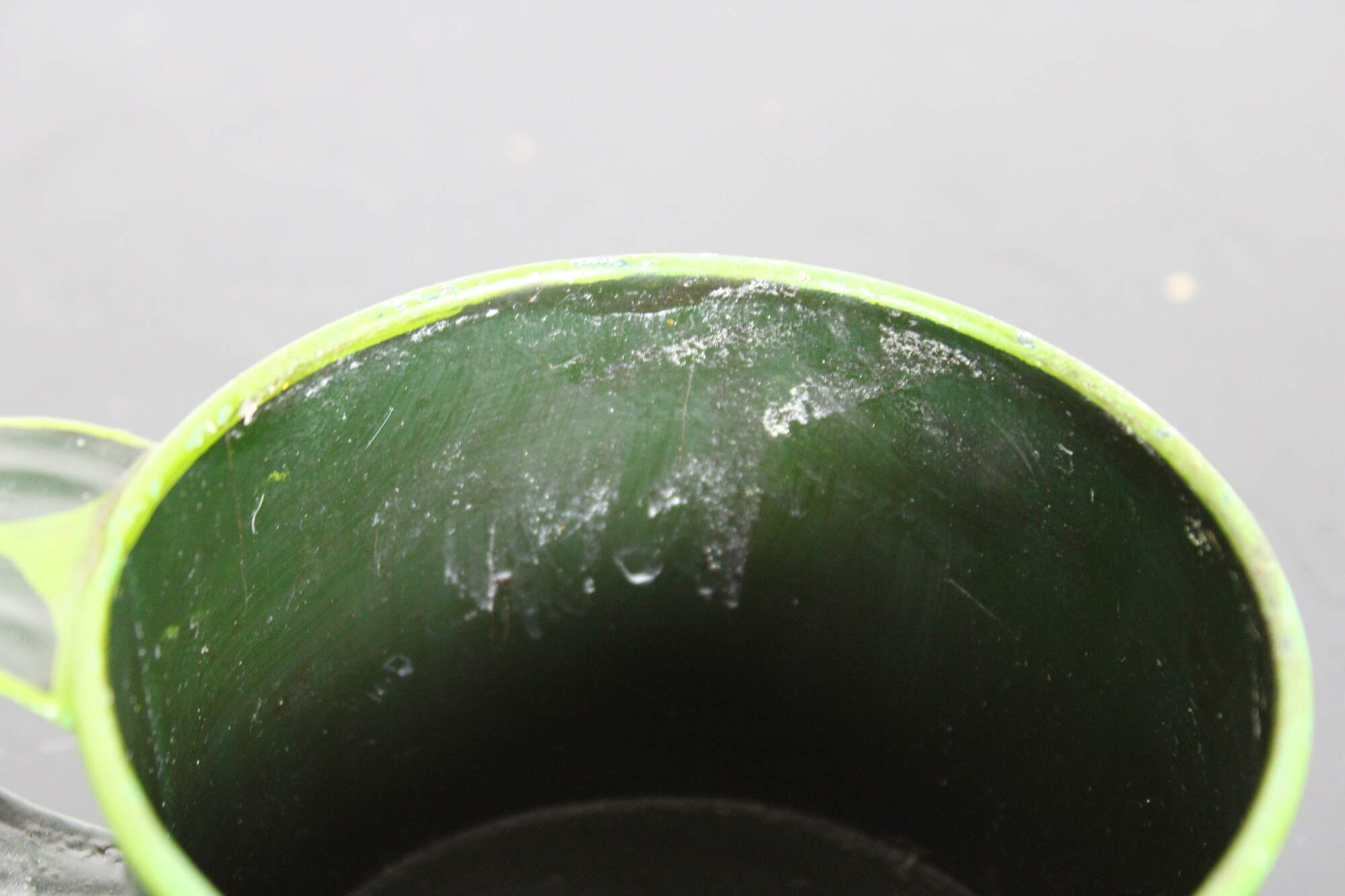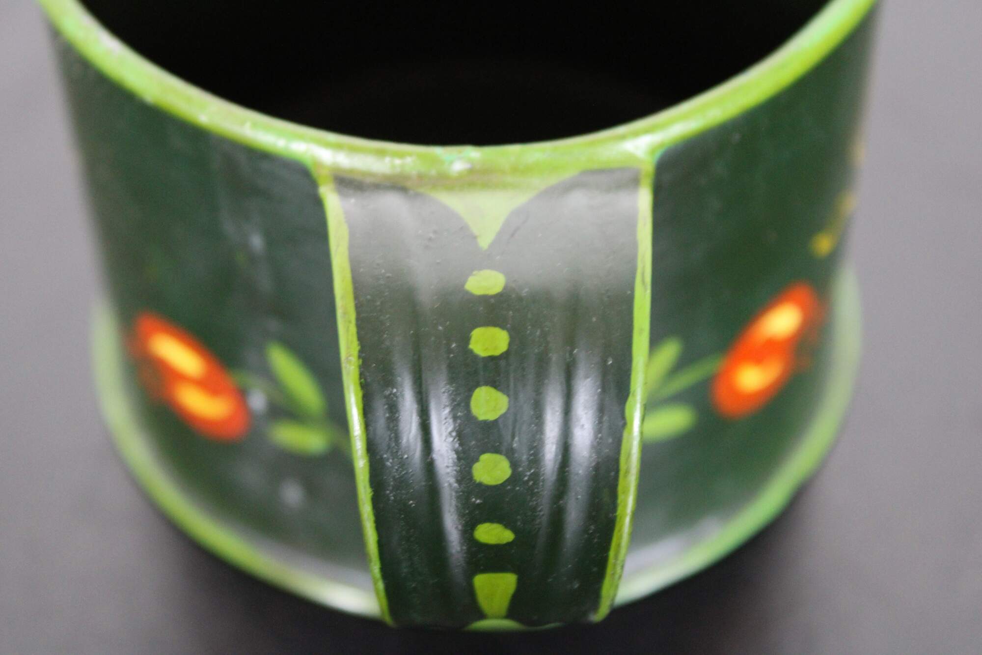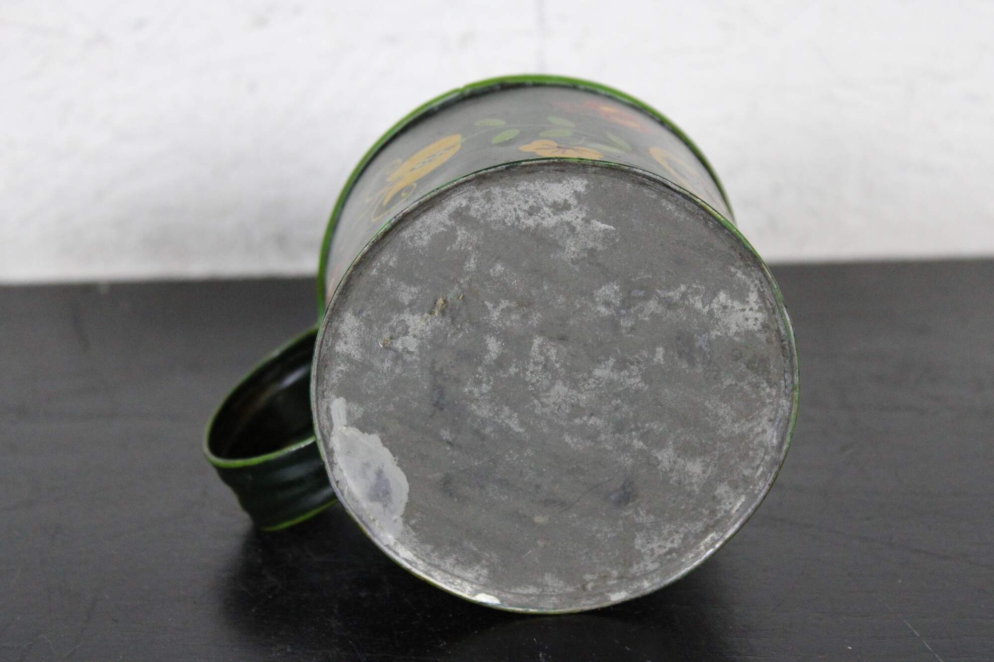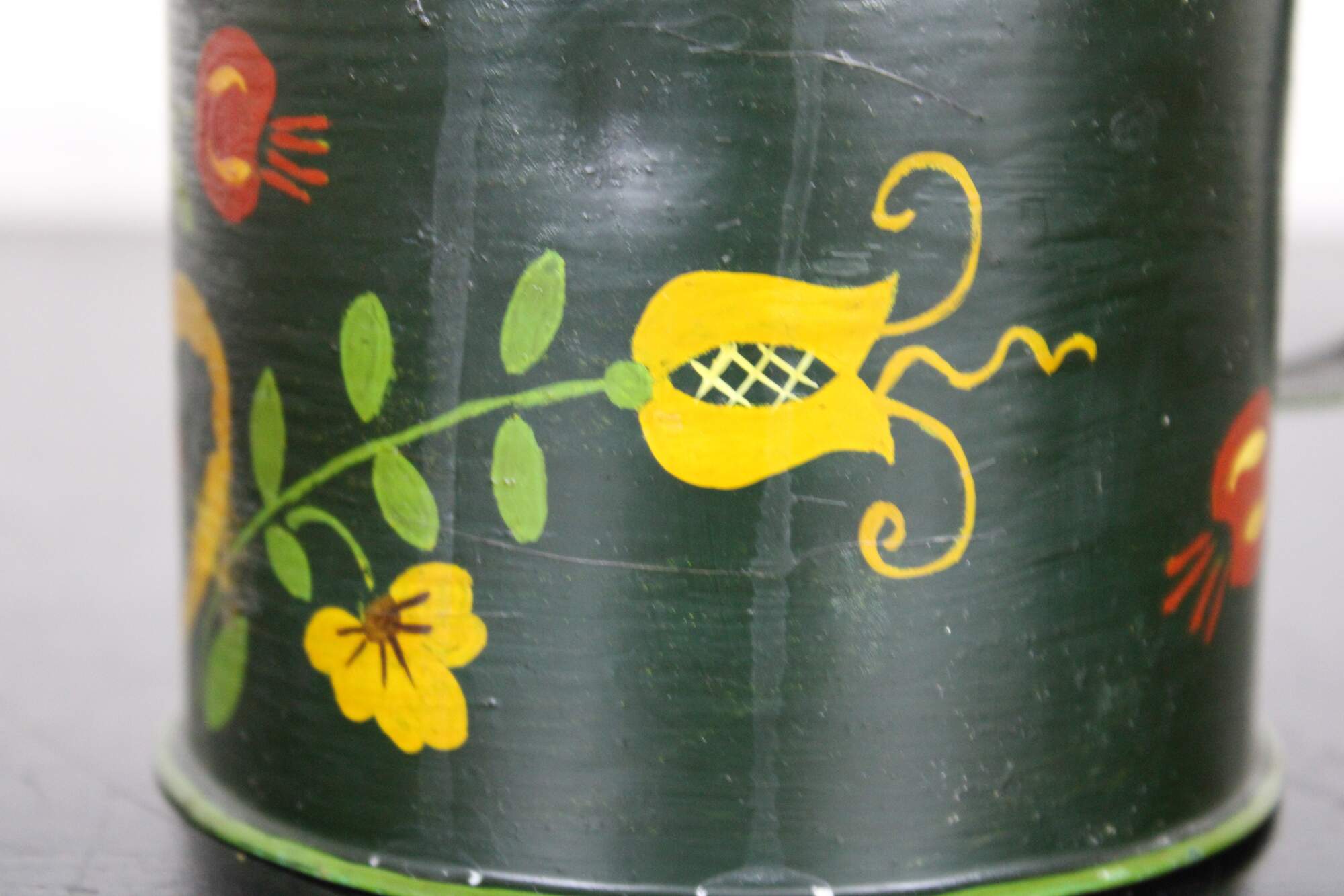 Vintage folk art style tin cup painted in shades of green with orange and yellow flowers; signed by artist “Mills” under handle.