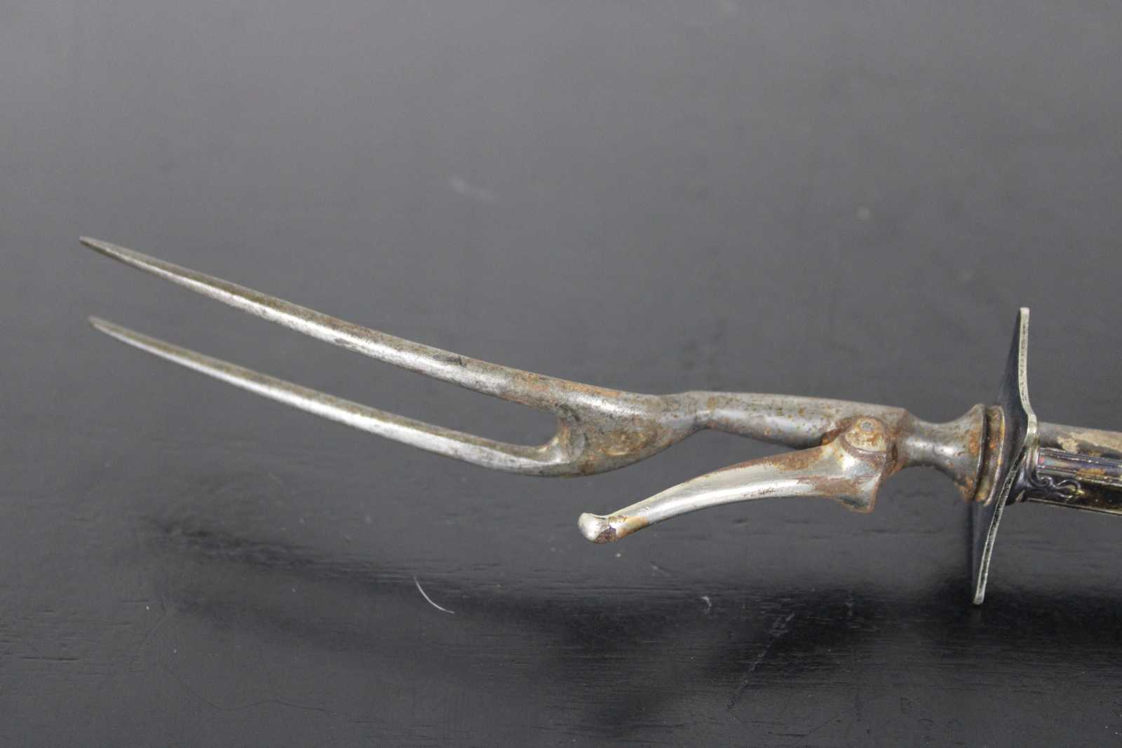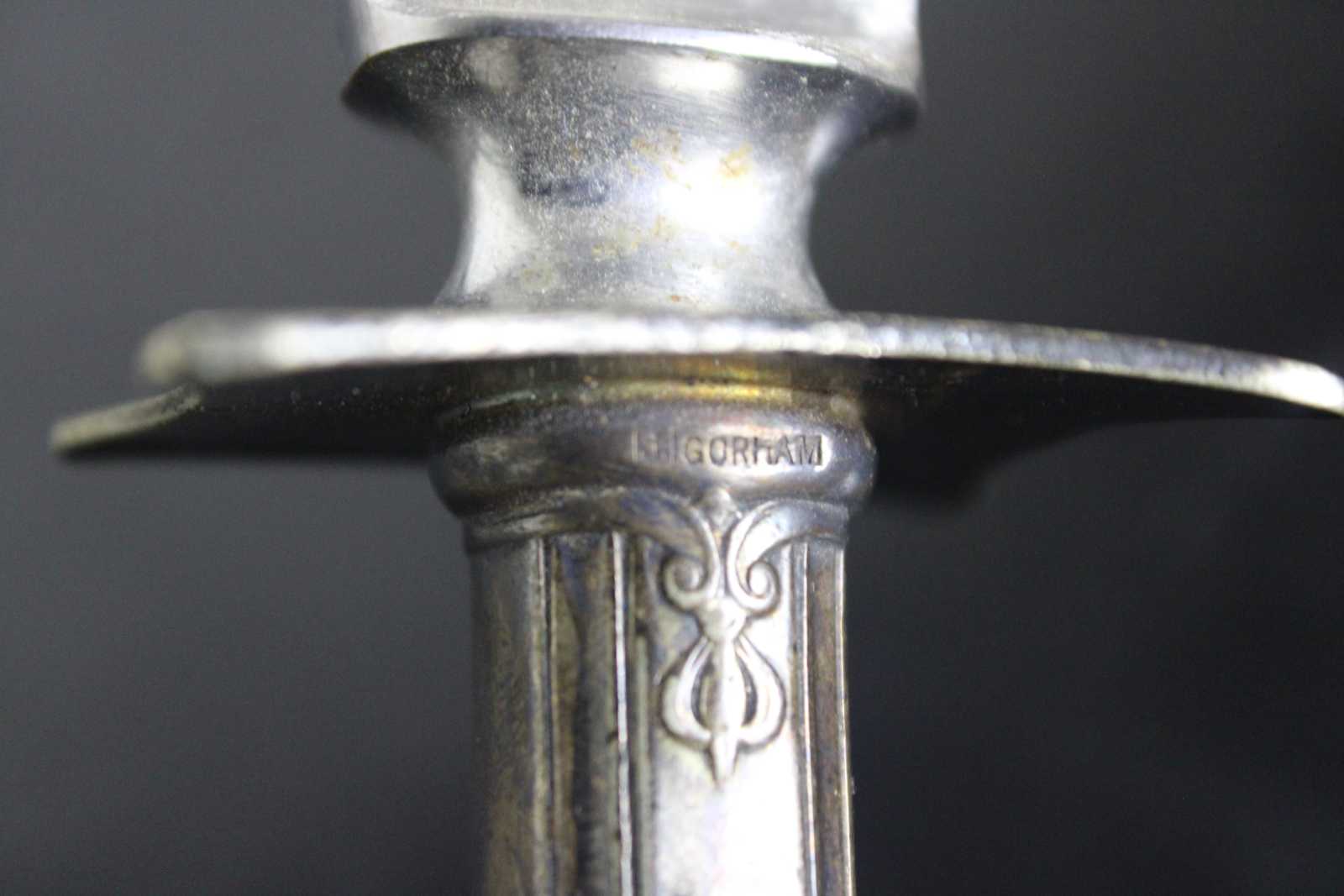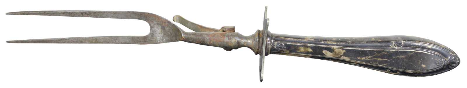 Antique silver plate carving knife and fork set by Gorham. “The Gorham Manufacturing Company is one of America’s largest manufacturers of silver-plate and sterling pieces, along with a foundry for bronze sculpture. Gorham got it’s start in 1831 with Jabez Gorham in partnership with Henry Webster. The two founded the silver company in Gorham’s hometown of Providence, Rhode Island. Their beginning was as a manufacturer of coin-silver flatware in which Gorham started to gain acclaim, especially in 1859 once the flatware was selected by Mary Todd Lincoln for the White House. In 1863, Gorham was a major player in plated silver. In 1868, they had made the switch from coin silver for sterling silver and produced everything from knives, forks and spoons, to other desired pieces such as coffee pots and serving bowls. Again, highly desired by several White House administrations, Mrs. Ulysses S. Grant asked Gorham to commemorate the country’s one-hundredth anniversary with a spectacular century vase.”
