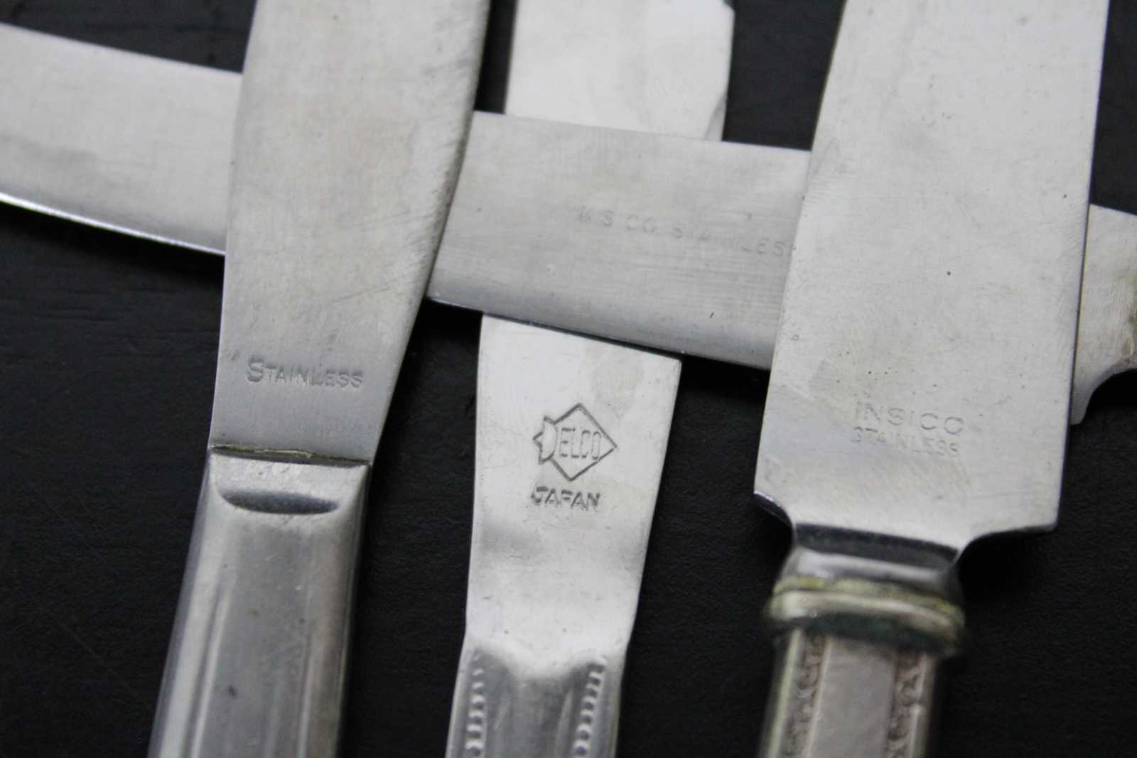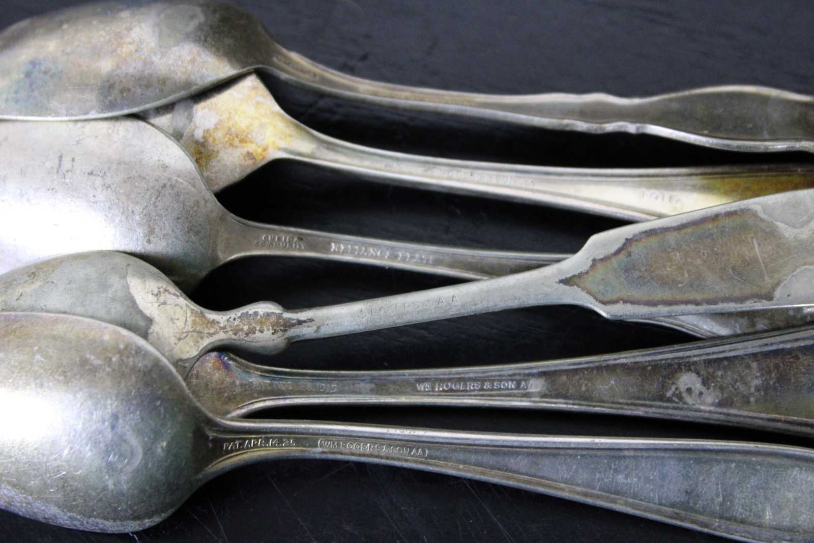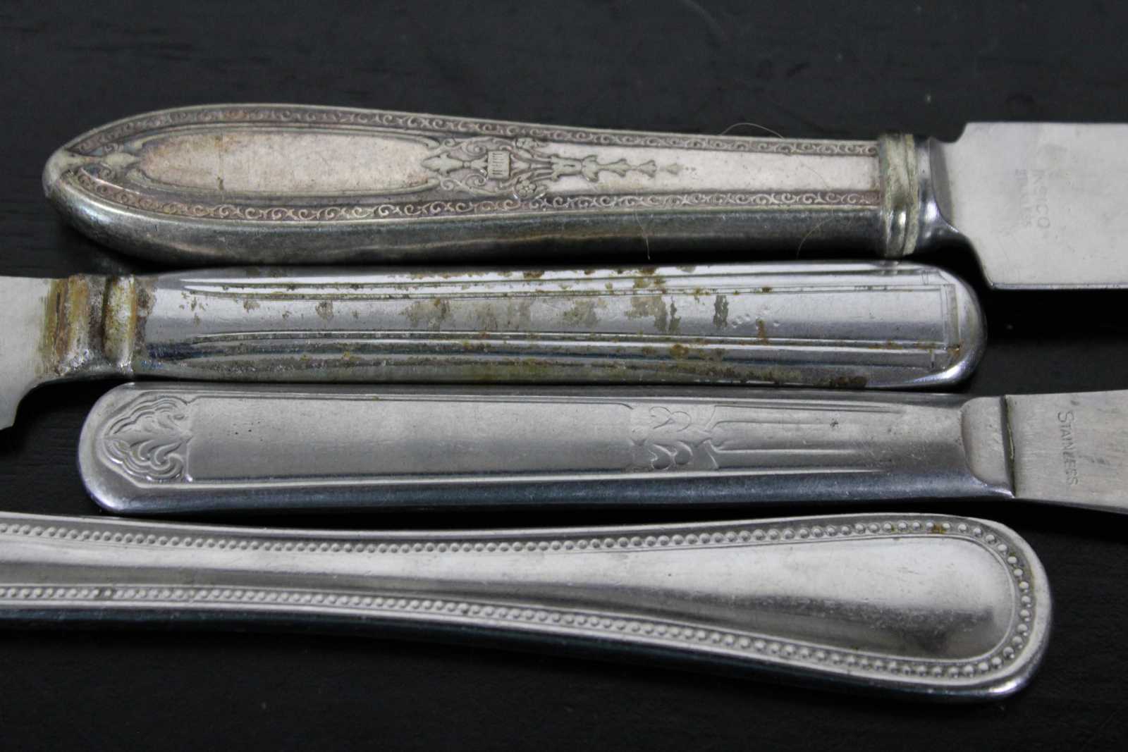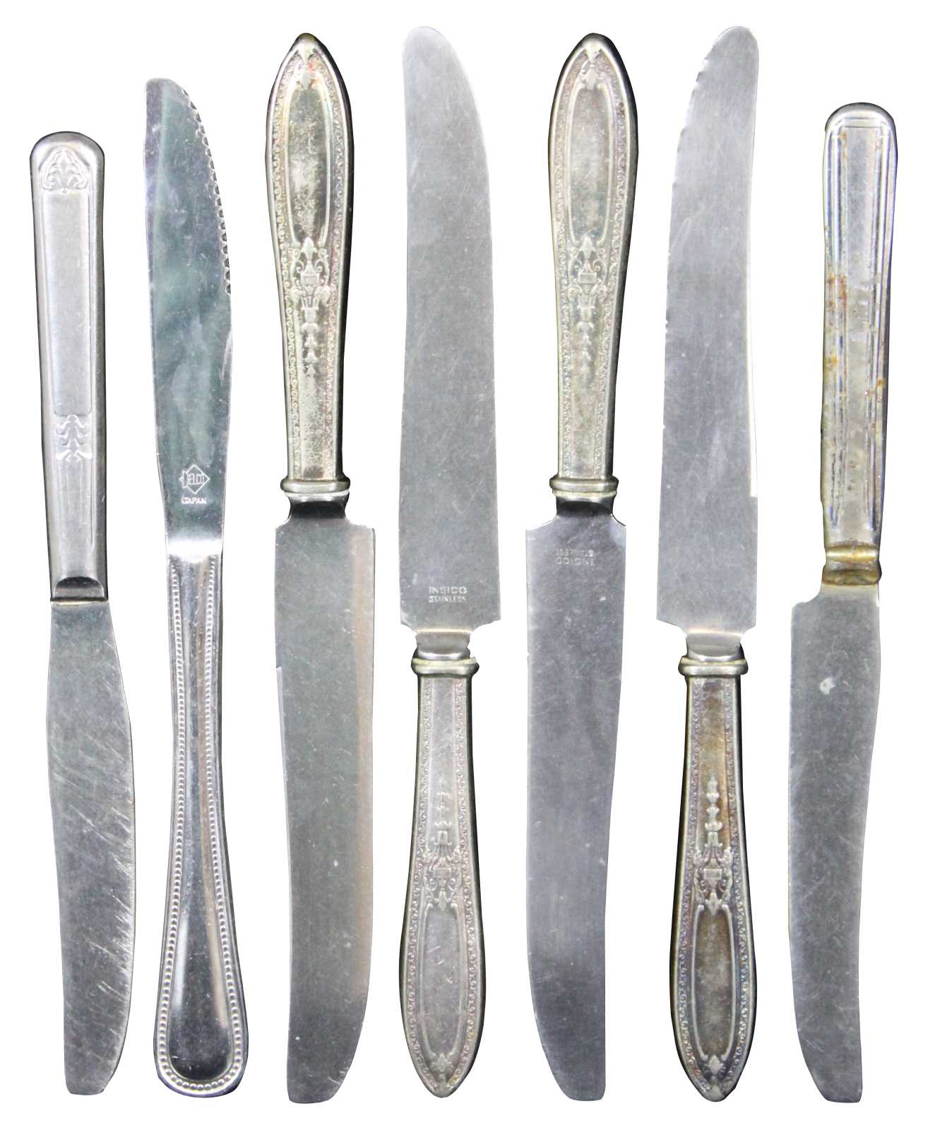 Vintage lot of 28 assorted silver plate and stainless steel flatware pieces by various manufacturers including Delco, Inisco, NS Co, Oneida, and William Rogers & Son. Lot includes 7 knives, 4 table spoons, 6 salad forks, and 11 tea spoons.