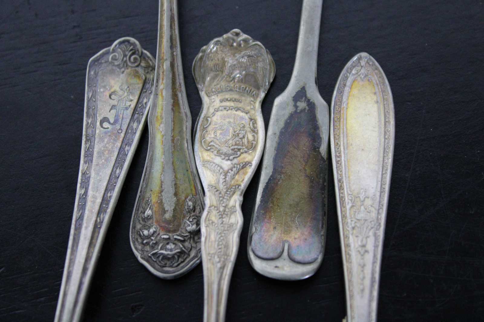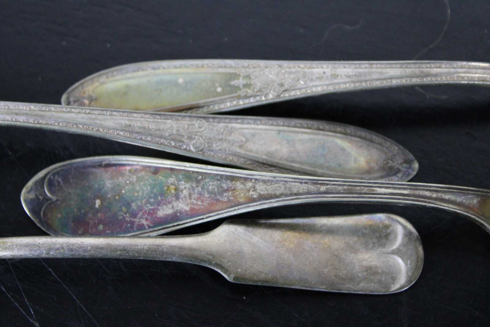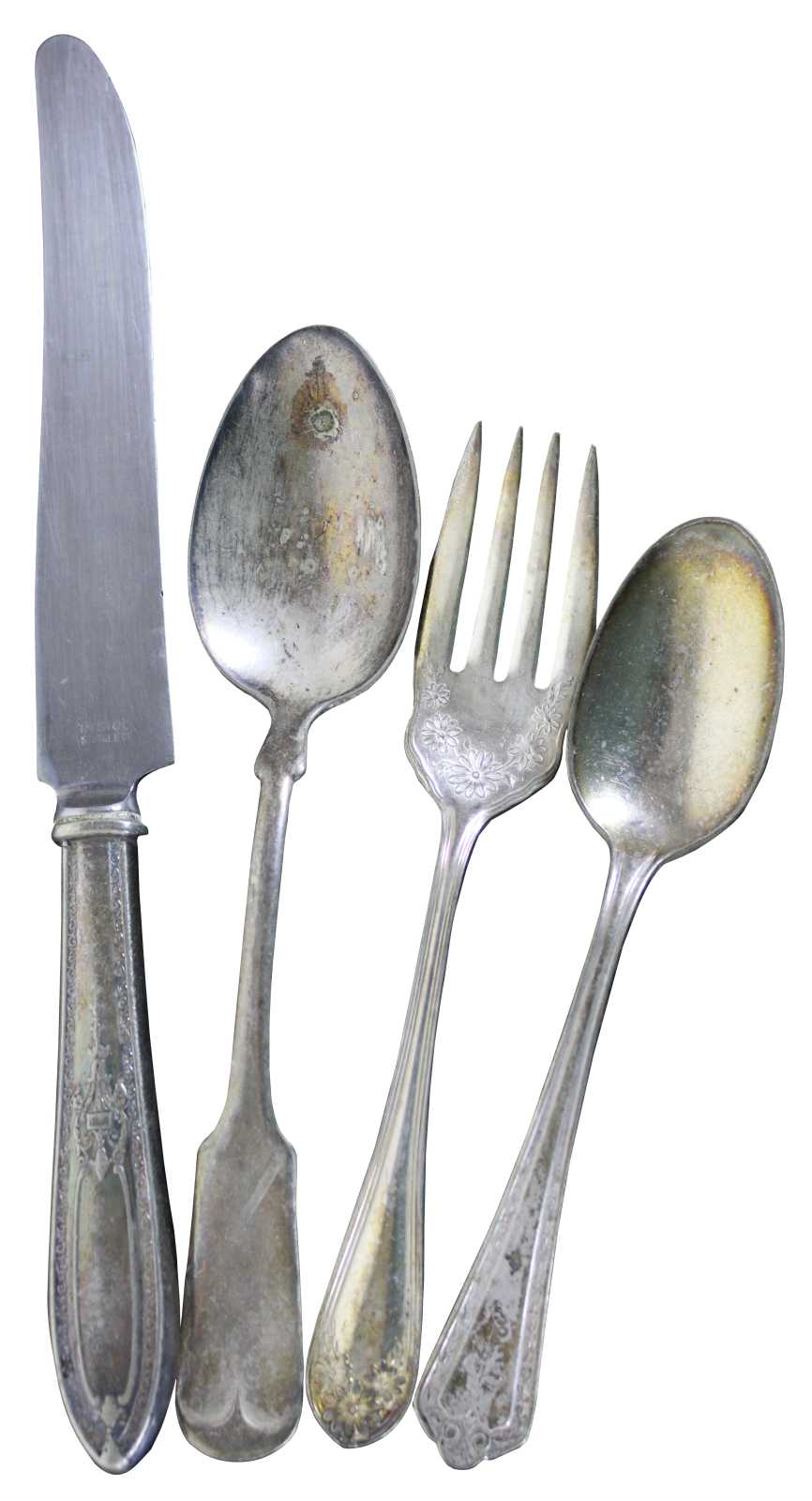 Vintage lot of 28 assorted silver plate and stainless steel flatware pieces by various manufacturers including Delco, Inisco, NS Co, Oneida, and William Rogers & Son. Lot includes 7 knives, 4 table spoons, 6 salad forks, and 11 tea spoons.