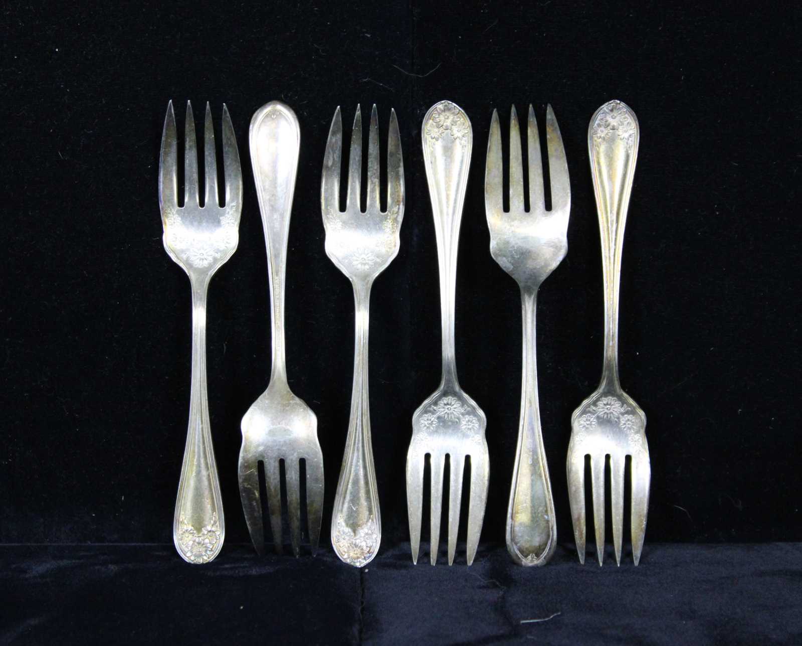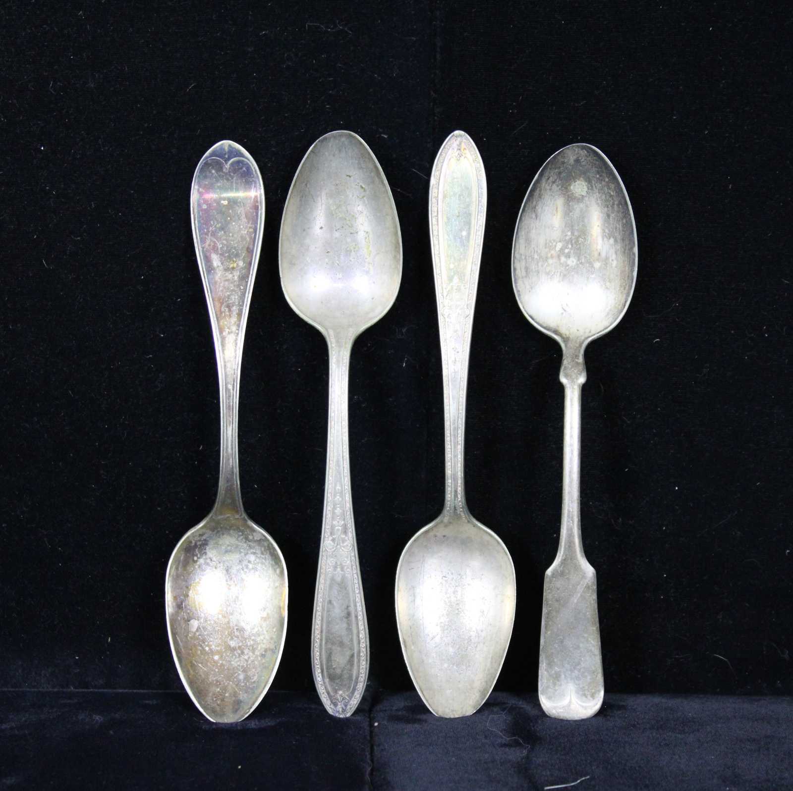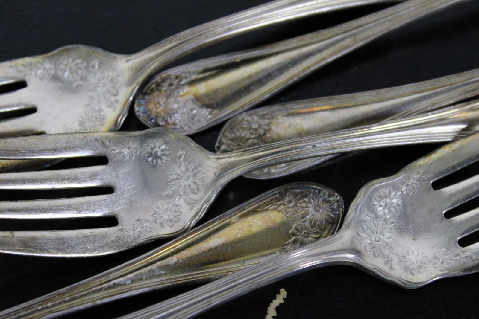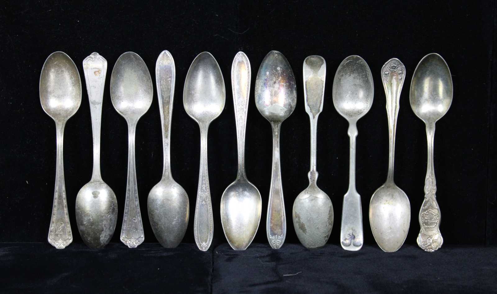 Vintage lot of 28 assorted silver plate and stainless steel flatware pieces by various manufacturers including Delco, Inisco, NS Co, Oneida, and William Rogers & Son. Lot includes 7 knives, 4 table spoons, 6 salad forks, and 11 tea spoons.