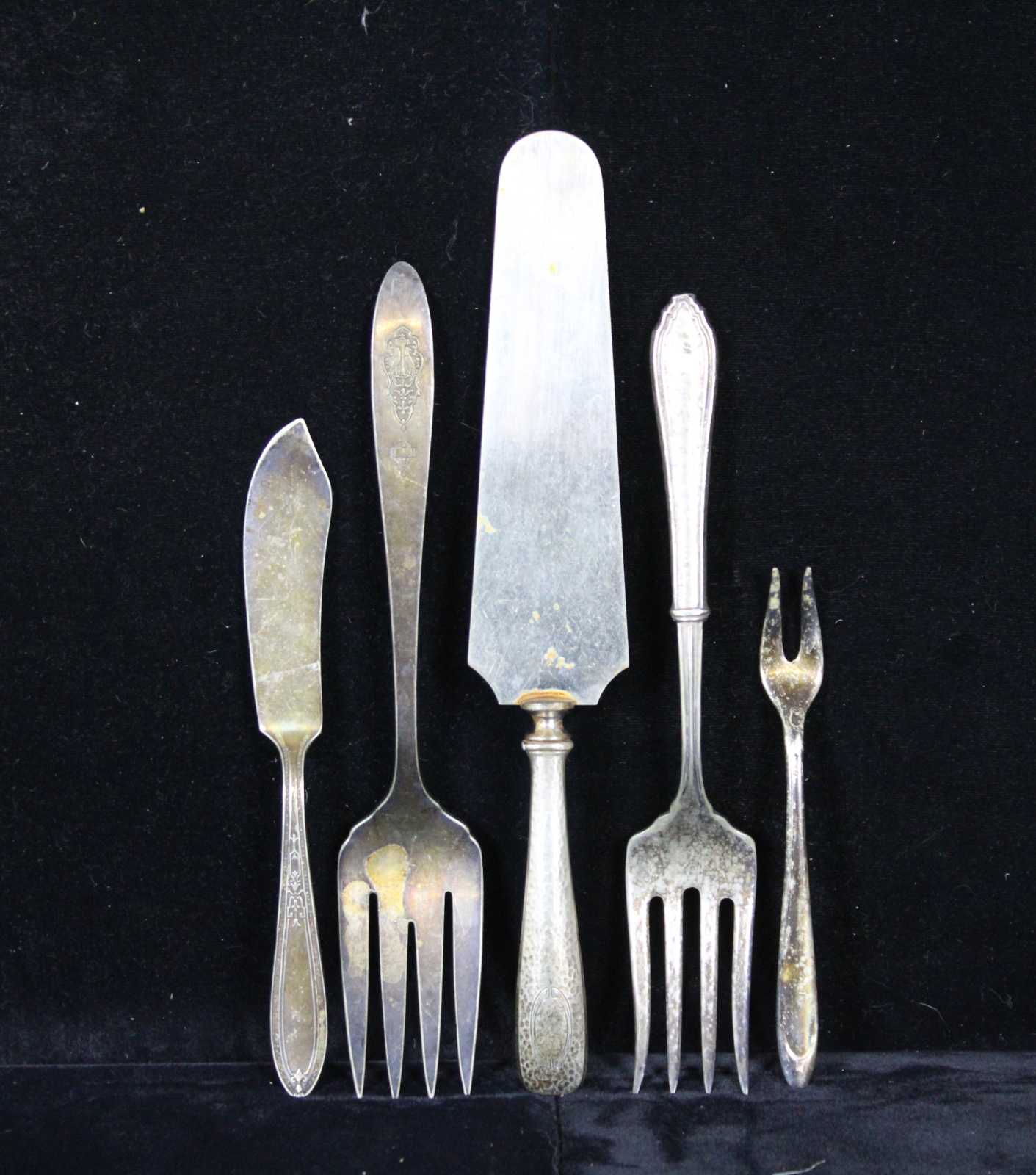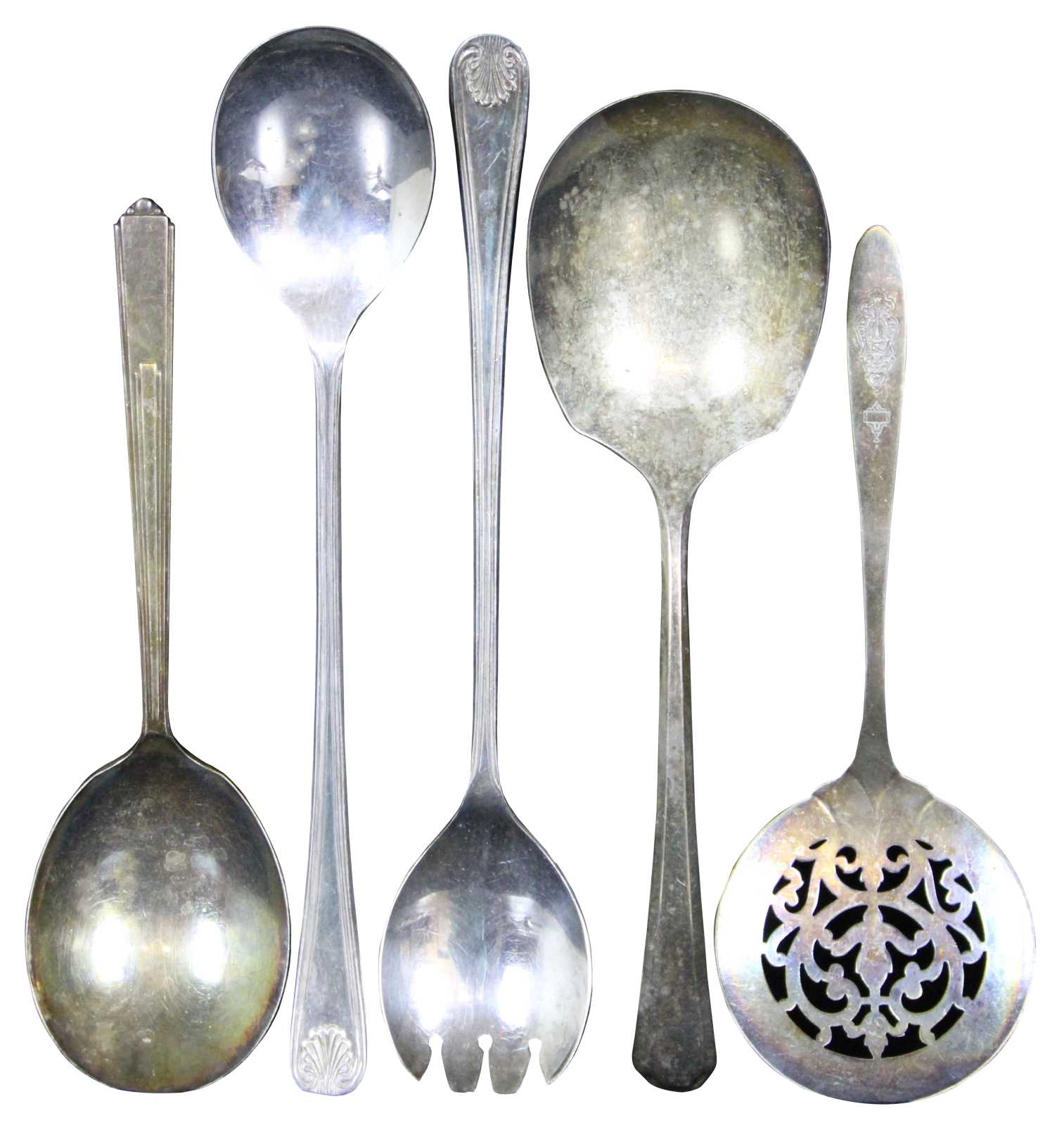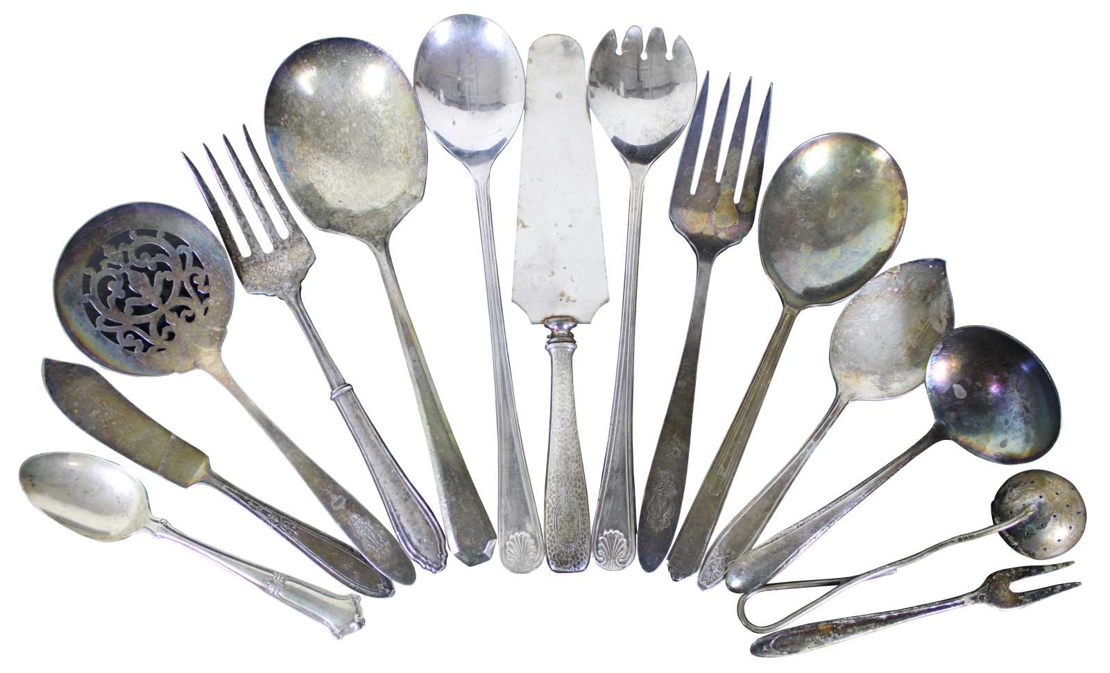 Antique lot of 12 assorted silver plate plus 2 sterling silver serving utensils by a variety of manufacturers including Reed & Barton, Community, and William Rogers. Lot includes a tea spoon, butter knife, slotted casserole spoon, 2 serving forks, 2 casserole spoons, a pair of salad tossers, cake knife, tomato server, ladle, tea strainer, and a pickle fork.