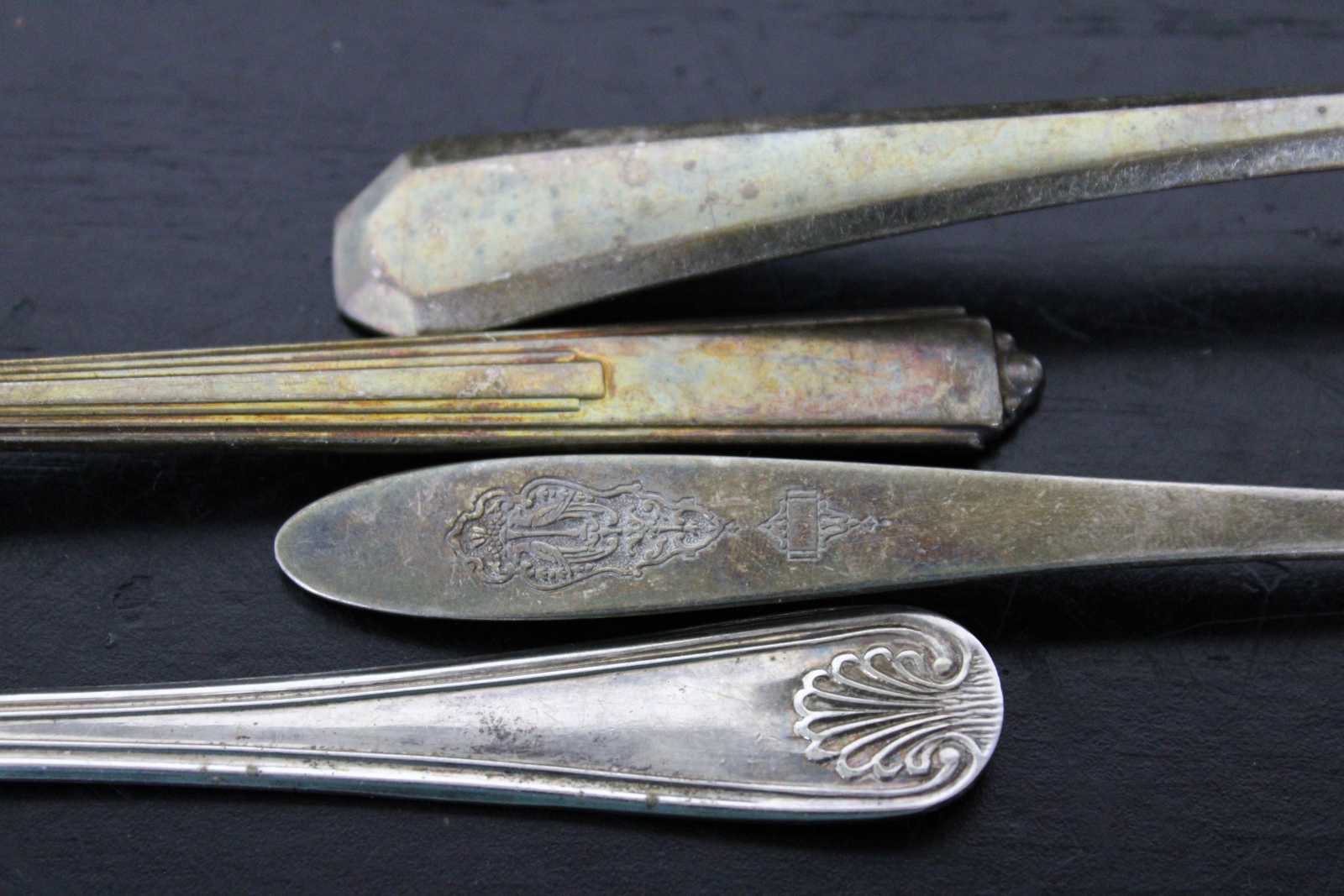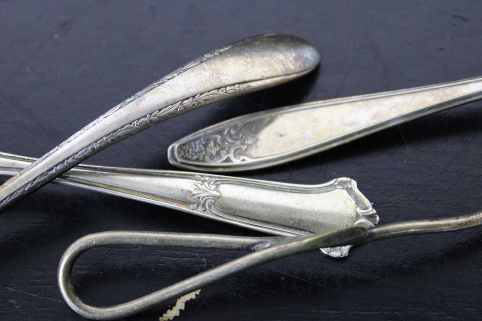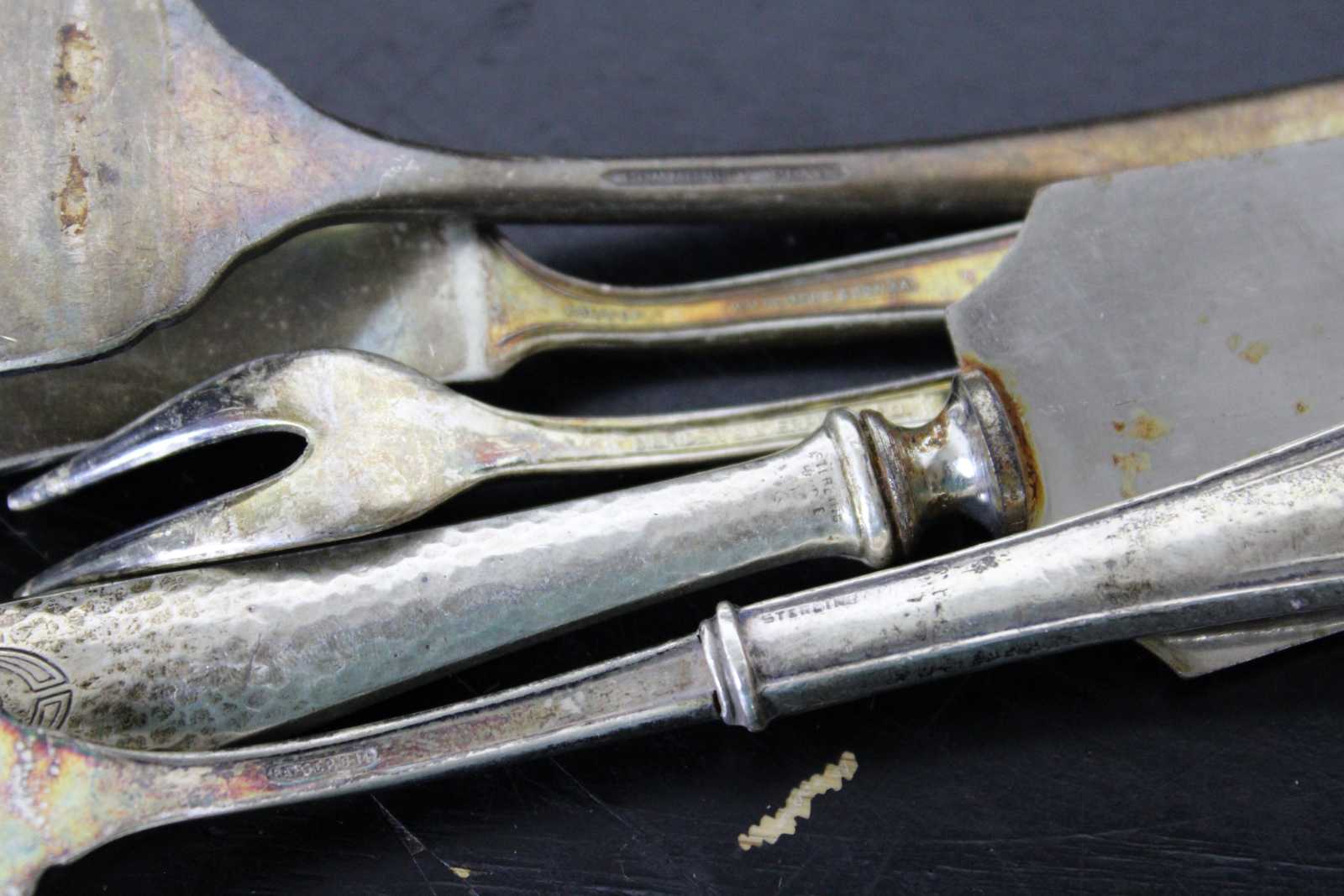 Antique lot of 12 assorted silver plate plus 2 sterling silver serving utensils by a variety of manufacturers including Reed & Barton, Community, and William Rogers. Lot includes a tea spoon, butter knife, slotted casserole spoon, 2 serving forks, 2 casserole spoons, a pair of salad tossers, cake knife, tomato server, ladle, tea strainer, and a pickle fork.