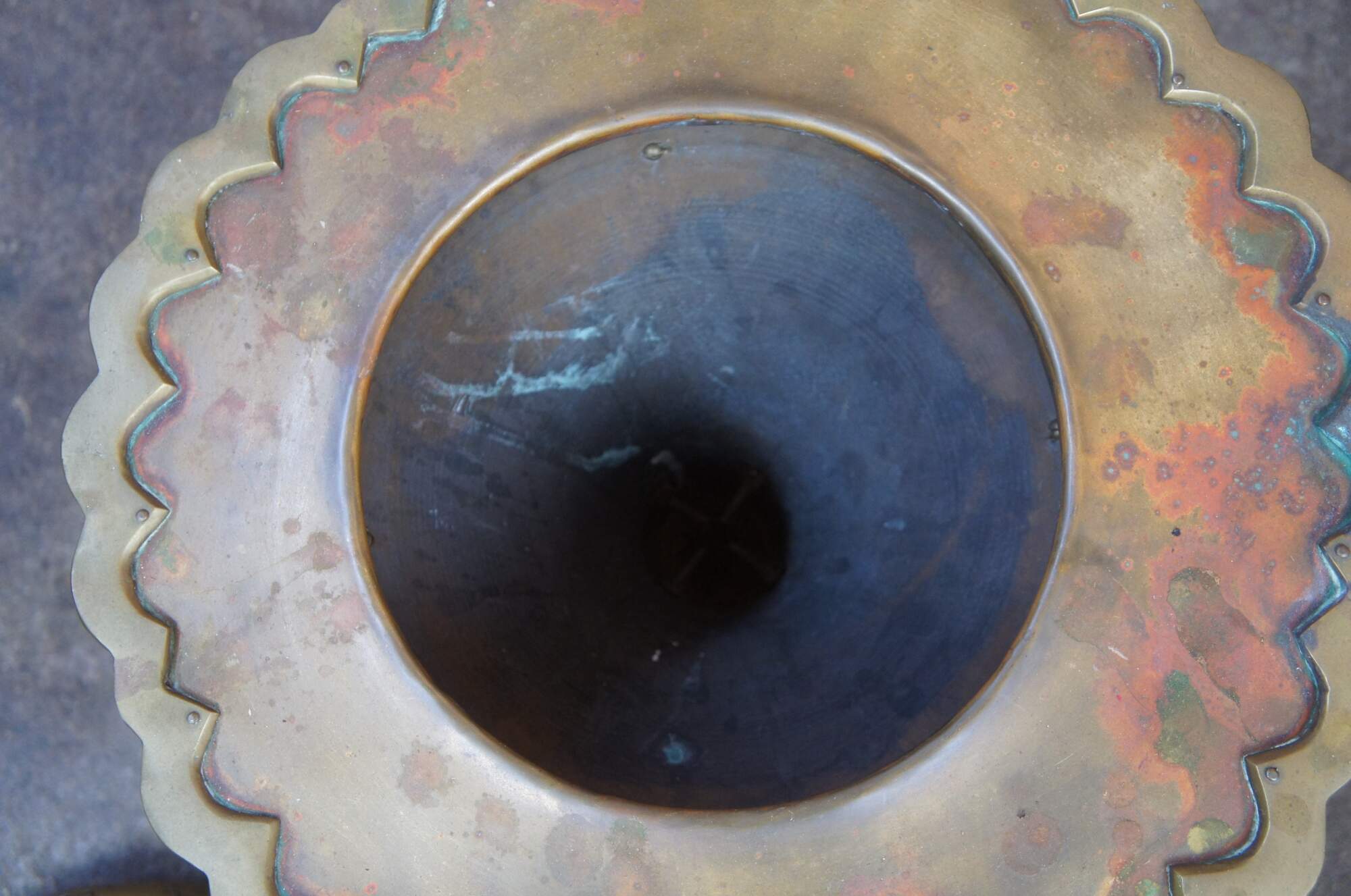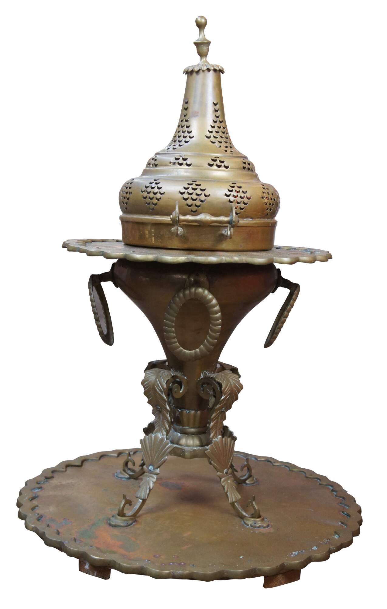 20th century tent warmer or brazier from the Middle East, Turkey or Morocco. Features reticulated brass/copper with separating pieces and wood reinforced base.