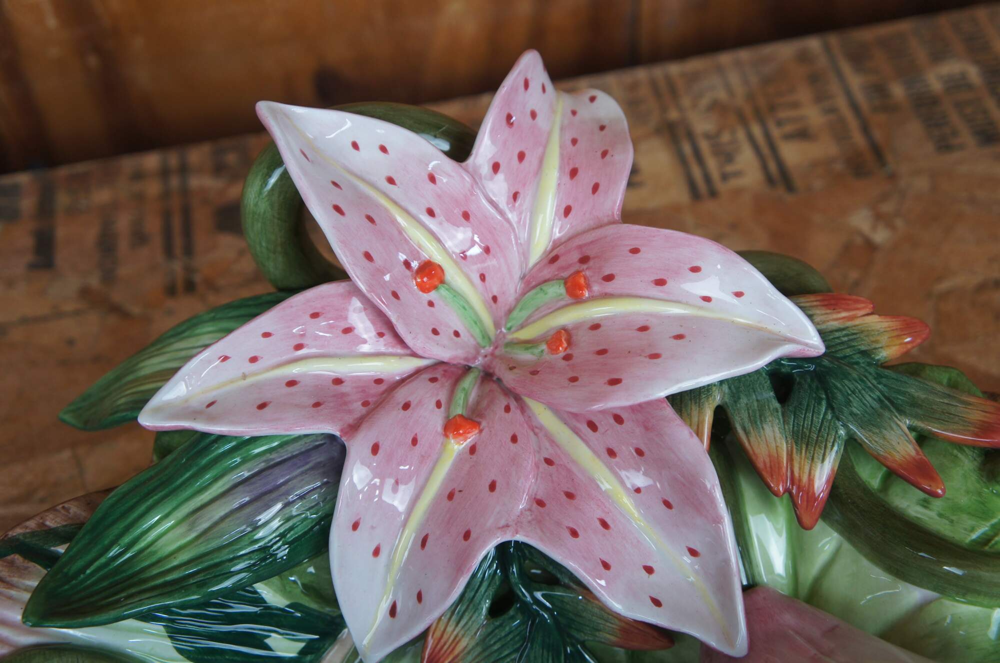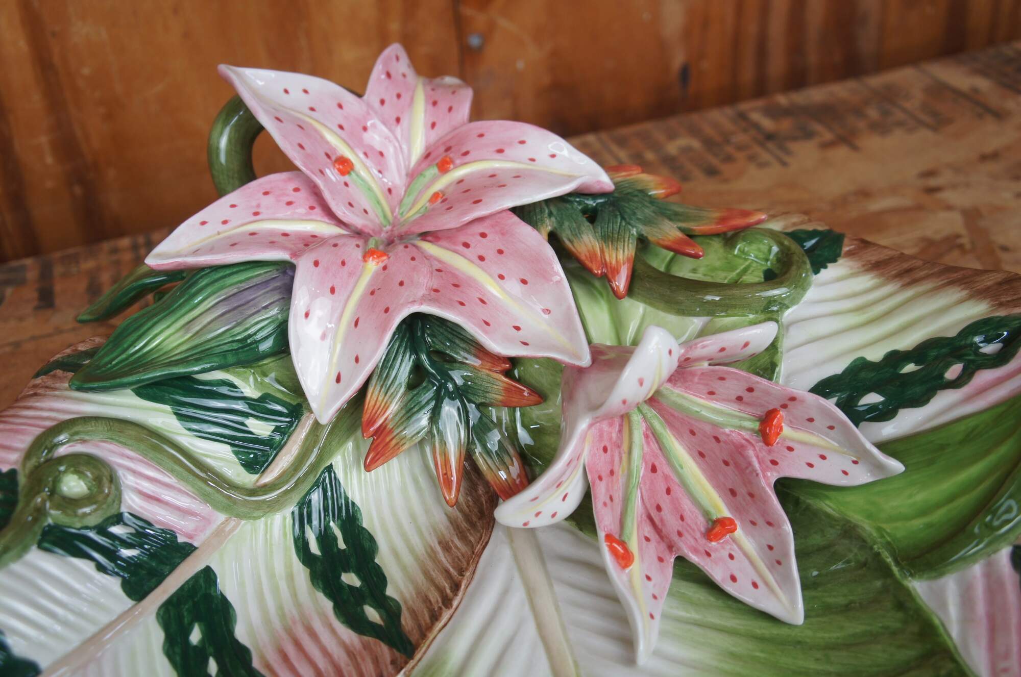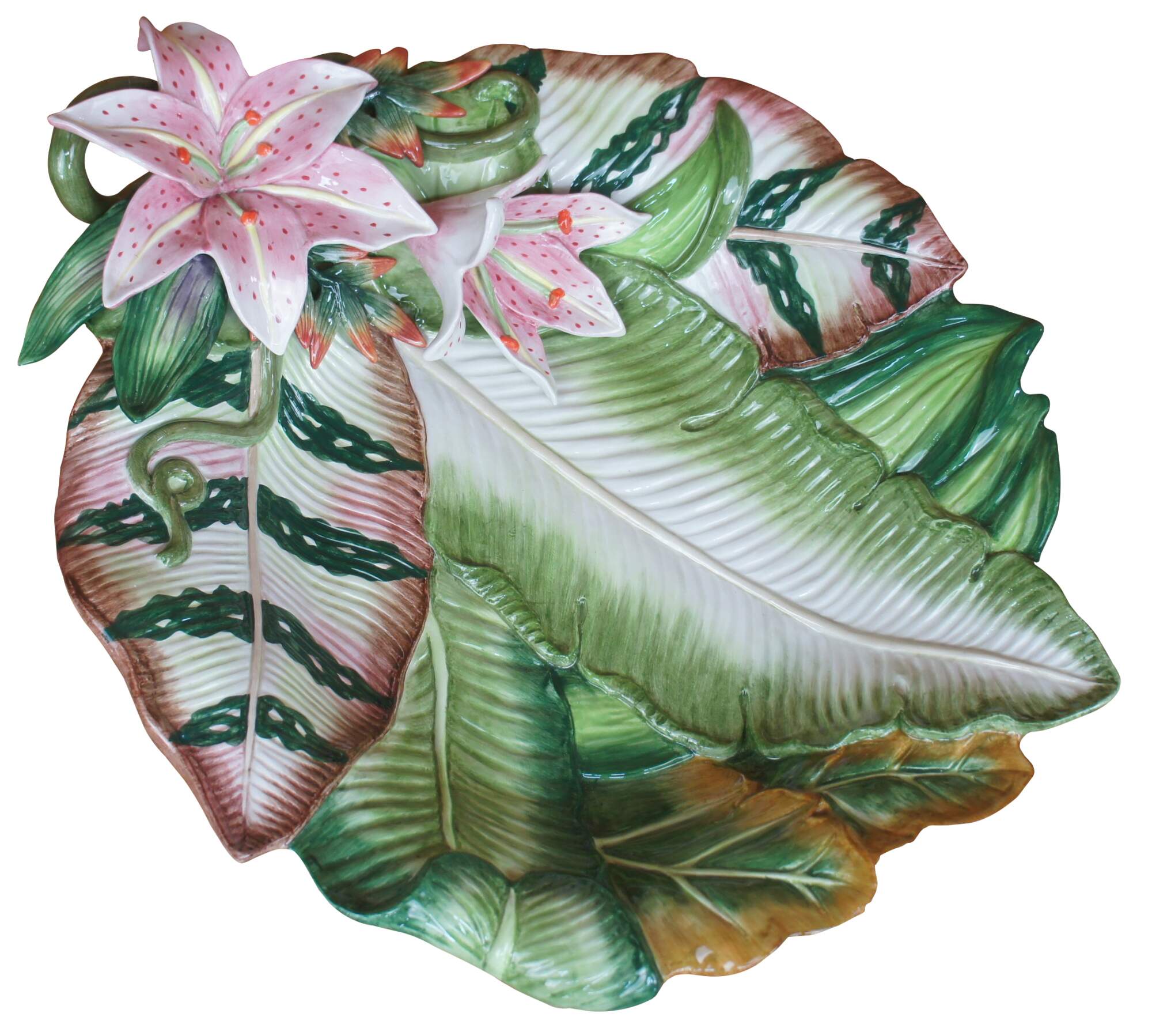 Fitz and Floyd Exotic Jungle Pink Lily ceramic platter decorated with bright and colorful Pink Lily flowers in high relief with round form