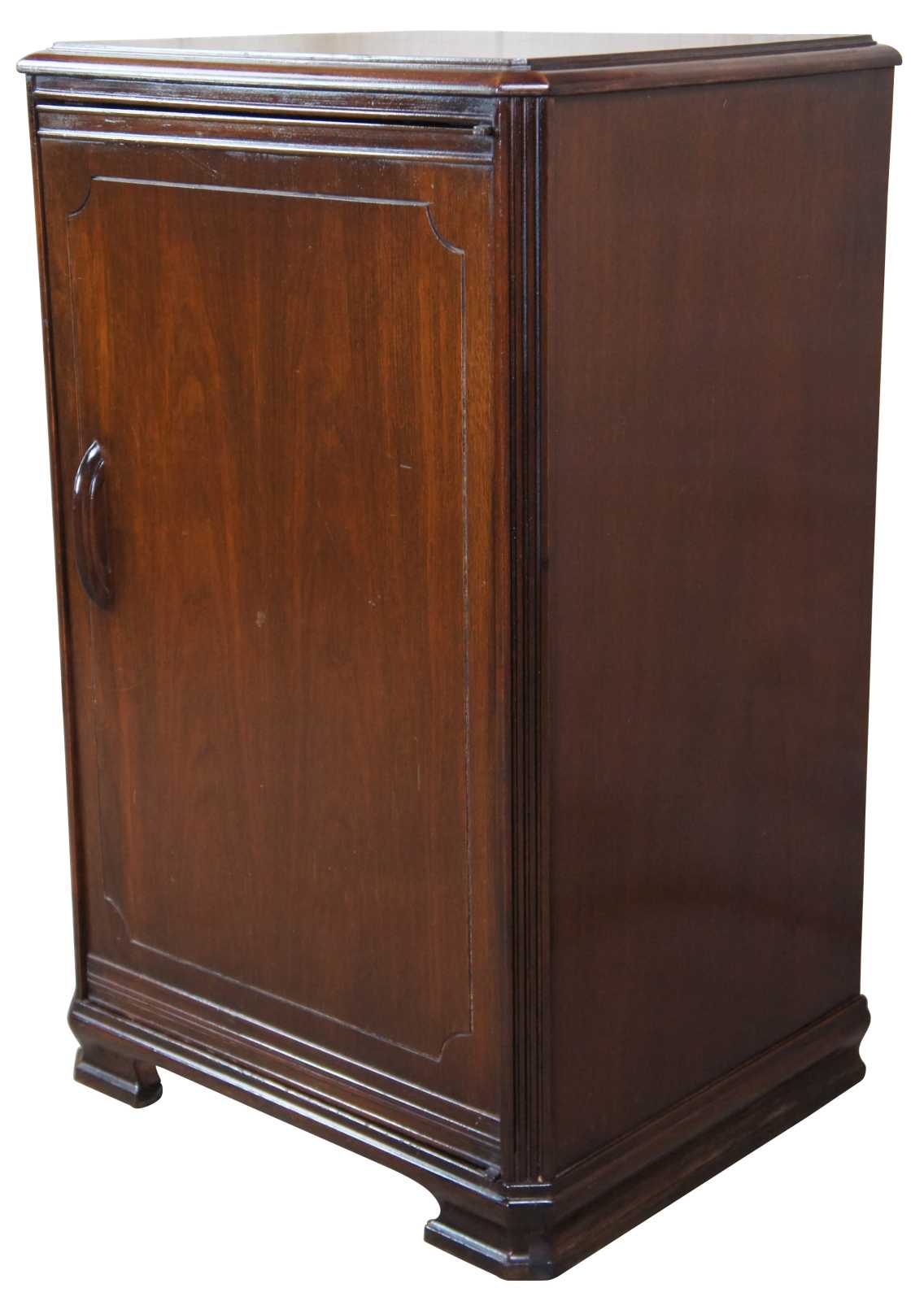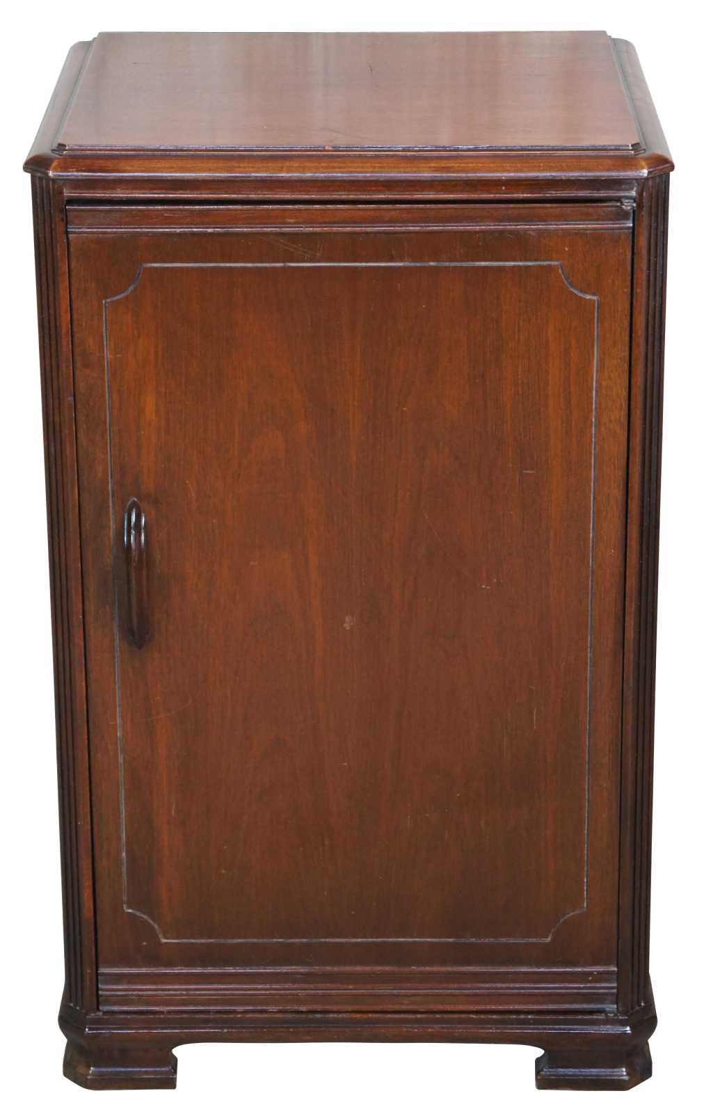 1940s Art Deco Continental Custom Built Cabinets pedestal record cabinet. Made of mahogany featuring fluted sides, bracket feet and divided interior shelves.