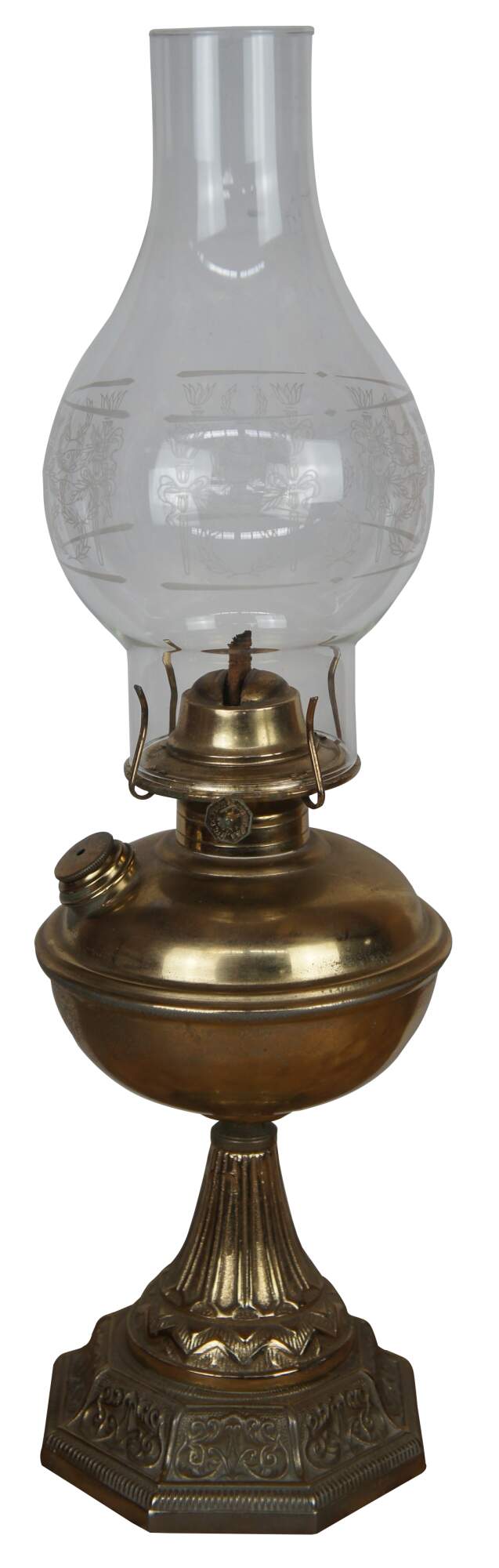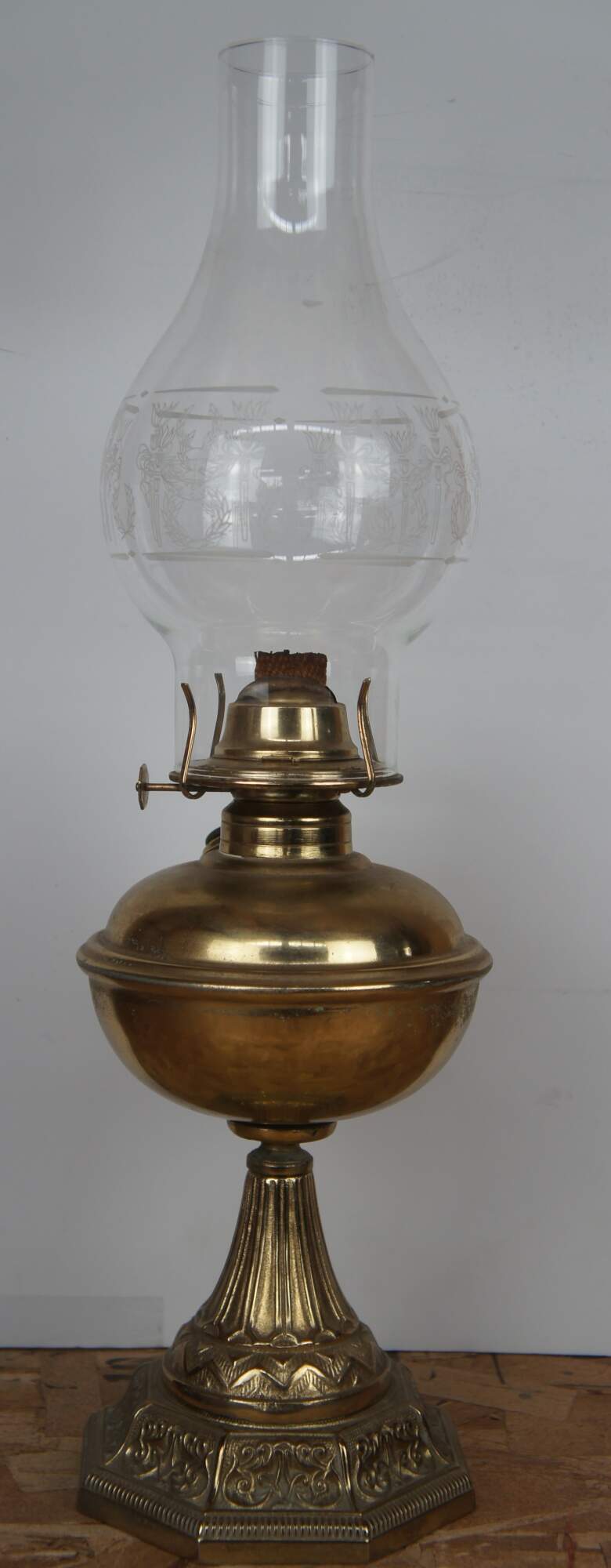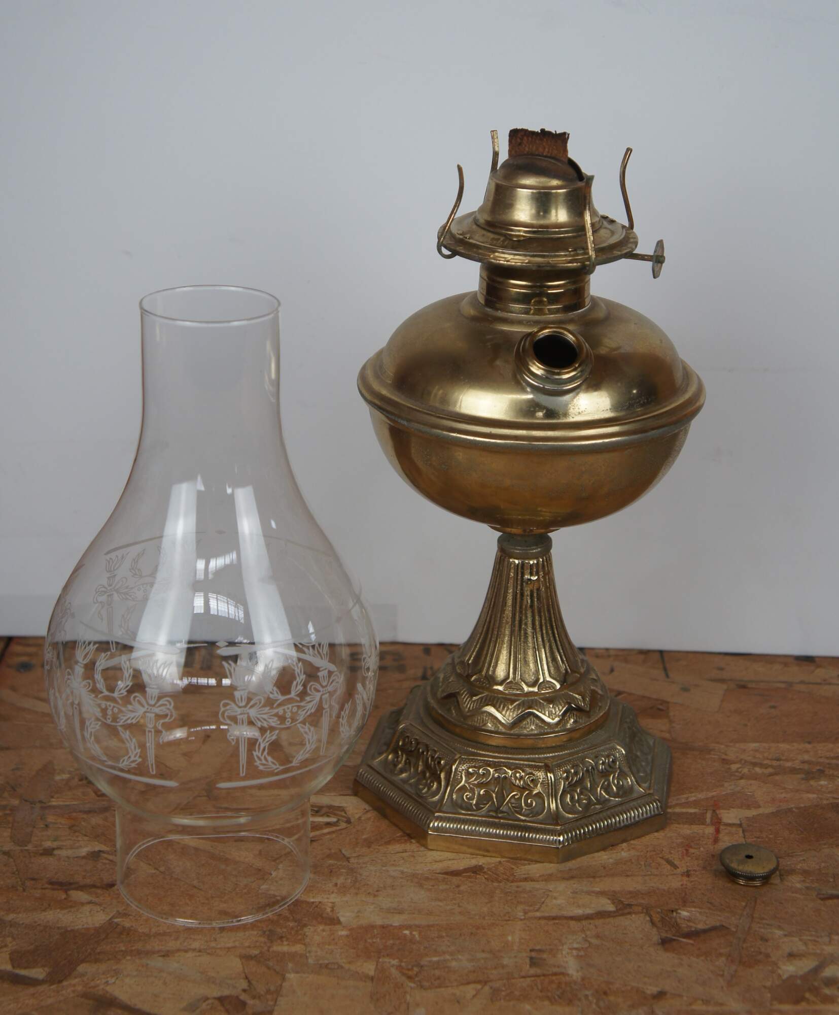 Oil/Kerosene/Paraffin lamp featuring shiny brass finish, fluted column and clear etched neoclassical style hurricane.