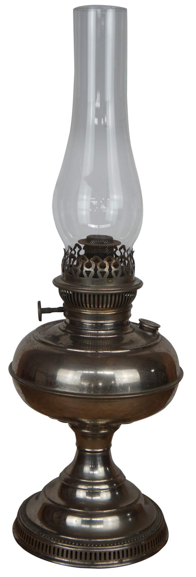 Oil or kerosene lamp with possible nickel plate made by Rayo features center draft design and clear hurricane glass on fluted column form.