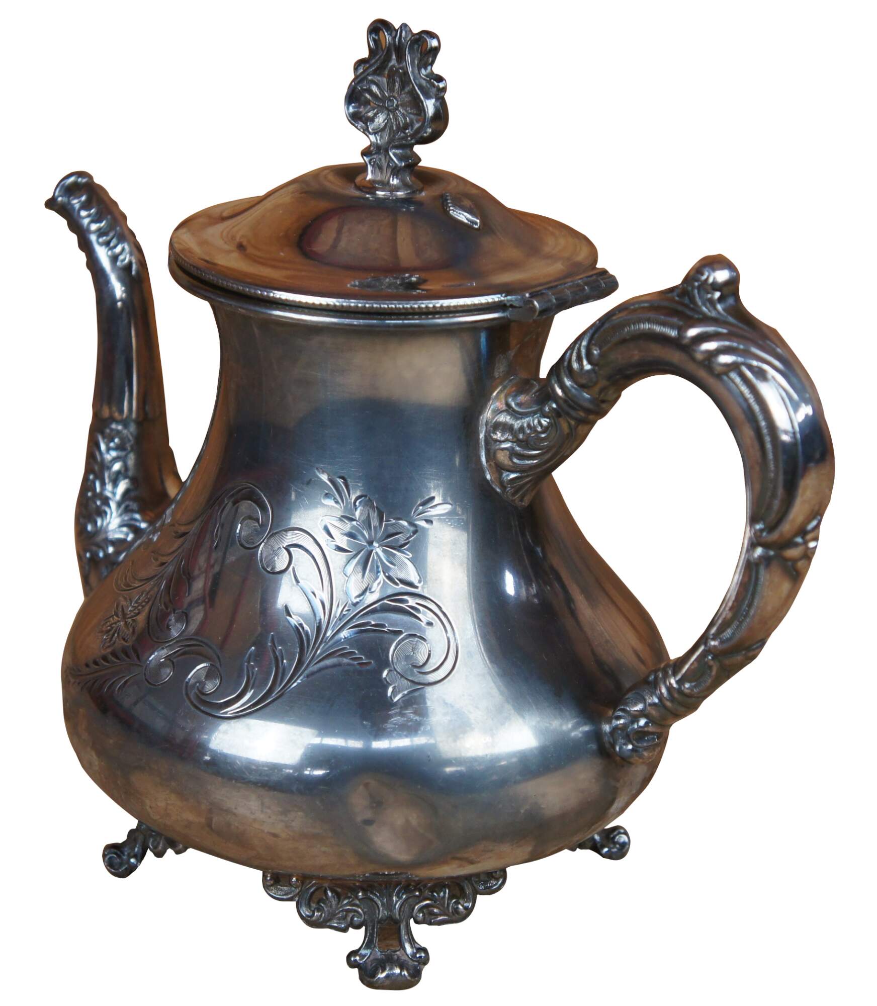 Quadruple plate silver teapot with repousse detailing by EG Webster exhibits the characteristic spiderwebs stamp on bottom as well as number 0677.