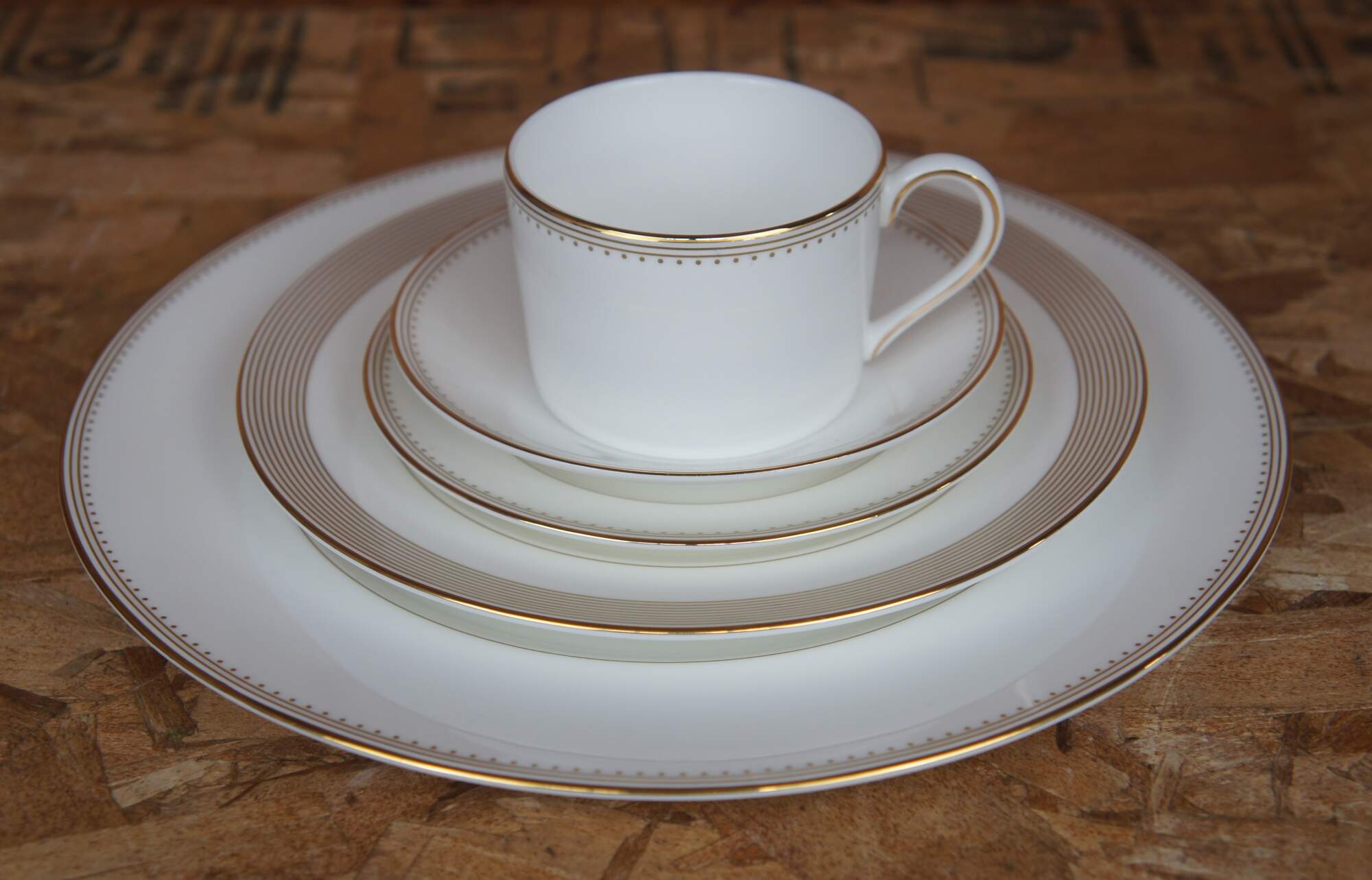 Beautiful like new 40 piece china set, ‘Golden Grosgrain’ pattern by Vera Wang from Wedgwood China. Set includes place setting for 8, tea/coffee cups, saucers, bread plates, salad plates and dinner plates.