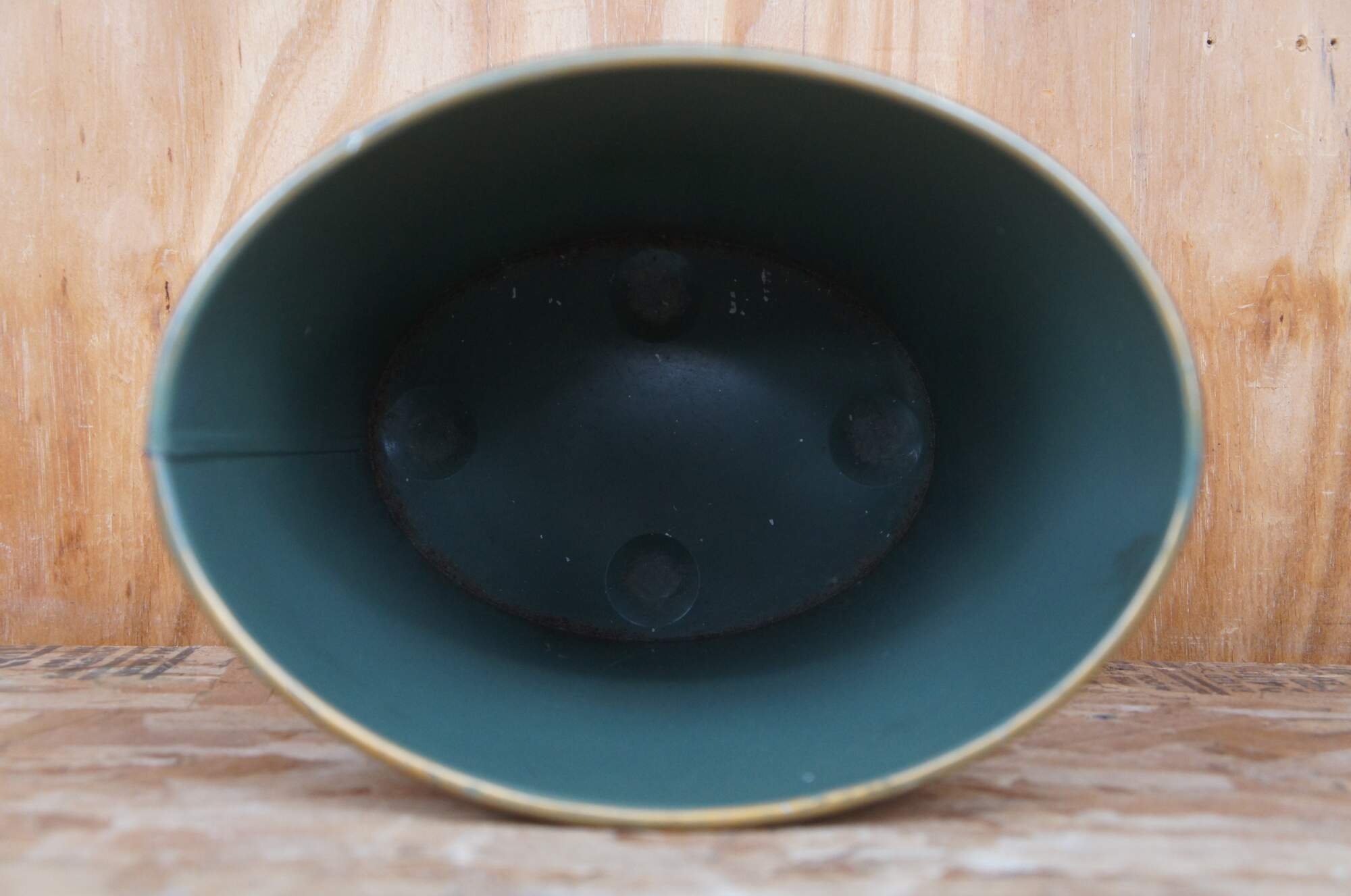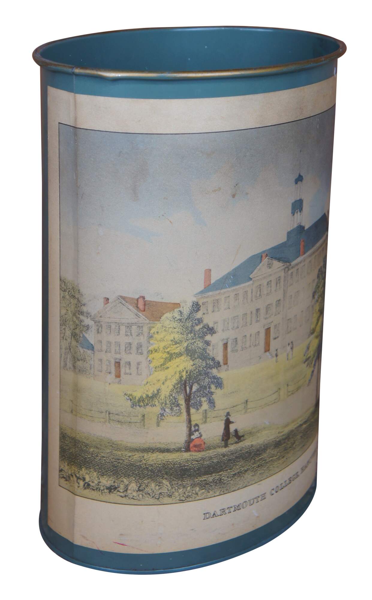 This waste can appears to be handmade and features a poster of Dartmouth College mâchéd to it. Made by Keller Charles of Philadelphia