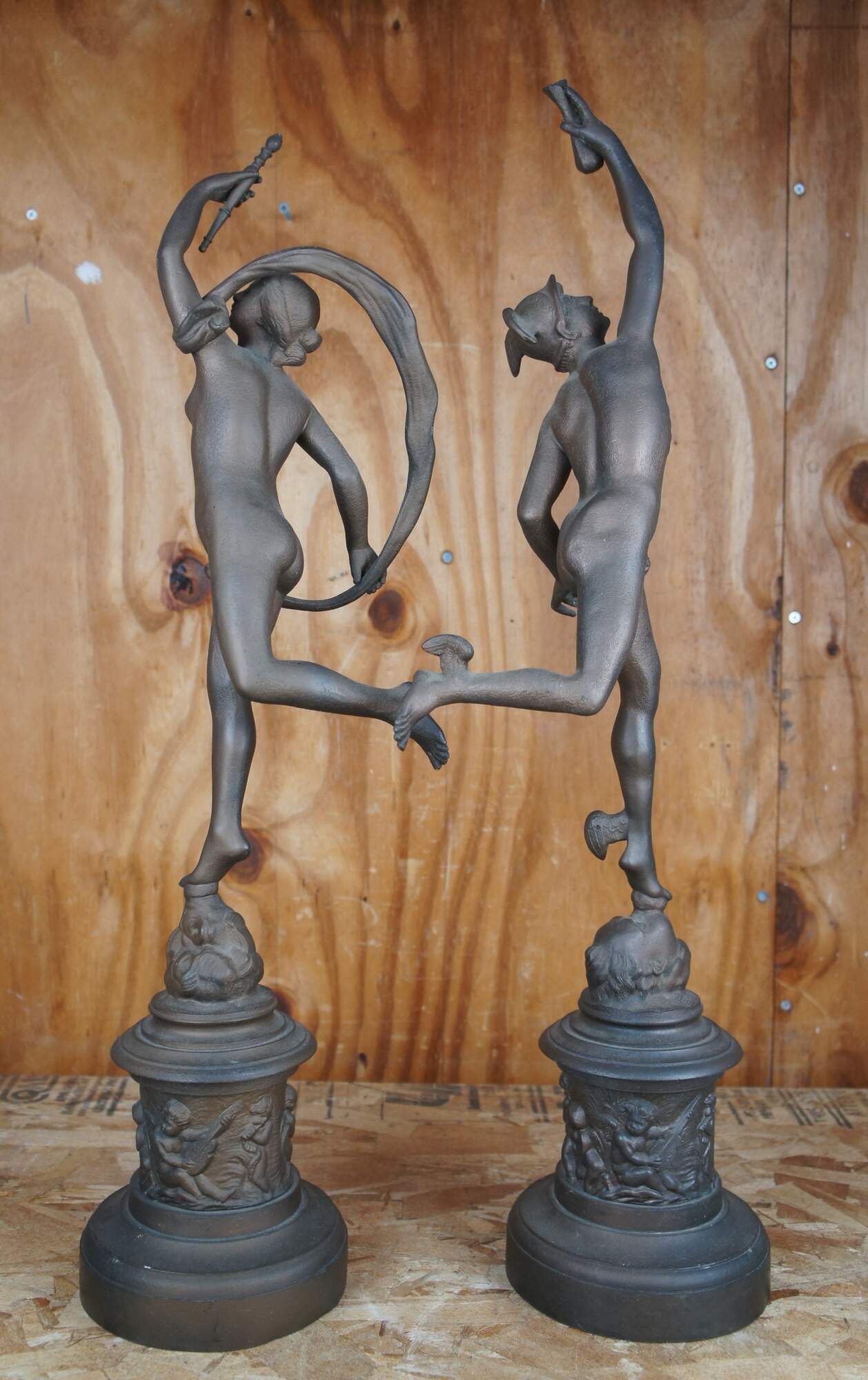 This metal sculpture of Fortuna, the goddess of fortune and luck, and Mercury the messenger of the Gods, after the famous Renaissance statue in Florence, Italy. The renowned sculptor of the original, Giovanni de Giambologna lived 1529-1608.This antique work of art has a rich original deep chocolate patina. Both are raised on high relief circular plinths having scenes with cherubic The movement and grace of the figures are unforgettable. circa 1920s.