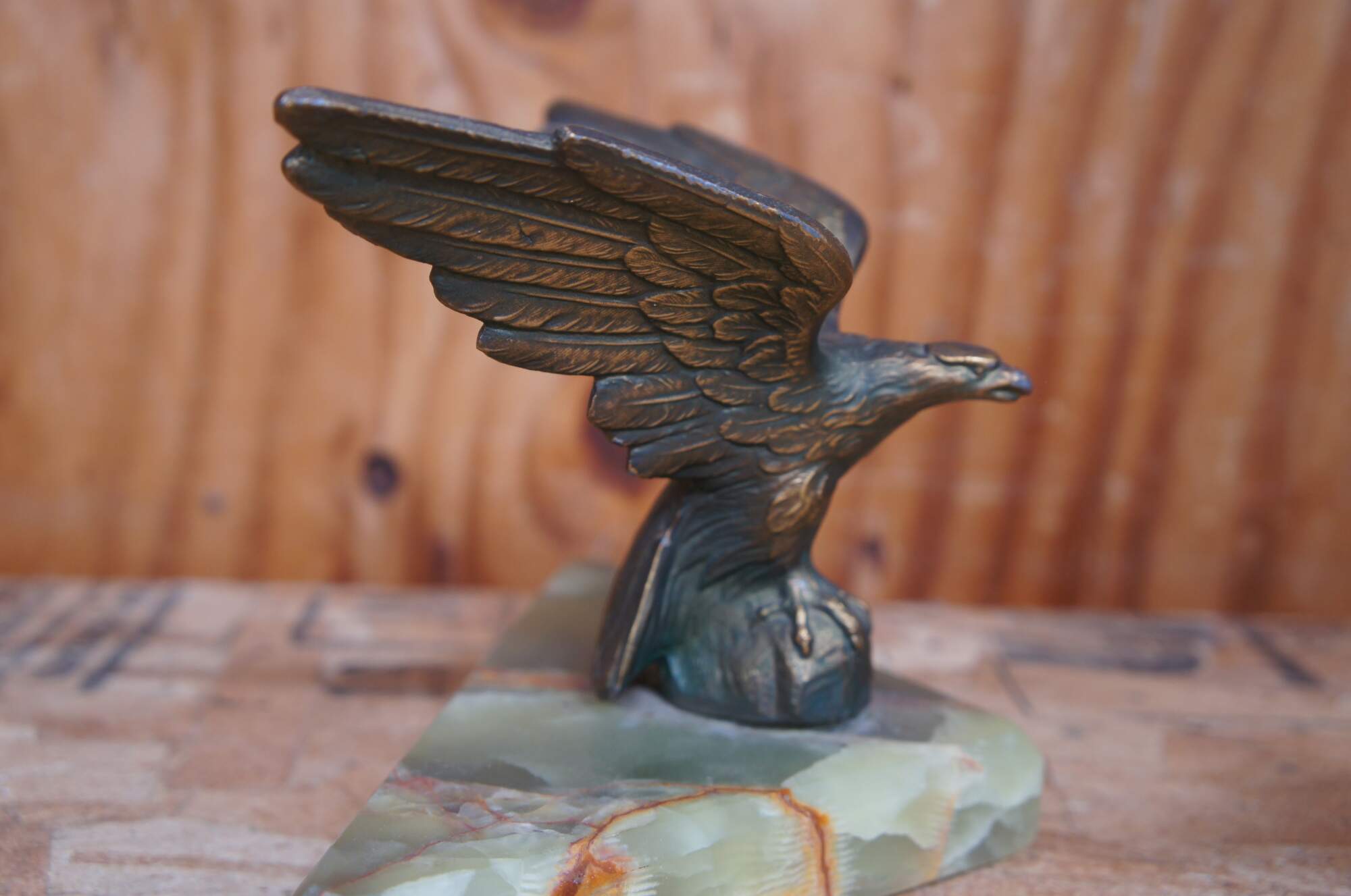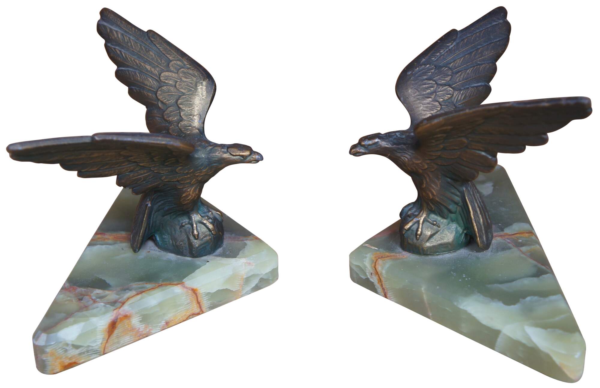 Pair of vintage brass eagle paperweights or bookends mounted on green stone triangular bases.