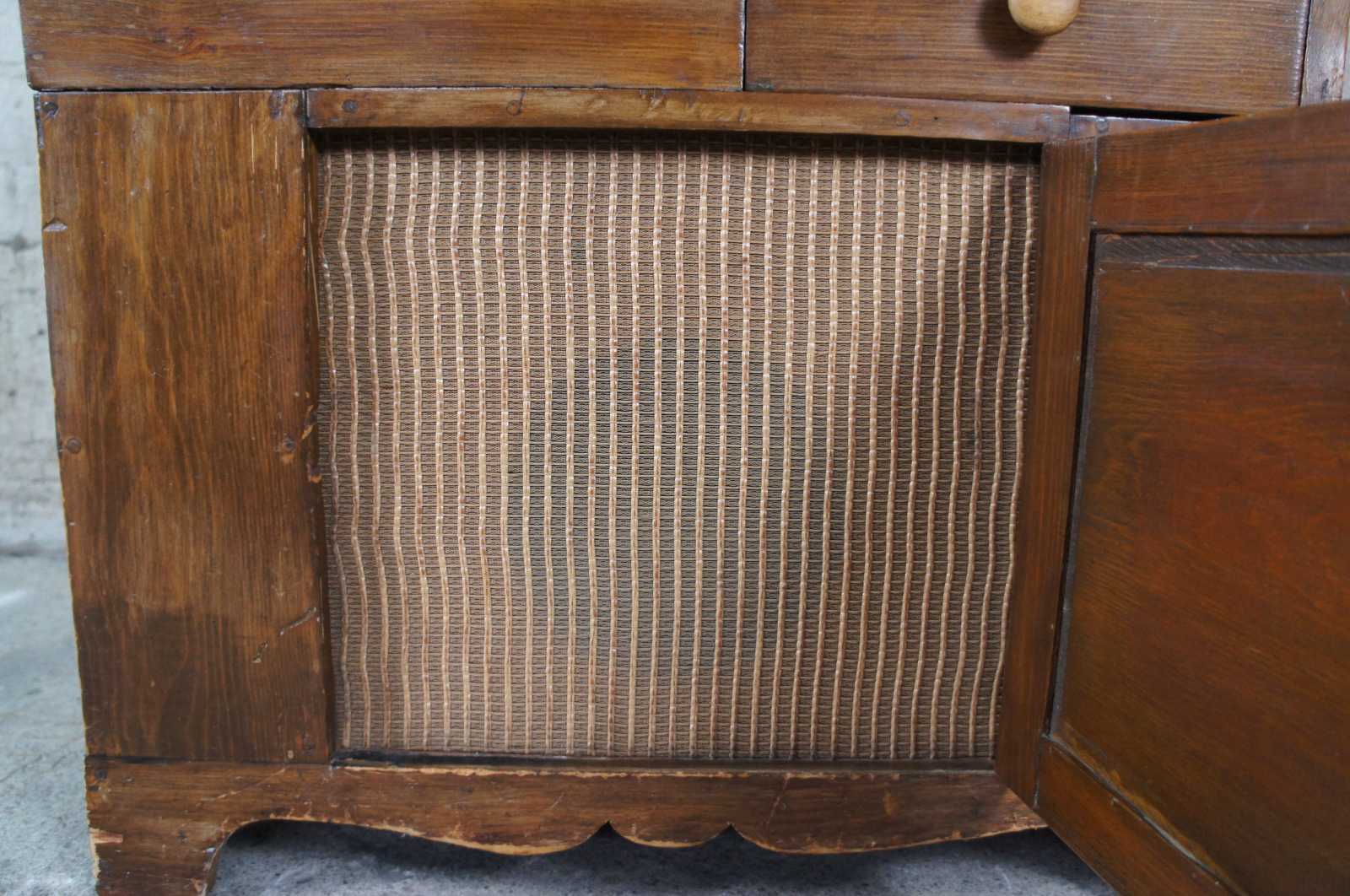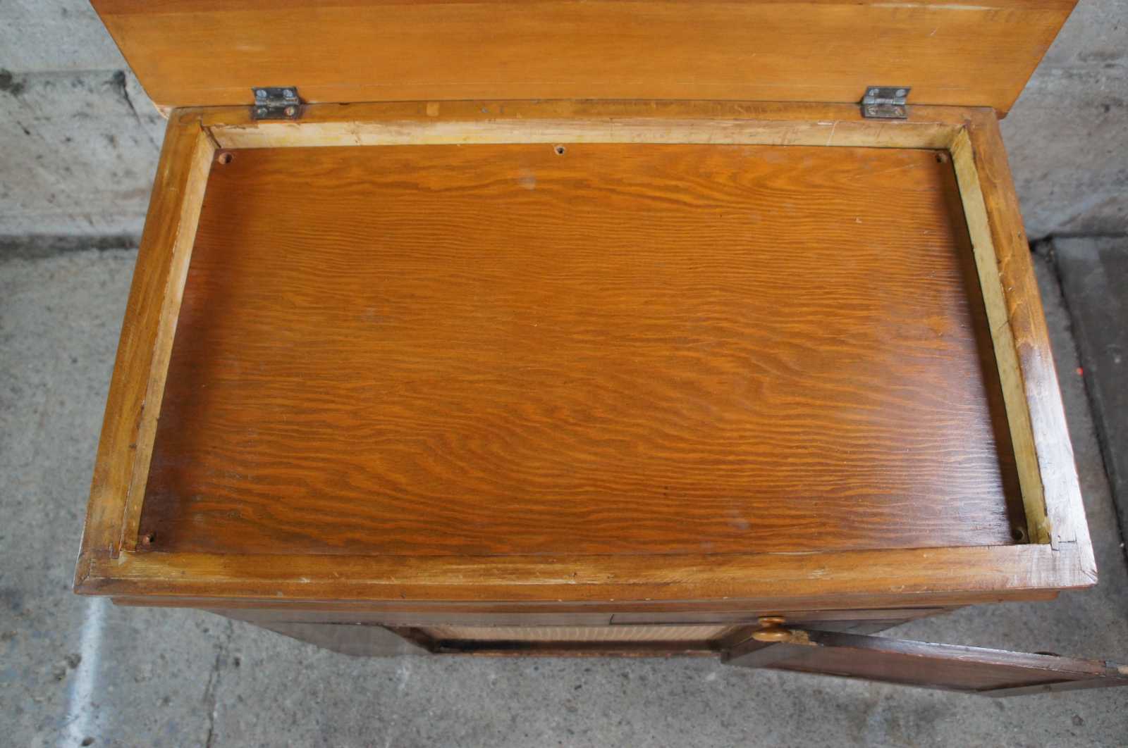 Converted antique dough chest. Made from pine with upper lid and lower cabinet with covered speaker. Rca connectors along the lower side of the bag.