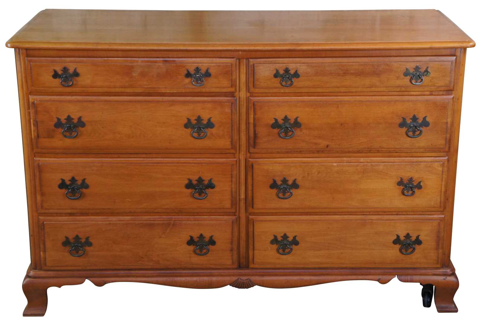 Vintage Kling Olde Orchard Colonial Chippendale mirror top vanity dresser or chest of drawers. Made of maple featuring eight drawers and brass hardware.