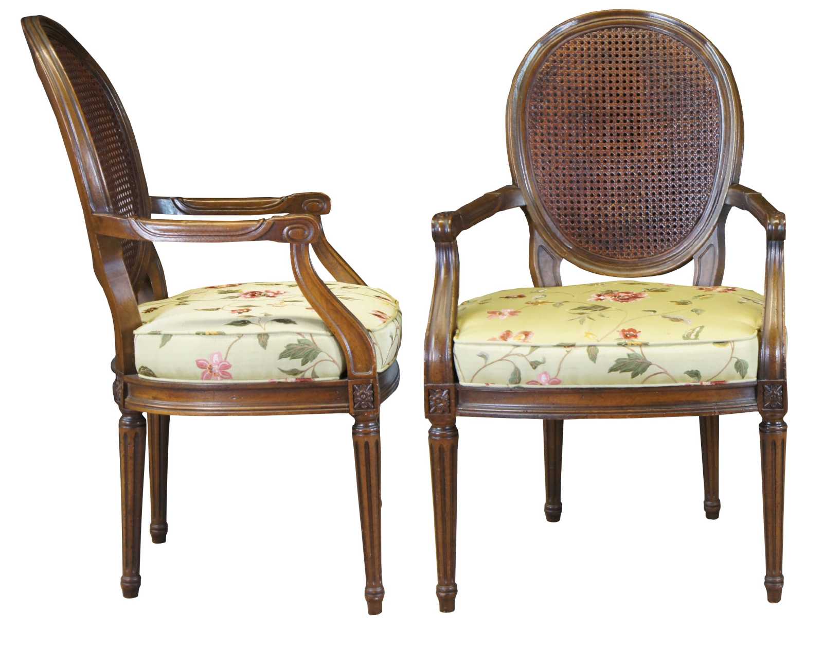 Two vintage French Louis XV armchairs. Made of walnut featuring caned oval balloon backs with a fauteuil style arm, floral / acanthus carved accents, and tapered fluted legs.