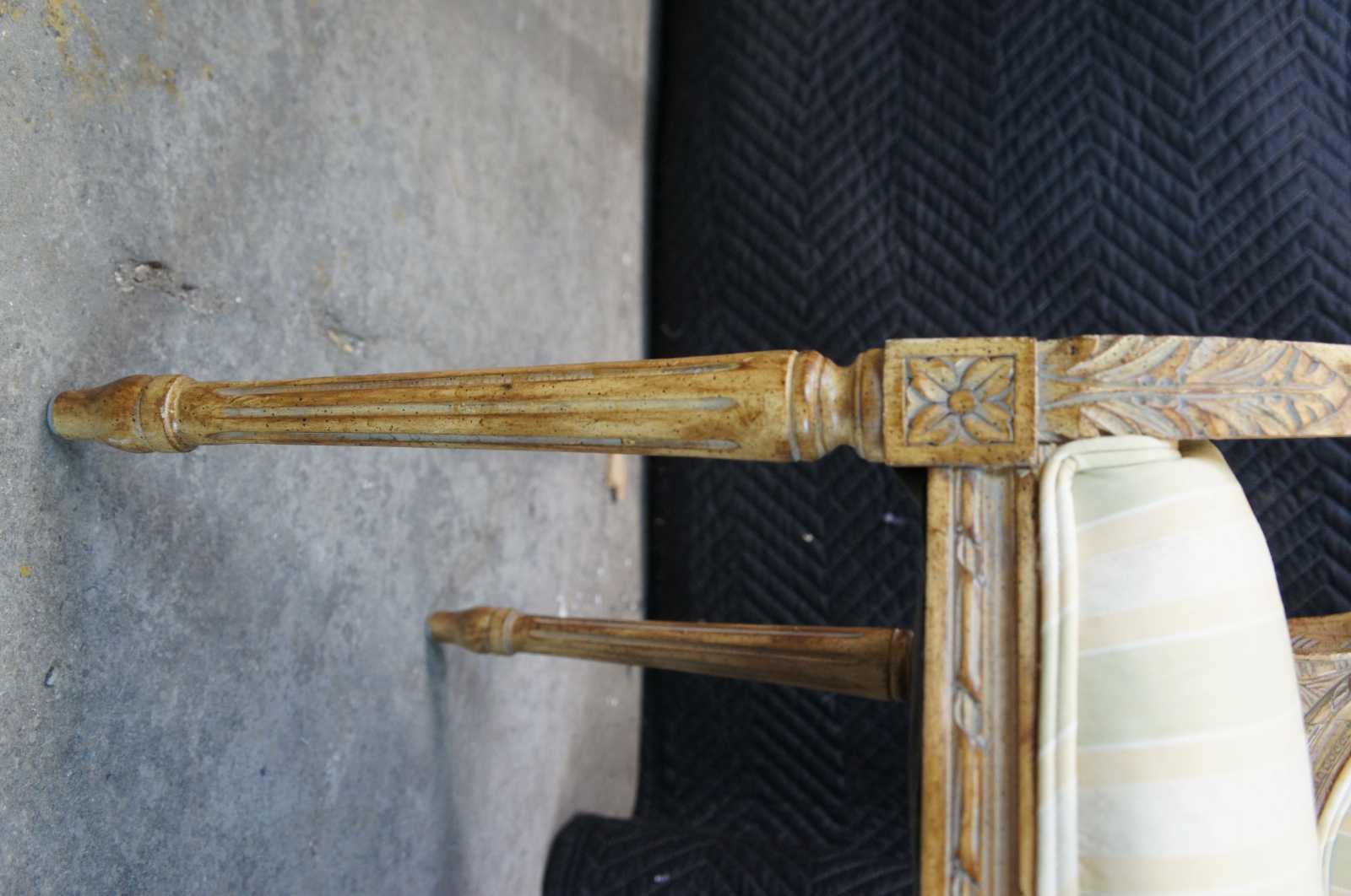 Vintage Louis XVI style fauteuil armchair featuring acanthus carvings, braded and beaded accents with a striped silk fabric. The chair is supported by tapered and fluted legs leading to an arrow foot. Purchased from Norman Miller & Son of Dayton, Ohio. Norman Miller Interiors was a popular store located in the historic Dietz Block building, built in 1886.