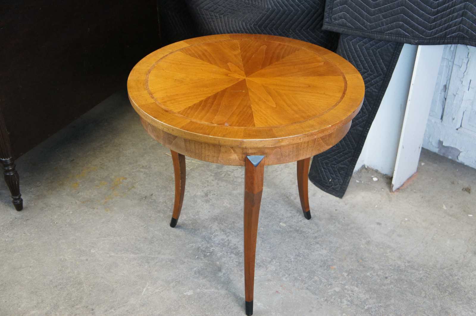 Italian crafted Gueridon table in Biedermeier form, circa last quarter 20th century. Features a round top made from Cherry with matchbook veneer and banding over three saber legs with ebonized trim. Naturally distressed finish. Marked along underside.