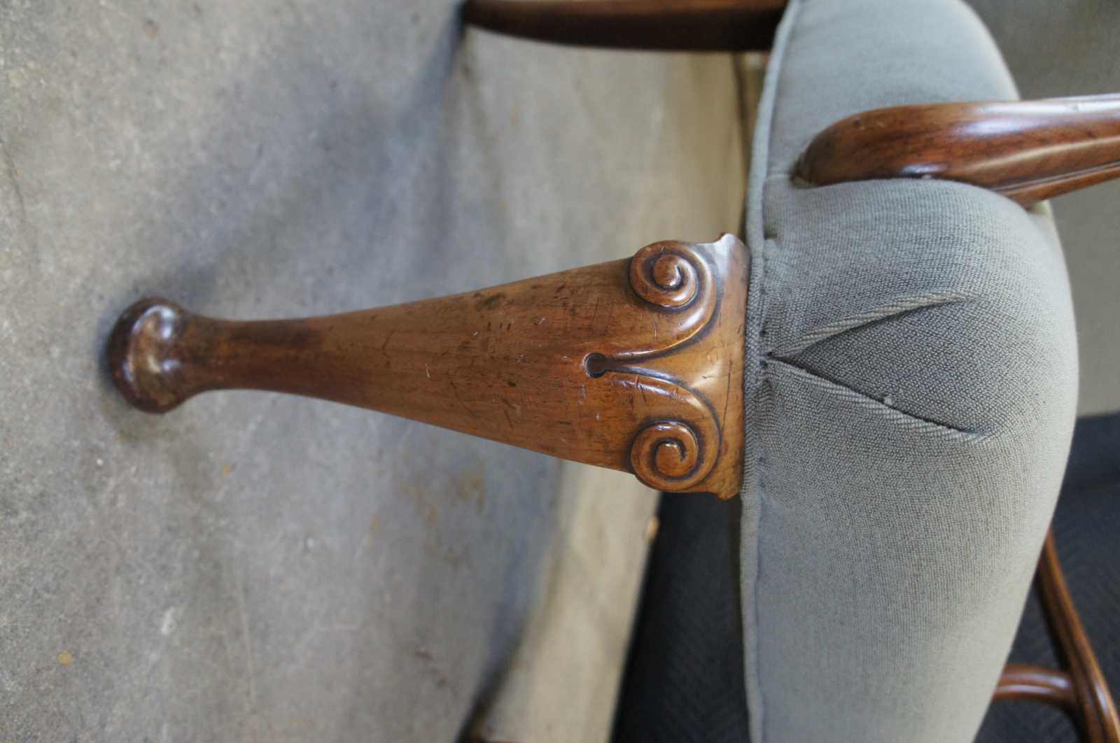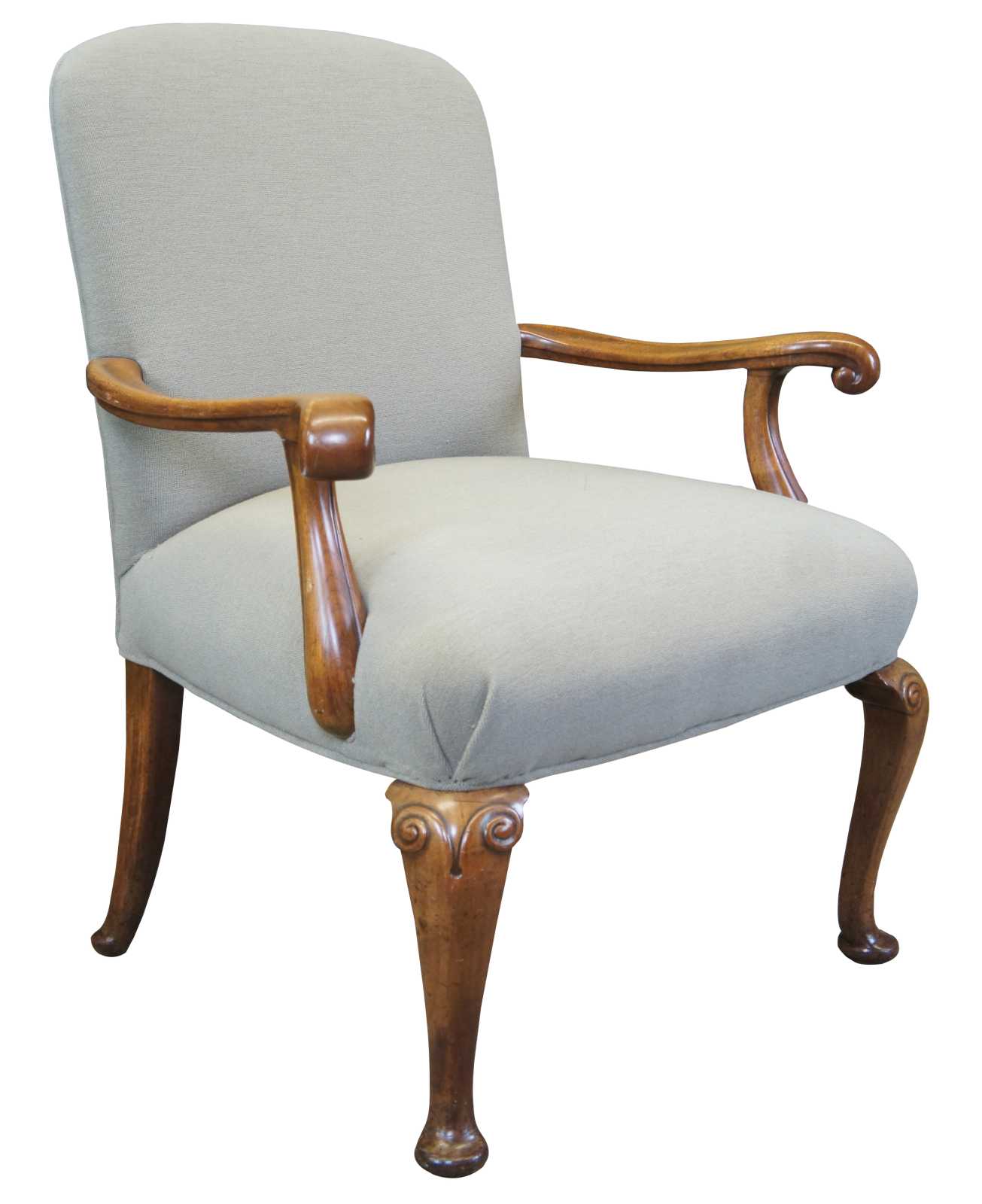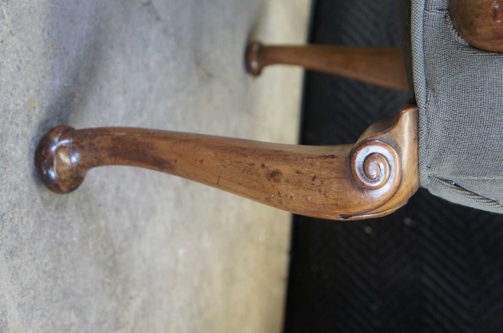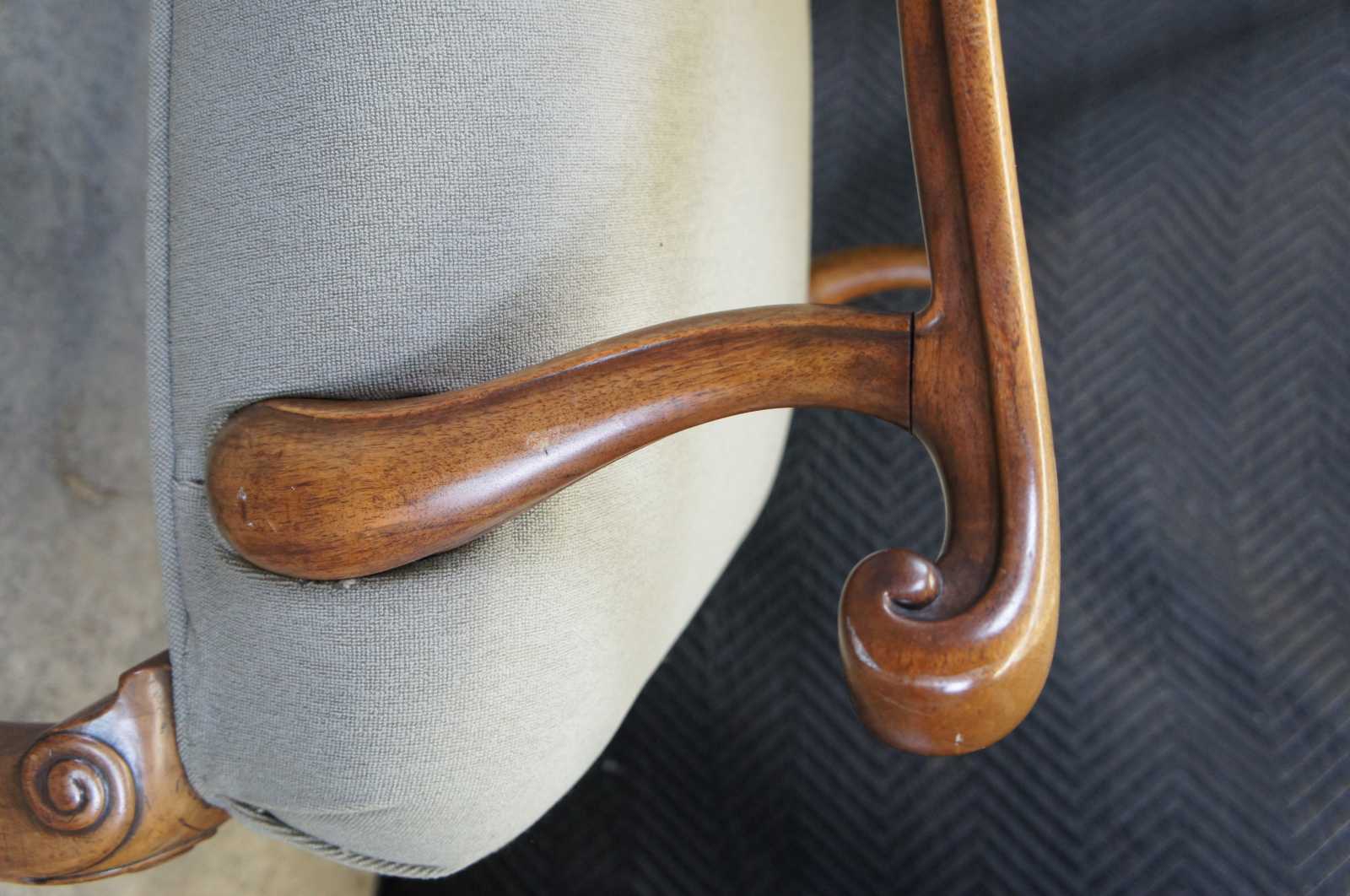 Two vintage French armchairs. Made of mahogany featuring serpentine form with plush upholstered back and seat, and ram carved accents over pad feet.