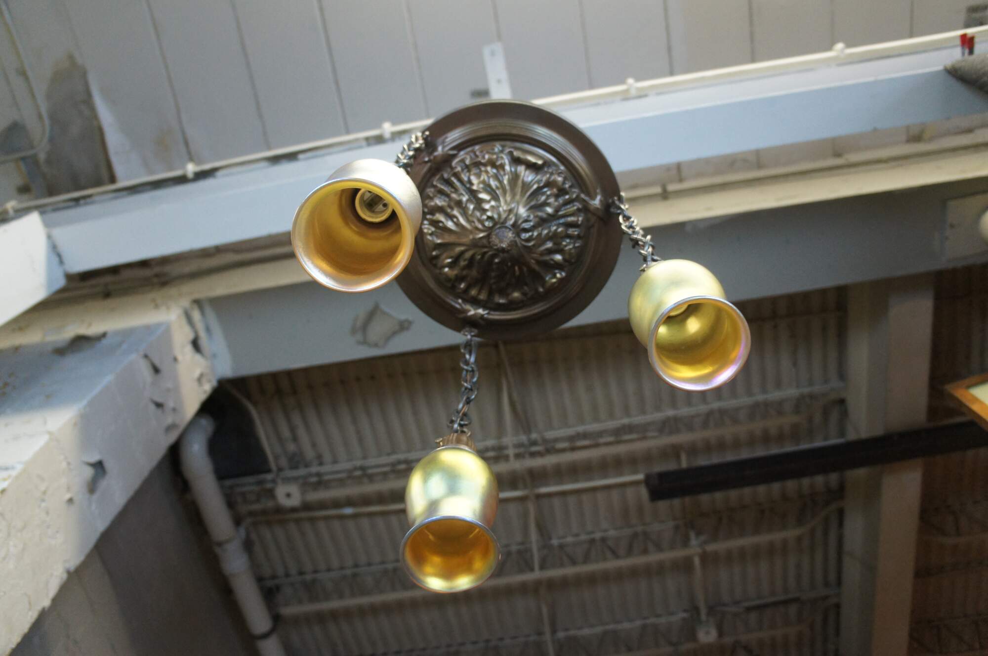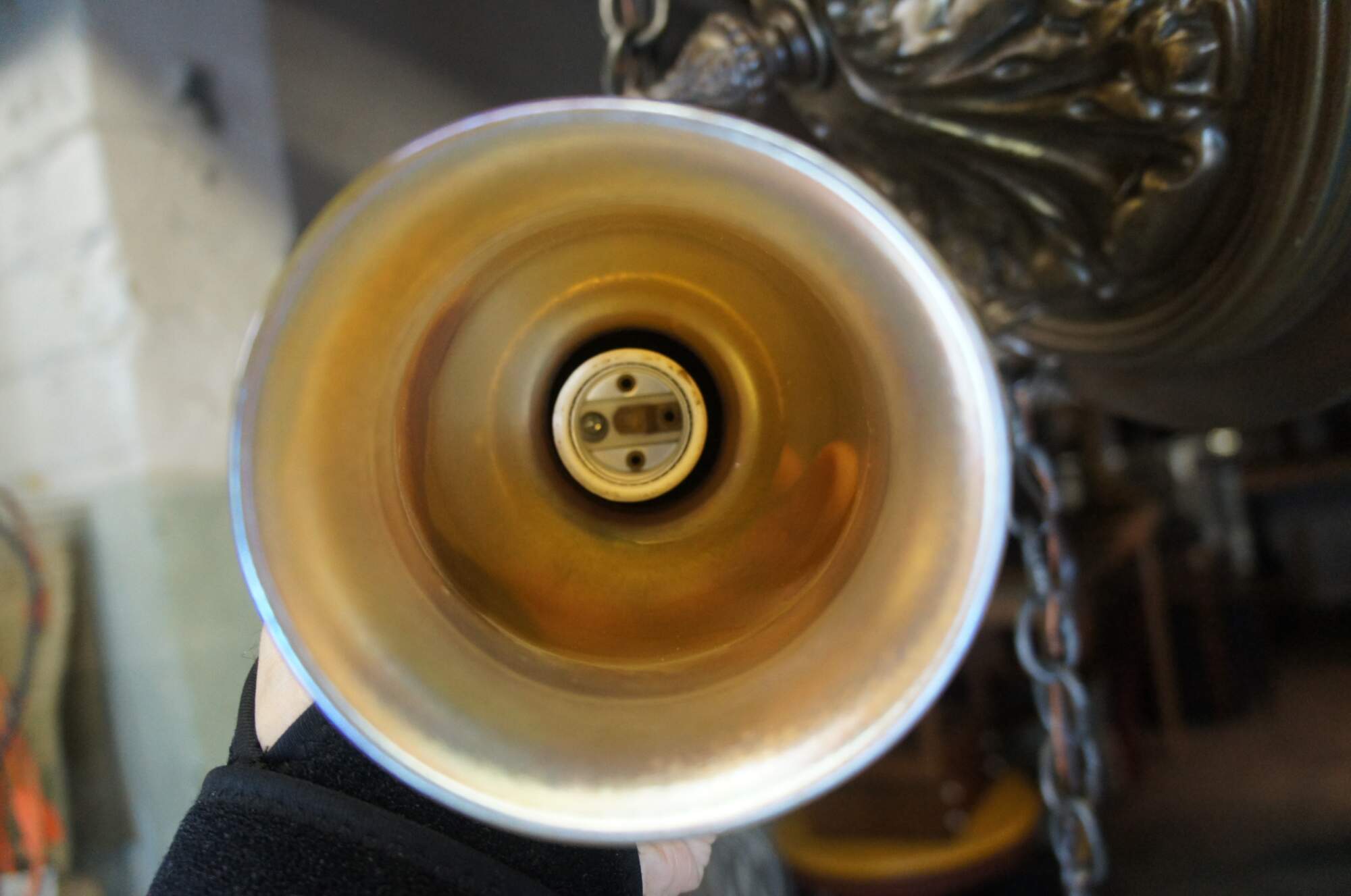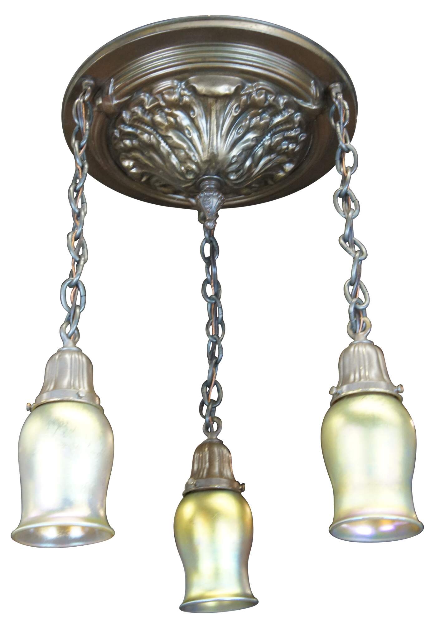 French inspired pendant light with beautiful tulip shades. Features a Louis XV style band around a central acanthus design with drop finial. Each light is connected via a chain