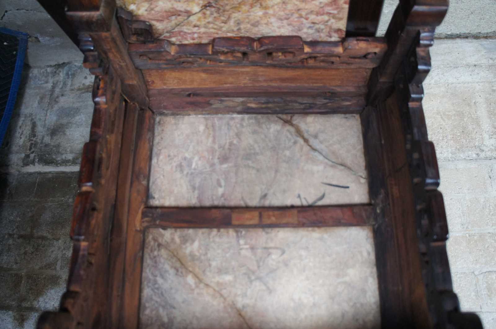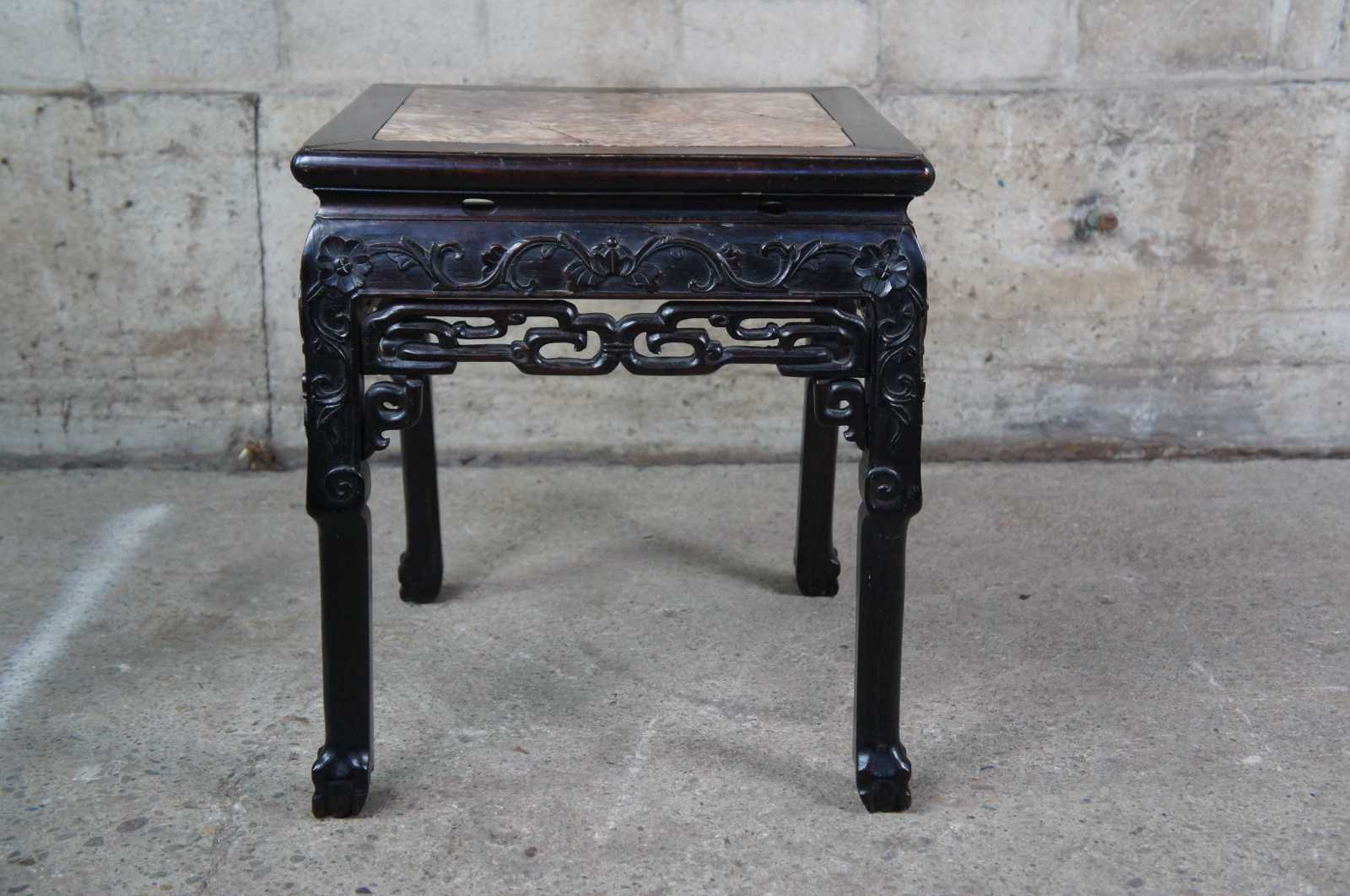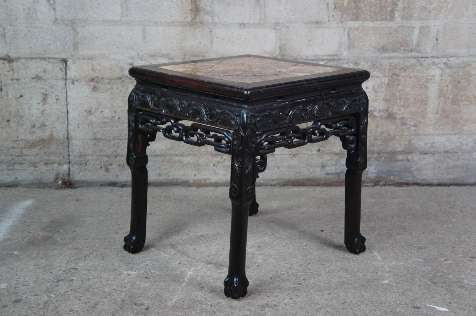 Pair of antique 19th century Chinese tables or plant stands. Made of carved rosewood featuring square form with floral and reticulated designs, pink marble, and ball and claw feet.