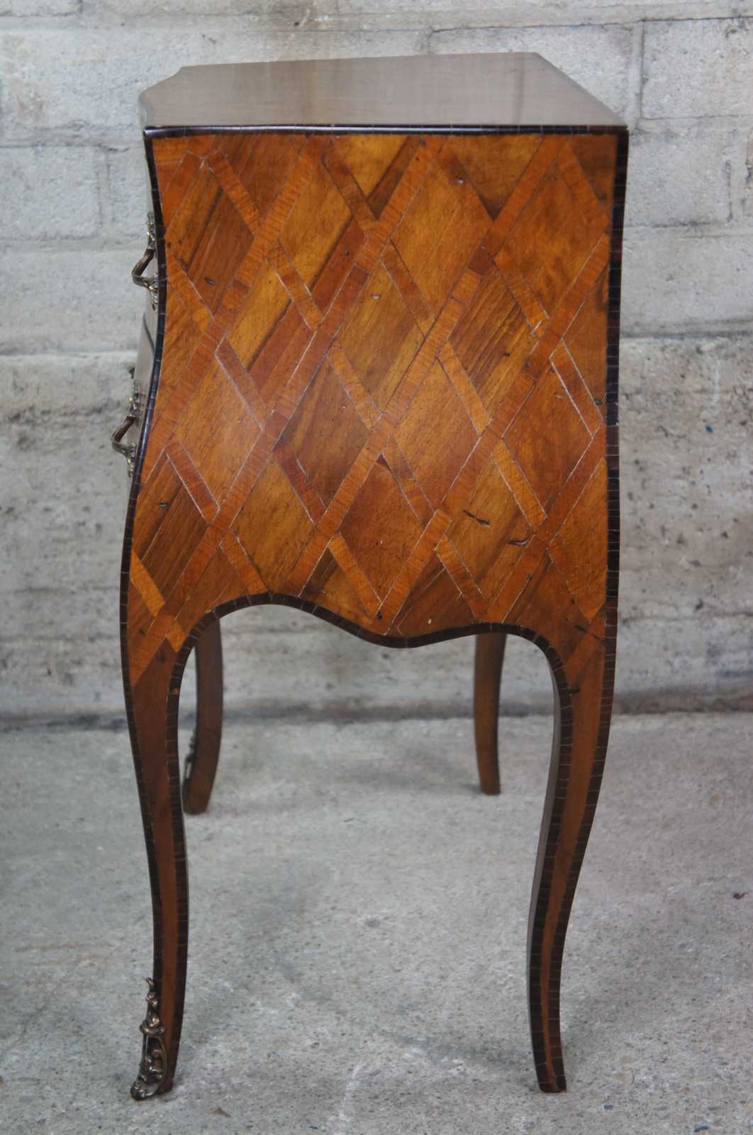 Petite Pair of antique Italian bombe nightstands, circa 1940s. A serpentine form made from walnut with lattice inlaid geometric parquetry design. Features two paper lined drawers, long cabriole legs and ormolu mounts. The chests are perfectly framed with an ebonized trim. Inspired by the Louis XV & Neoclassical designs. Great for use as bedside, end or occasional tables.