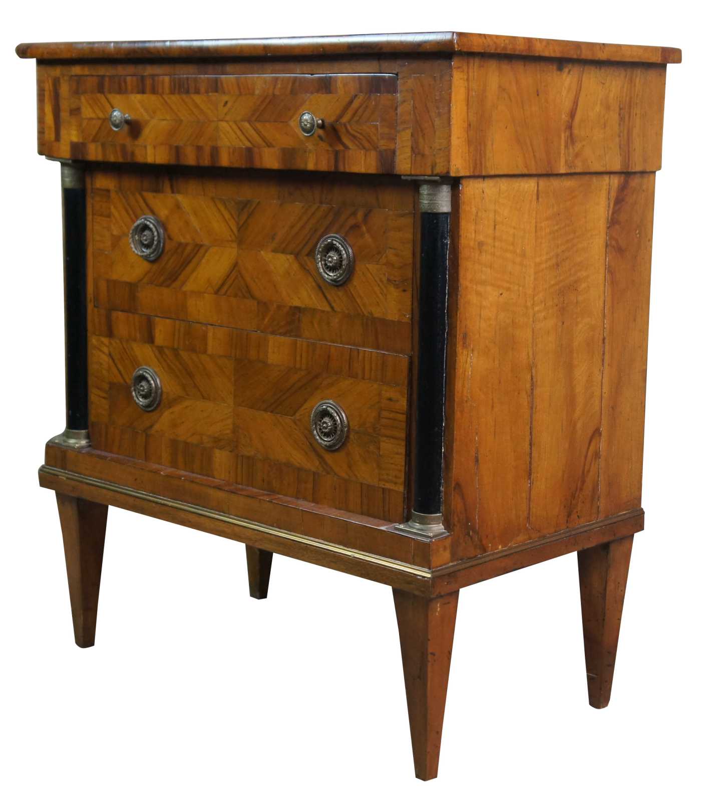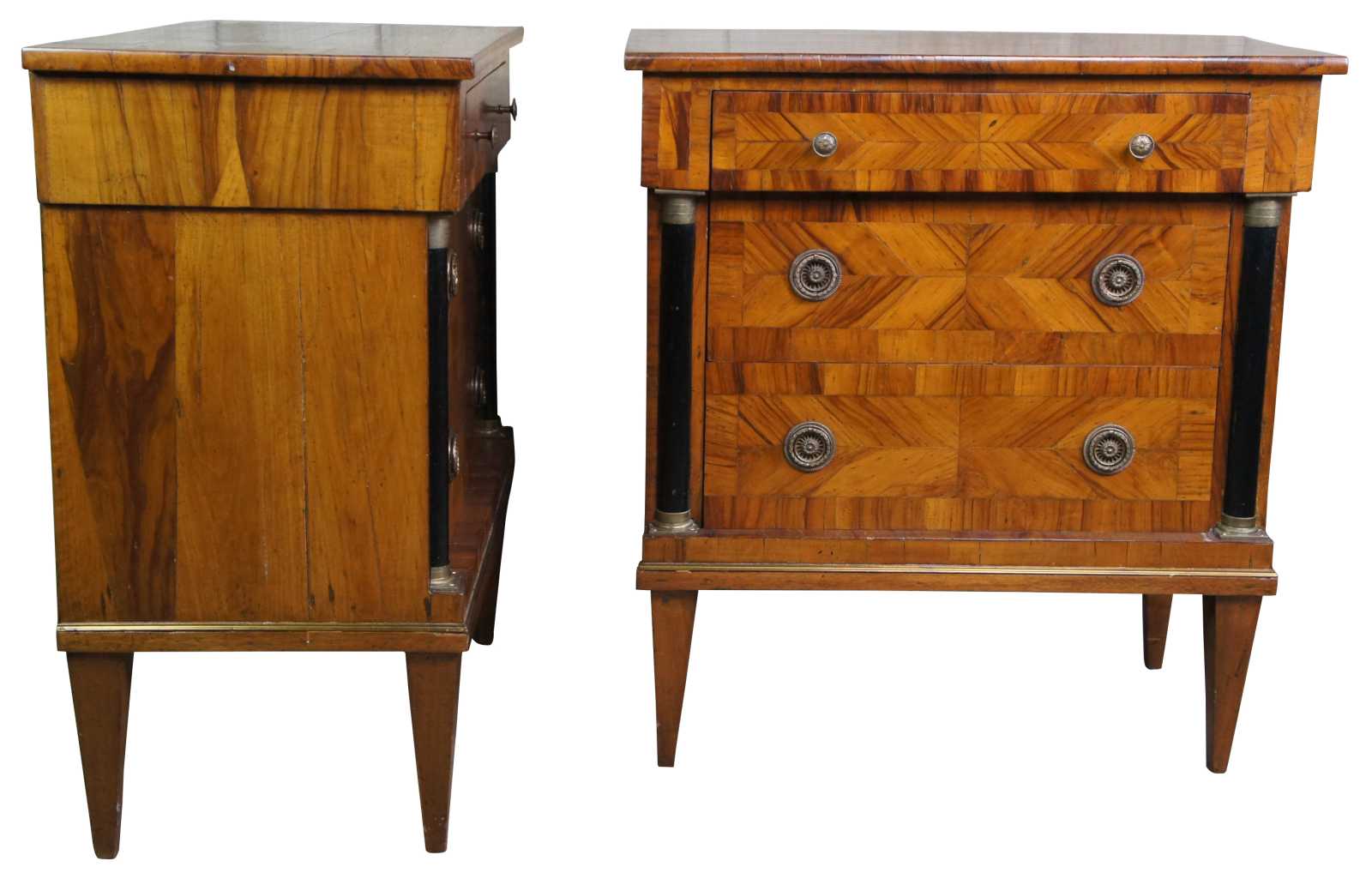 Pair of antique Italian Empire nighstands or side tables. Made of olive wood featuring matchbook veneer, quartered ebonized columns with brass capitals and neoclassical drawer pulls. The chests are supported by square tapered legs.