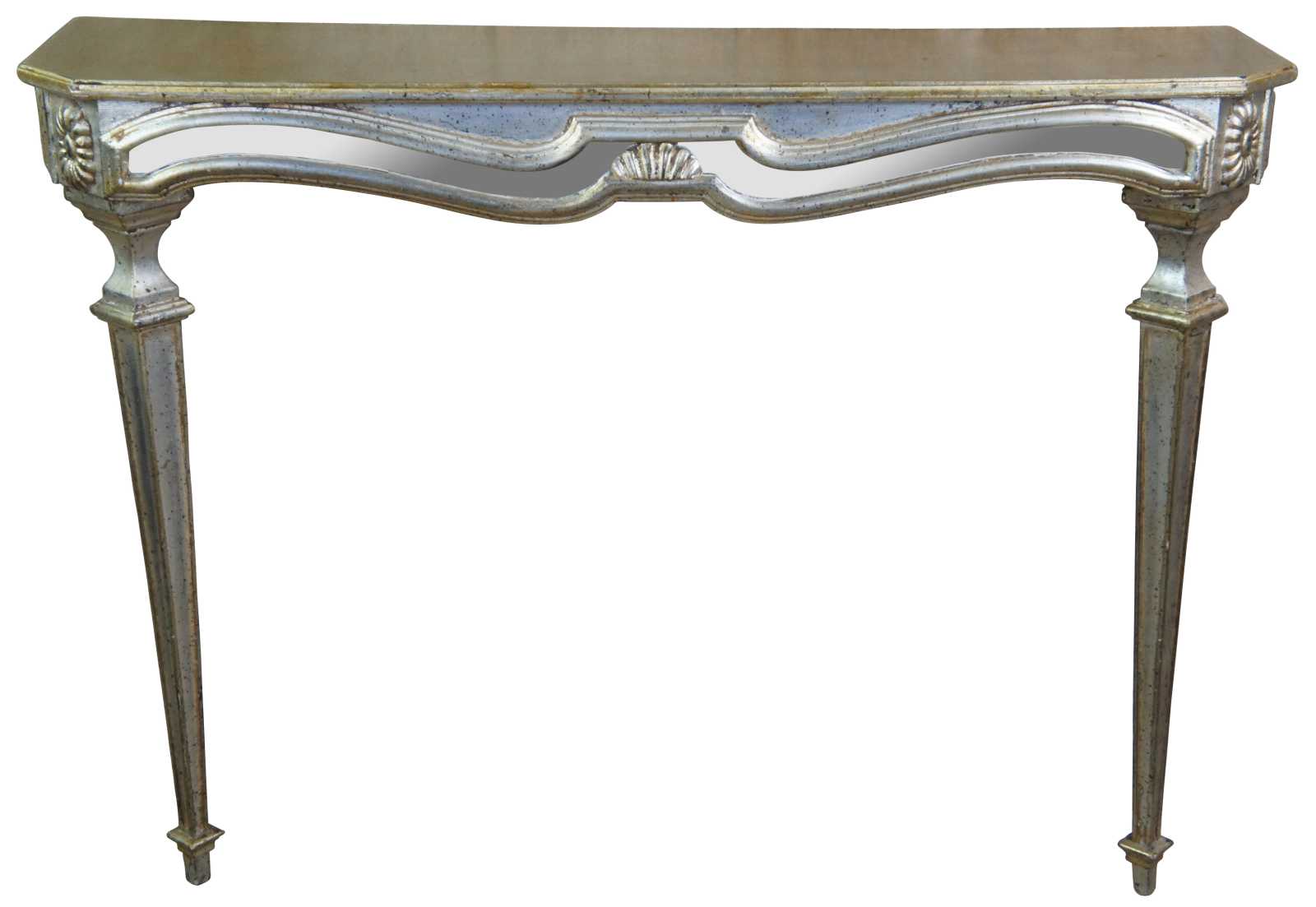 Vintage mirrored wall mount entry console table feauring low profile with distressed silver and champagne finish. Made in Italy.